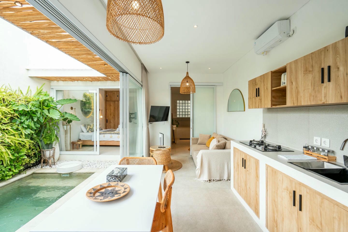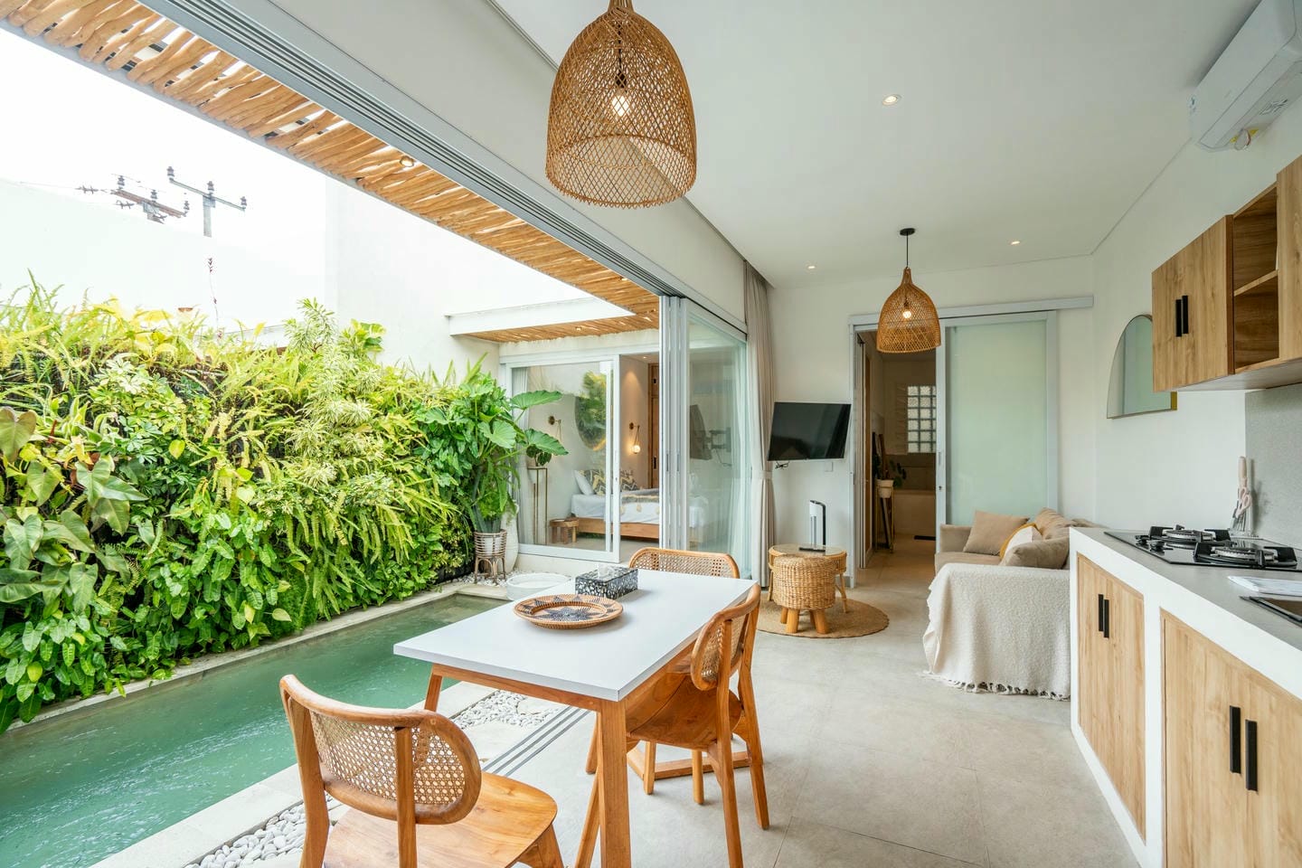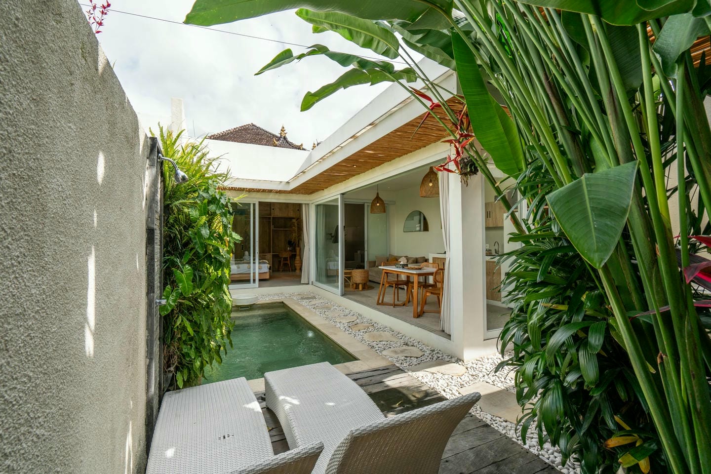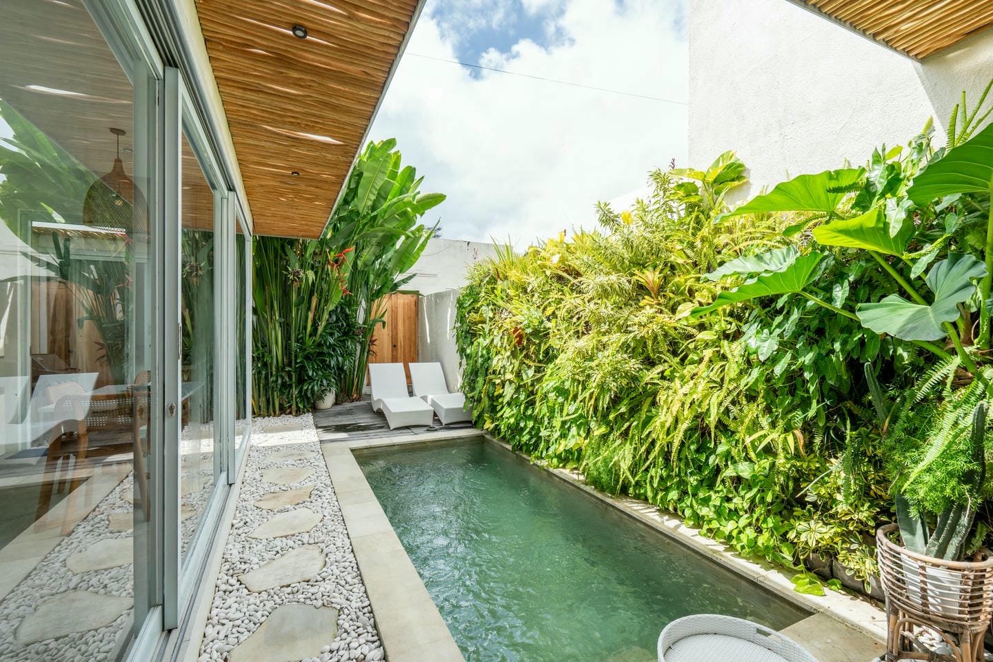 Step into the outdoor area, where you’ll find a private swimming pool, comfortable lounge chairs, an outdoor shower, and a beautiful wall adorned with tropical plants. This space is perfect for relaxing and enjoying your day in complete serenity.