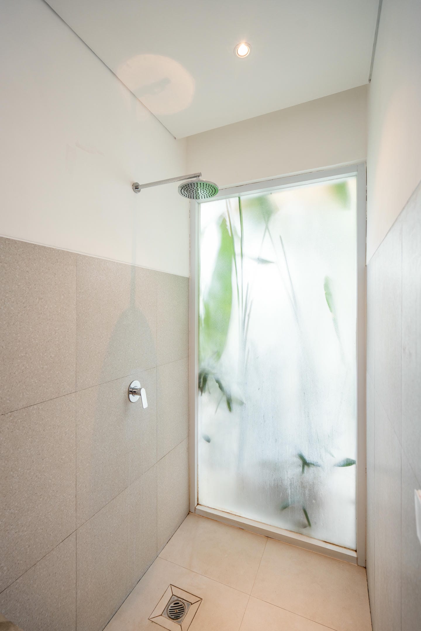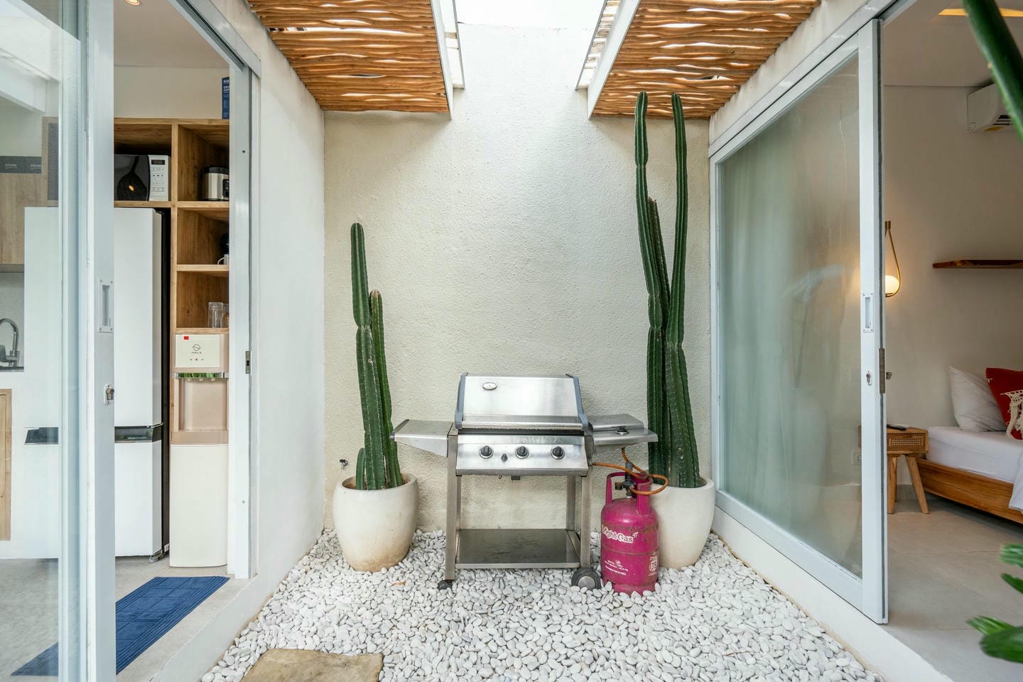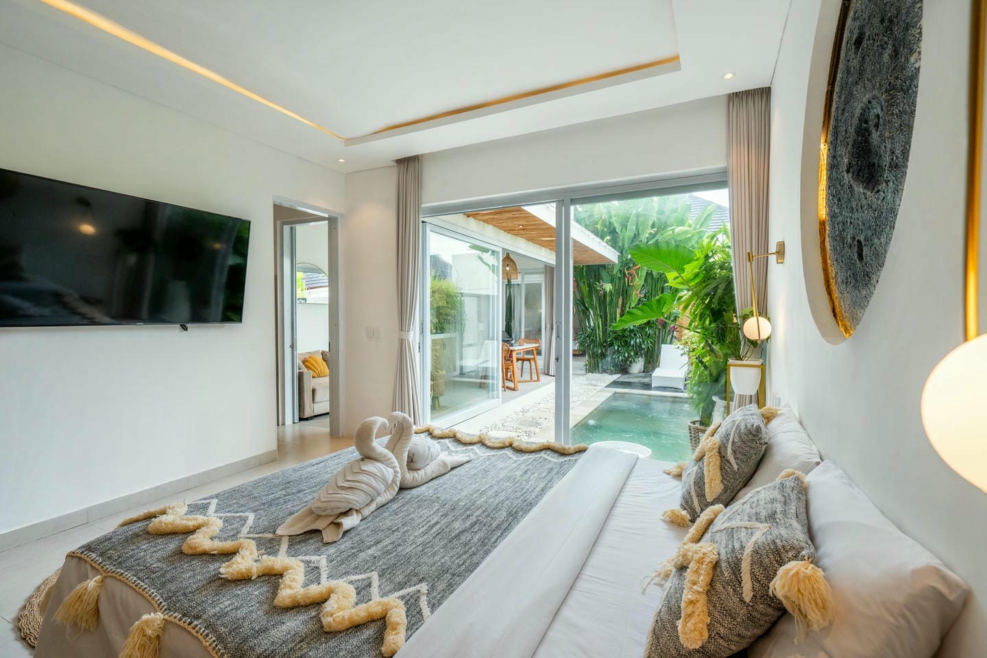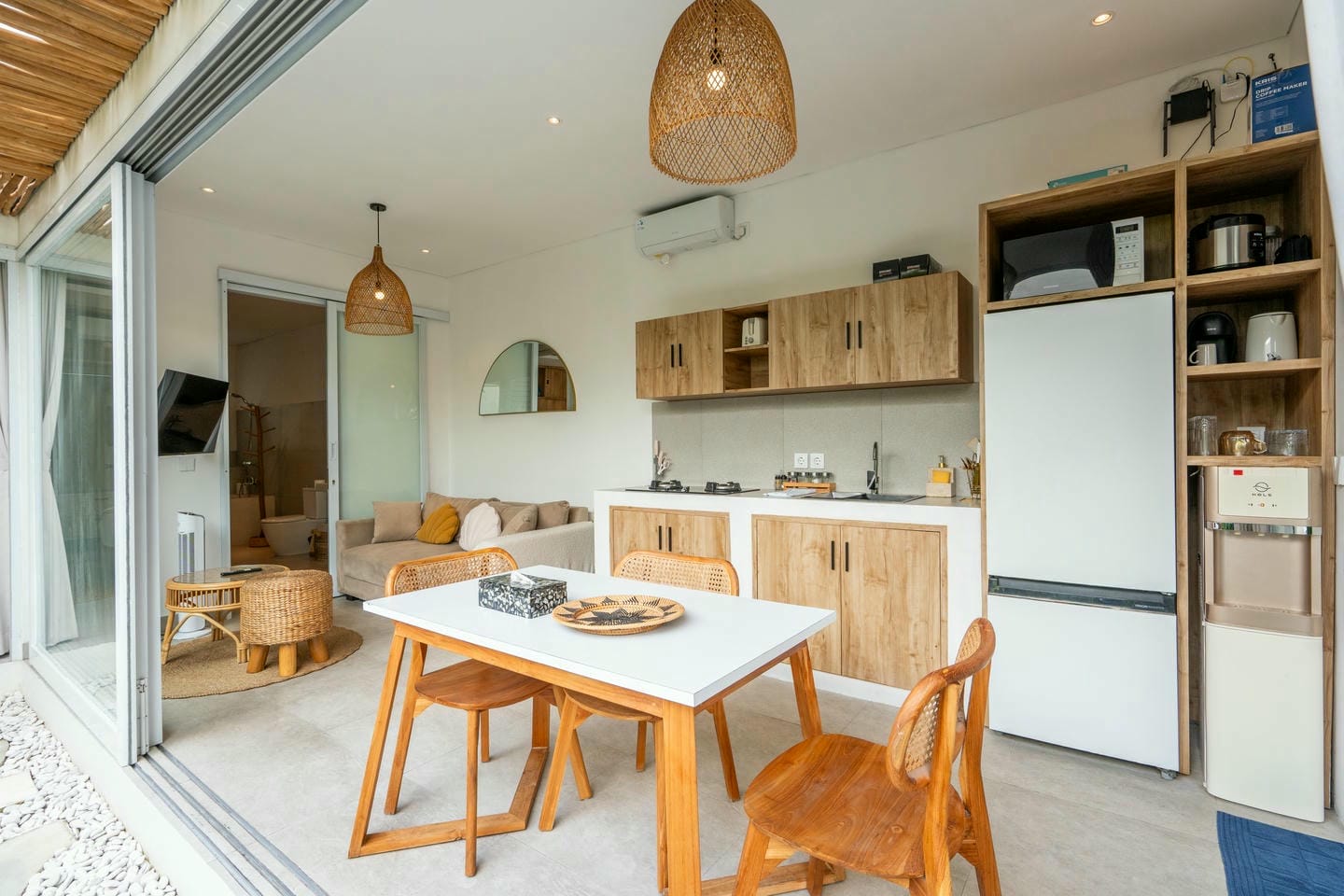 Step into the outdoor area, where you’ll find a private swimming pool, comfortable lounge chairs, an outdoor shower, and a beautiful wall adorned with tropical plants. This space is perfect for relaxing and enjoying your day in complete serenity.