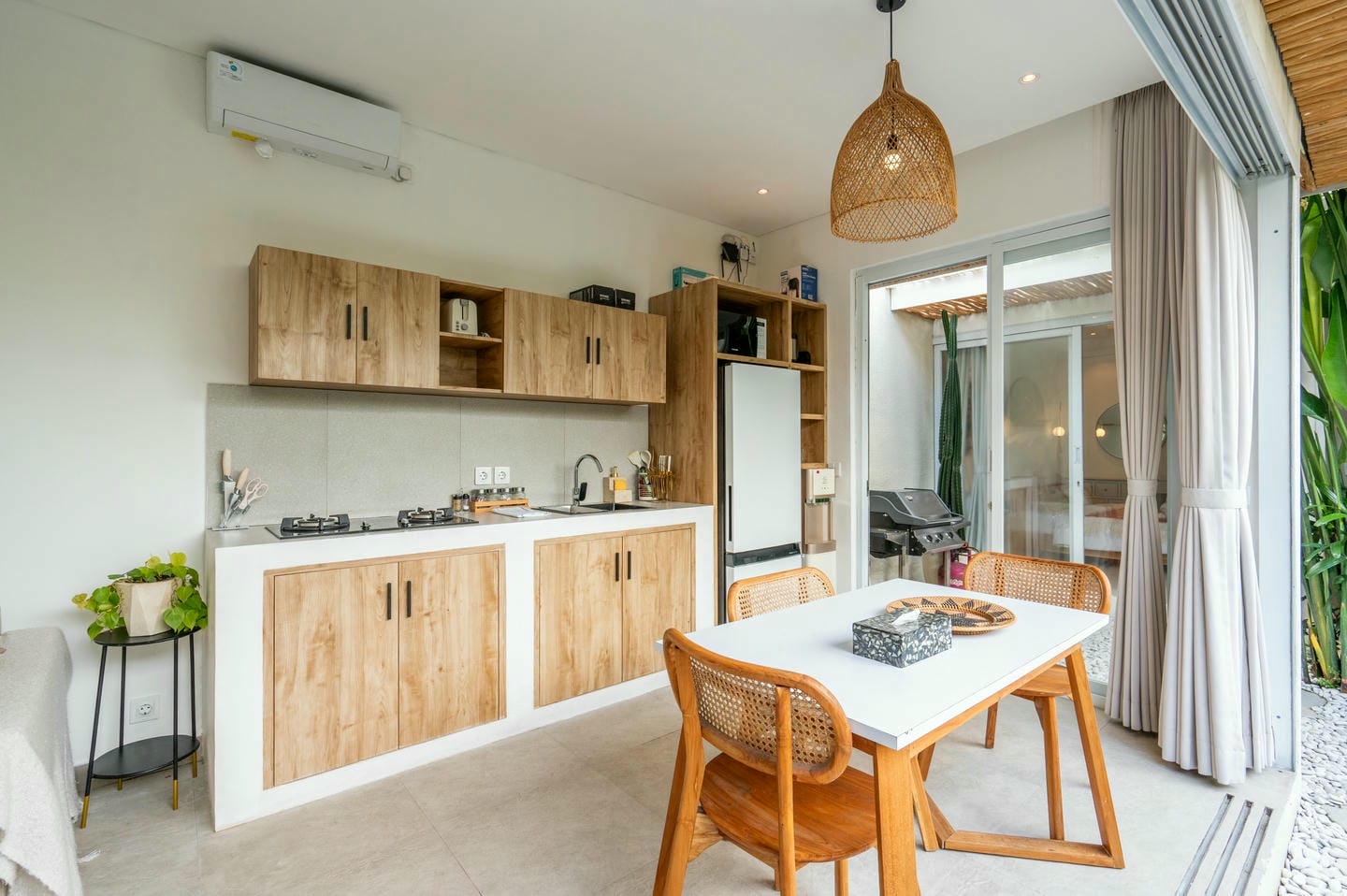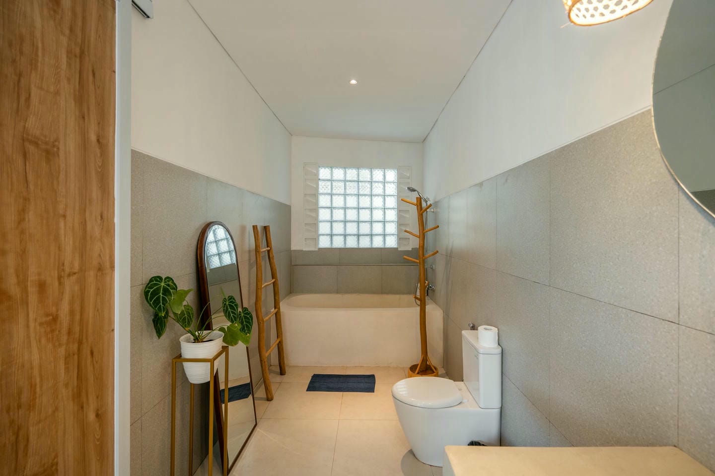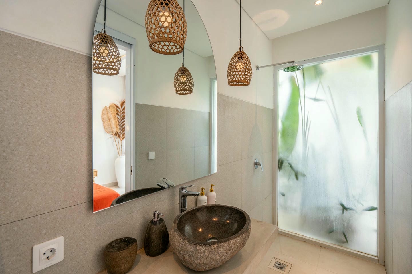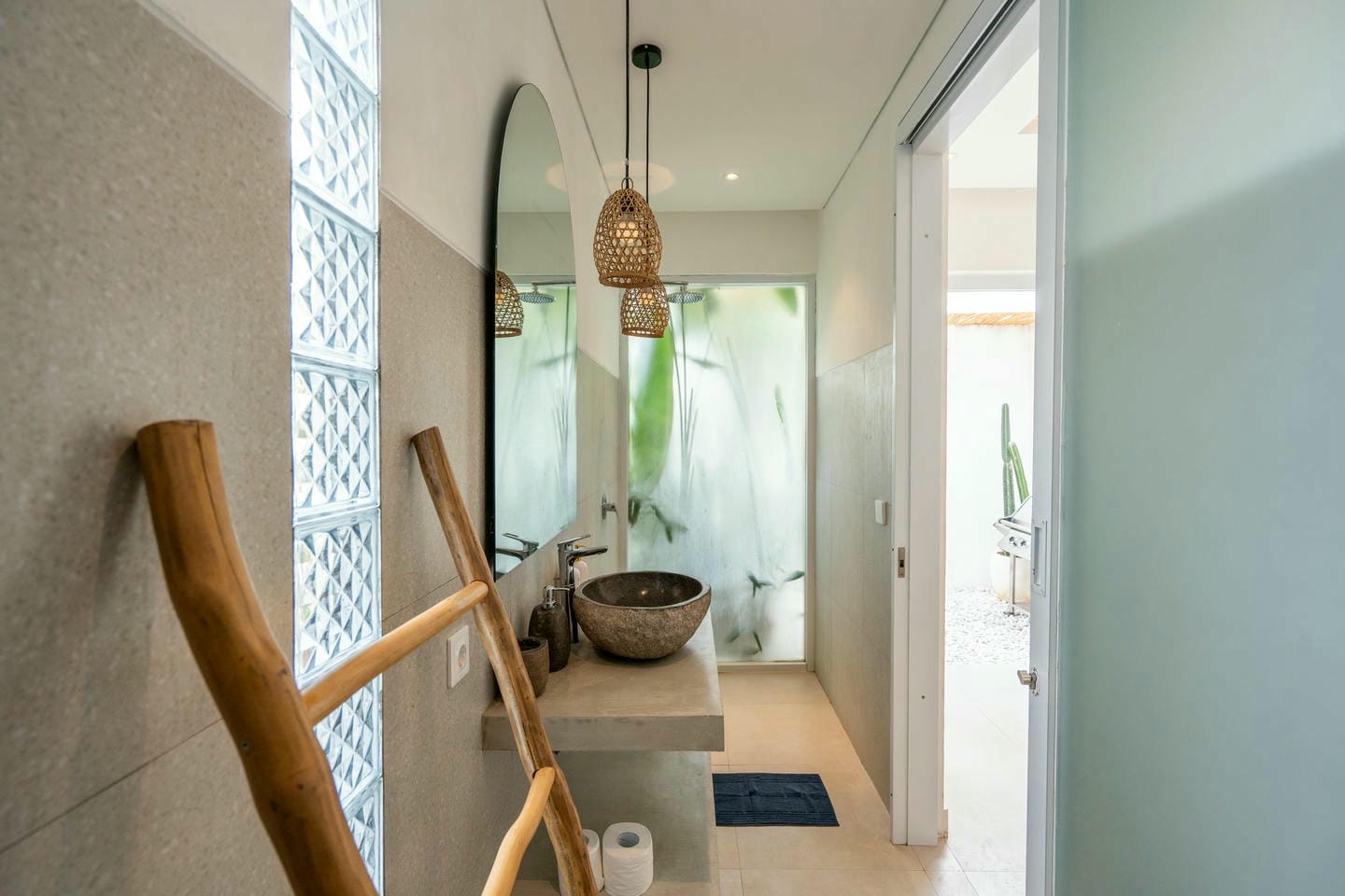 Step into the outdoor area, where you’ll find a private swimming pool, comfortable lounge chairs, an outdoor shower, and a beautiful wall adorned with tropical plants. This space is perfect for relaxing and enjoying your day in complete serenity.