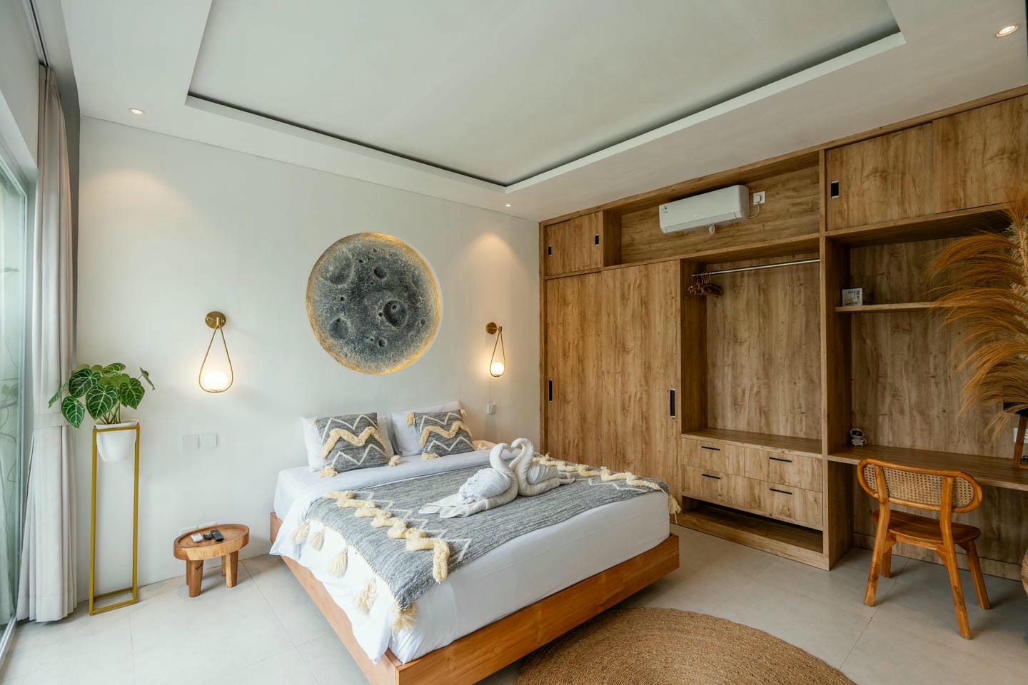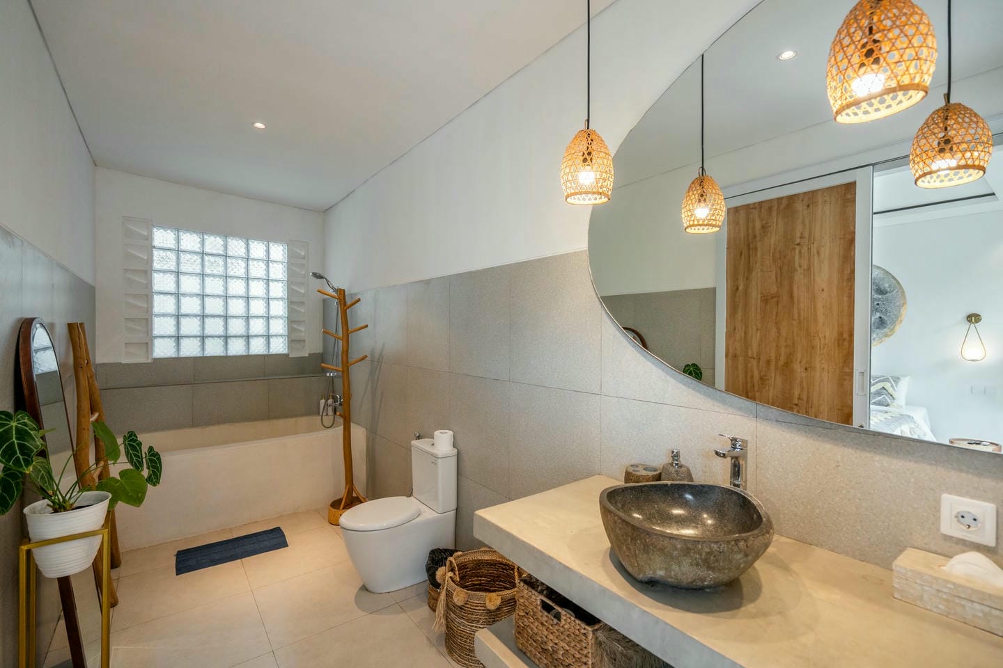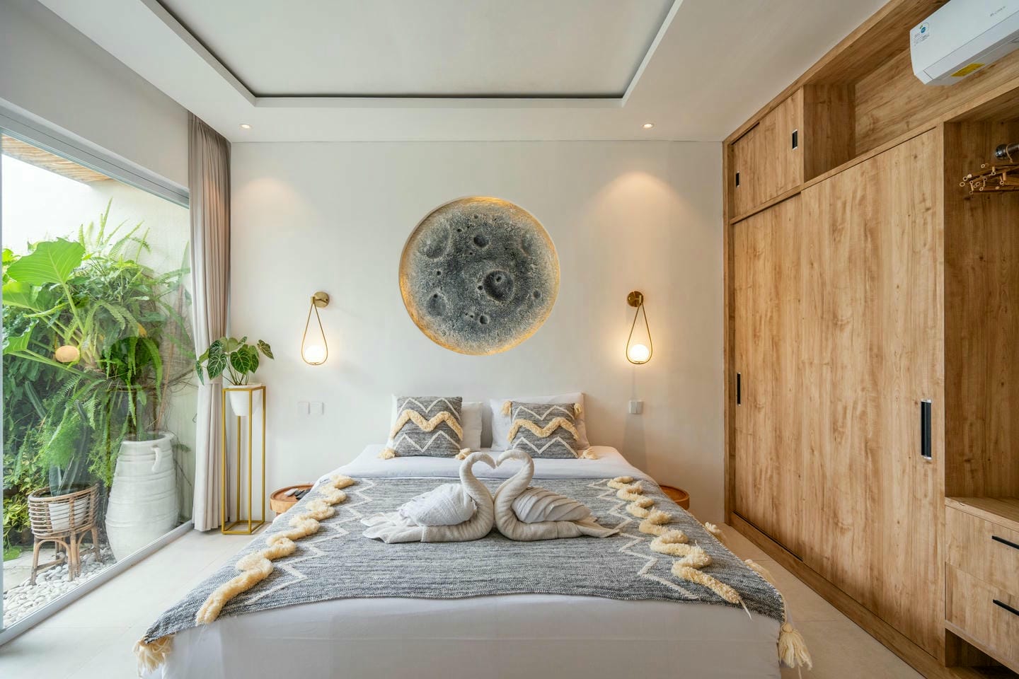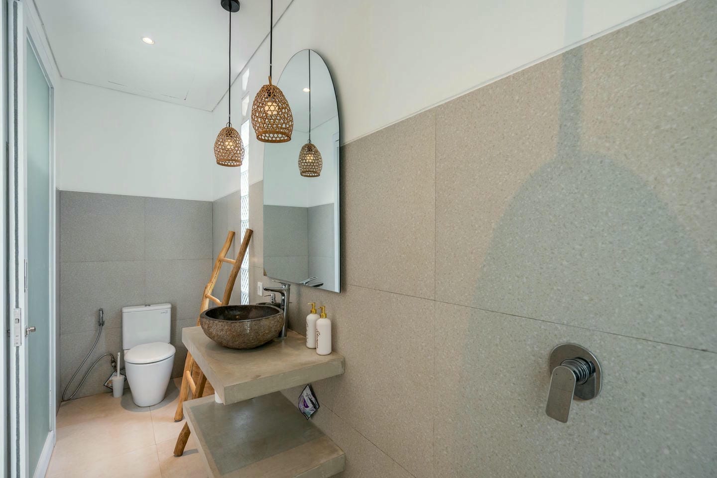 Step into the outdoor area, where you’ll find a private swimming pool, comfortable lounge chairs, an outdoor shower, and a beautiful wall adorned with tropical plants. This space is perfect for relaxing and enjoying your day in complete serenity.