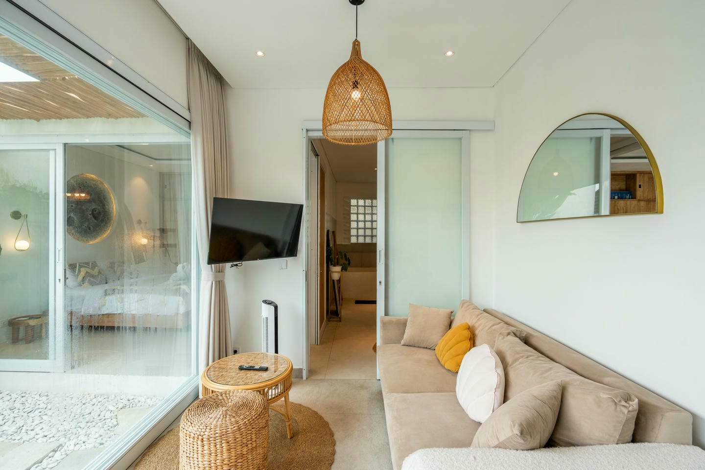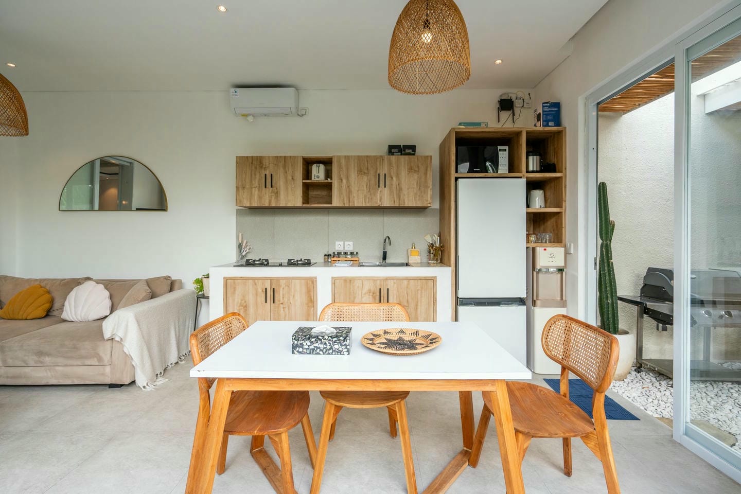 This fully furnished villa features an open‐concept design with large sliding glass doors that allow abundant natural light and provide direct access to the outdoor area. The living space flows seamlessly into a well-equipped kitchen and dining area, creating a comfortable and inviting atmosphere. The villa offers two bedrooms, each with its own ensuite bathroom for added privacy and convenience.