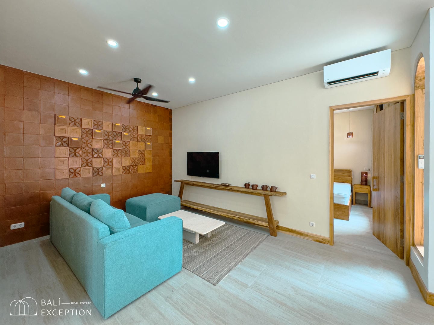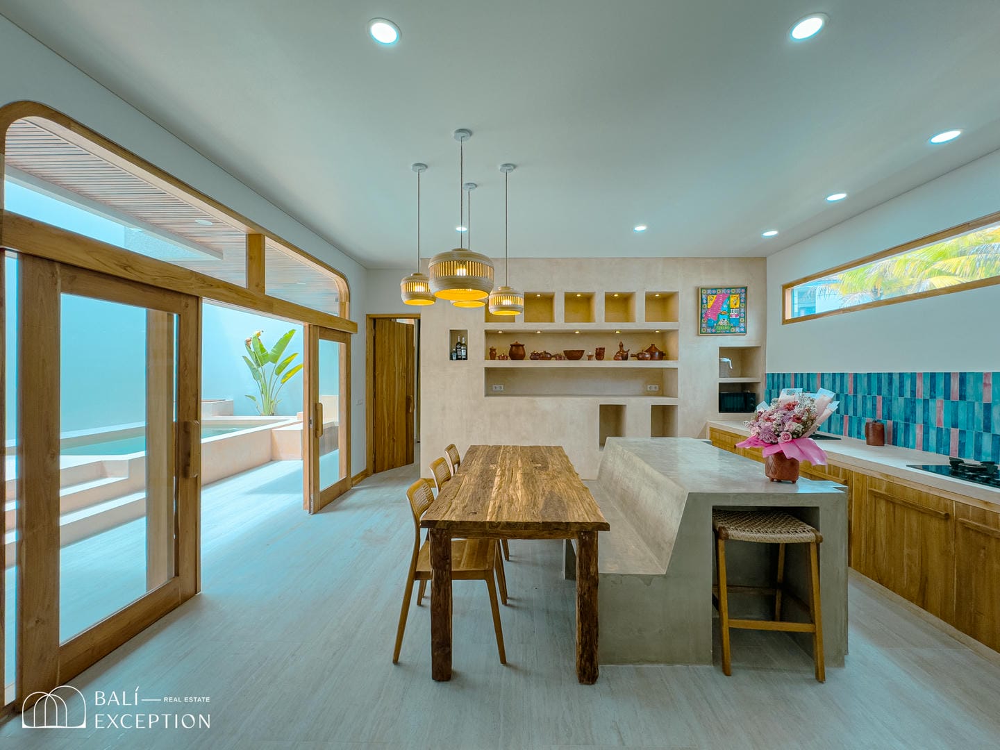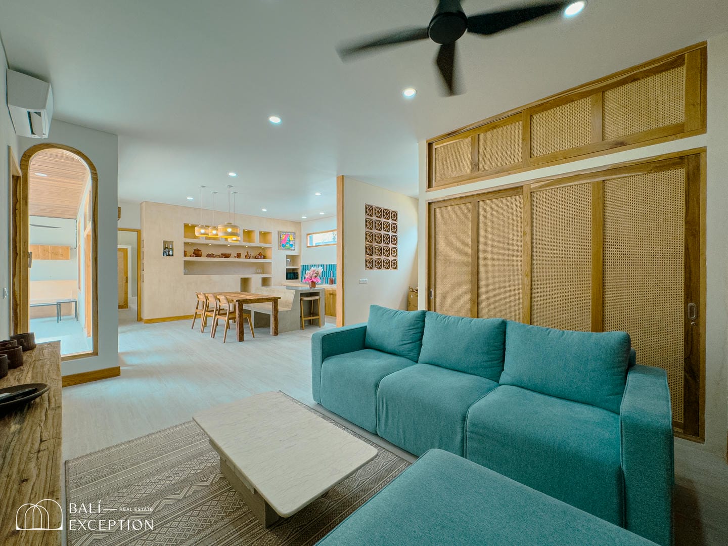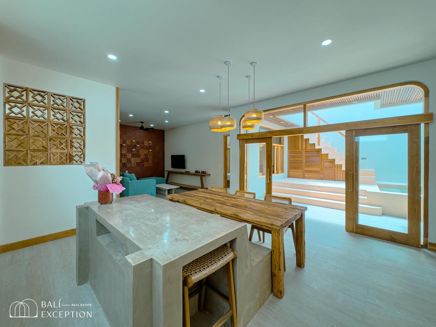 Step into this beautifully designed villa, where modern Mediterranean style meets warm tropical charm. Large windows allow abundant natural light to fill the space, enhancing the bright and airy atmosphere. The kitchen comes fully equipped and is complemented by a solid wooden dining table that adds warmth and character to the room. The spacious living and dining area features thoughtfully crafted wooden furniture, creating a comfortable and inviting setting for everyday living. This villa offers two bedrooms, each