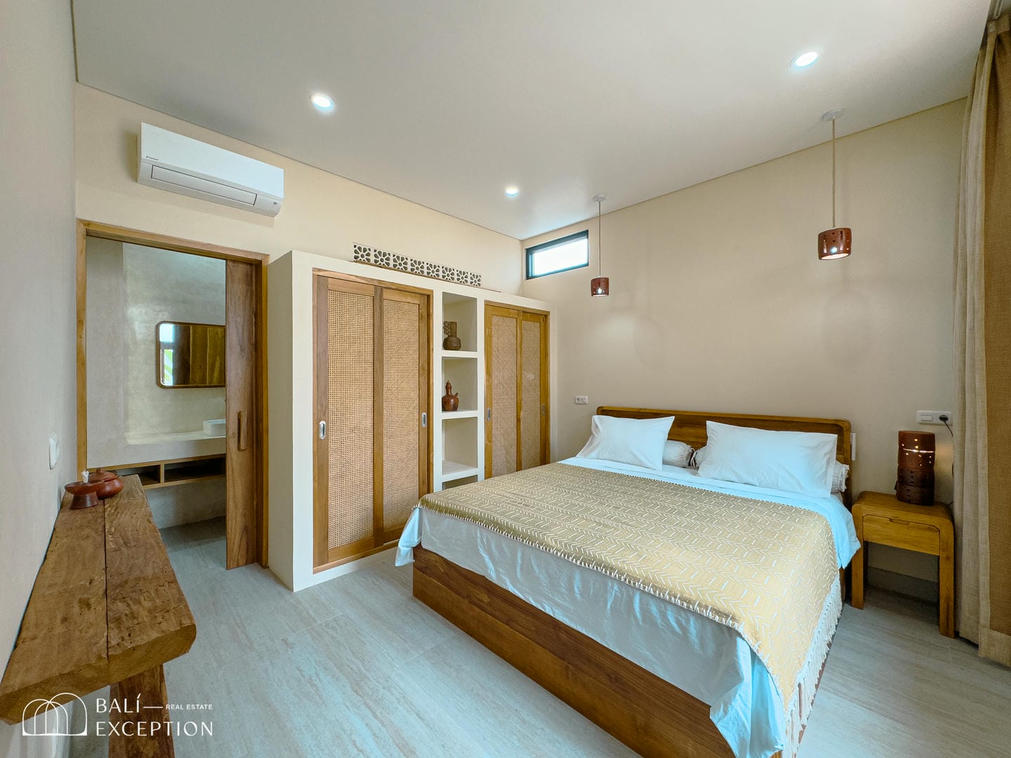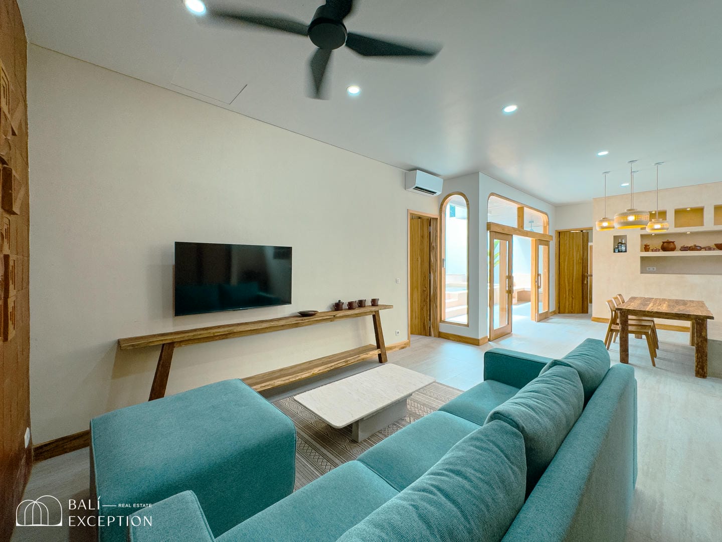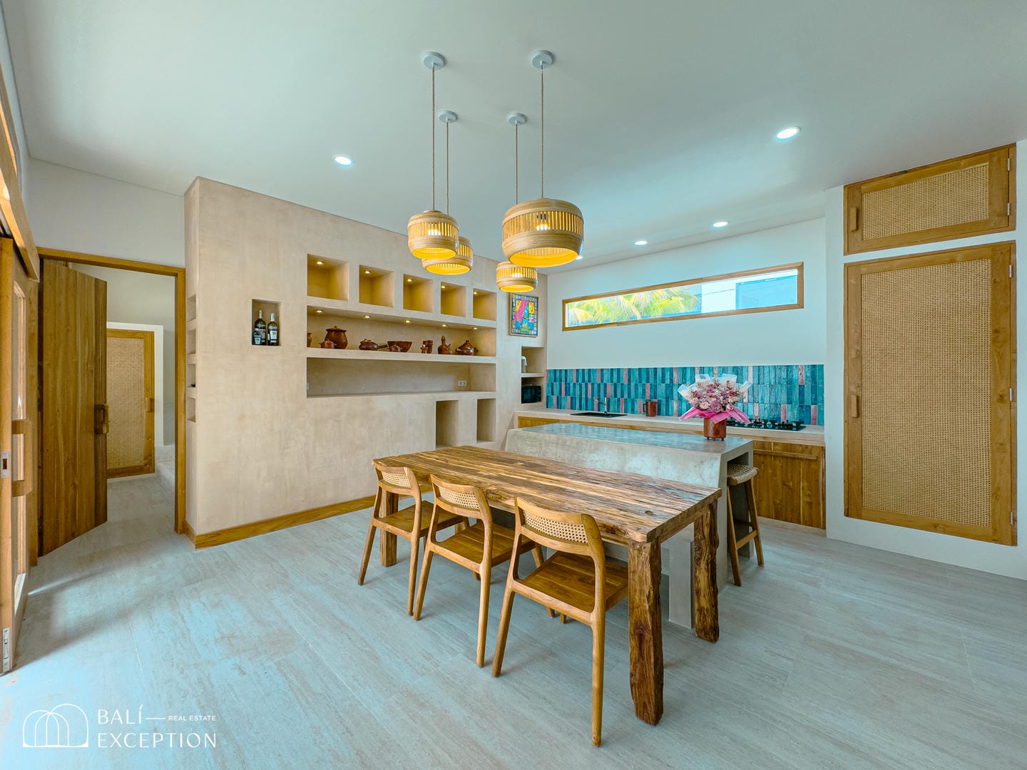 Step into this beautifully designed villa, where modern Mediterranean style meets warm tropical charm. Large windows allow abundant natural light to fill the space, enhancing the bright and airy atmosphere. The kitchen comes fully equipped and is complemented by a solid wooden dining table that adds warmth and character to the room. The spacious living and dining area features thoughtfully crafted wooden furniture, creating a comfortable and inviting setting for everyday living. This villa offers two bedrooms, each