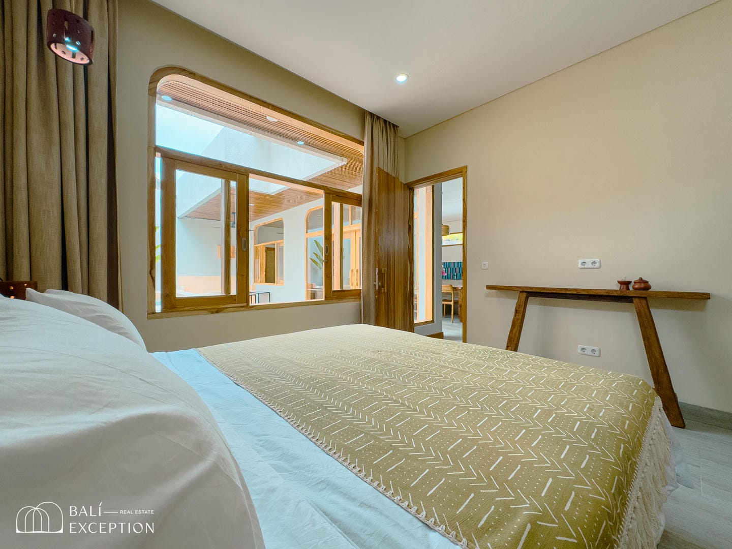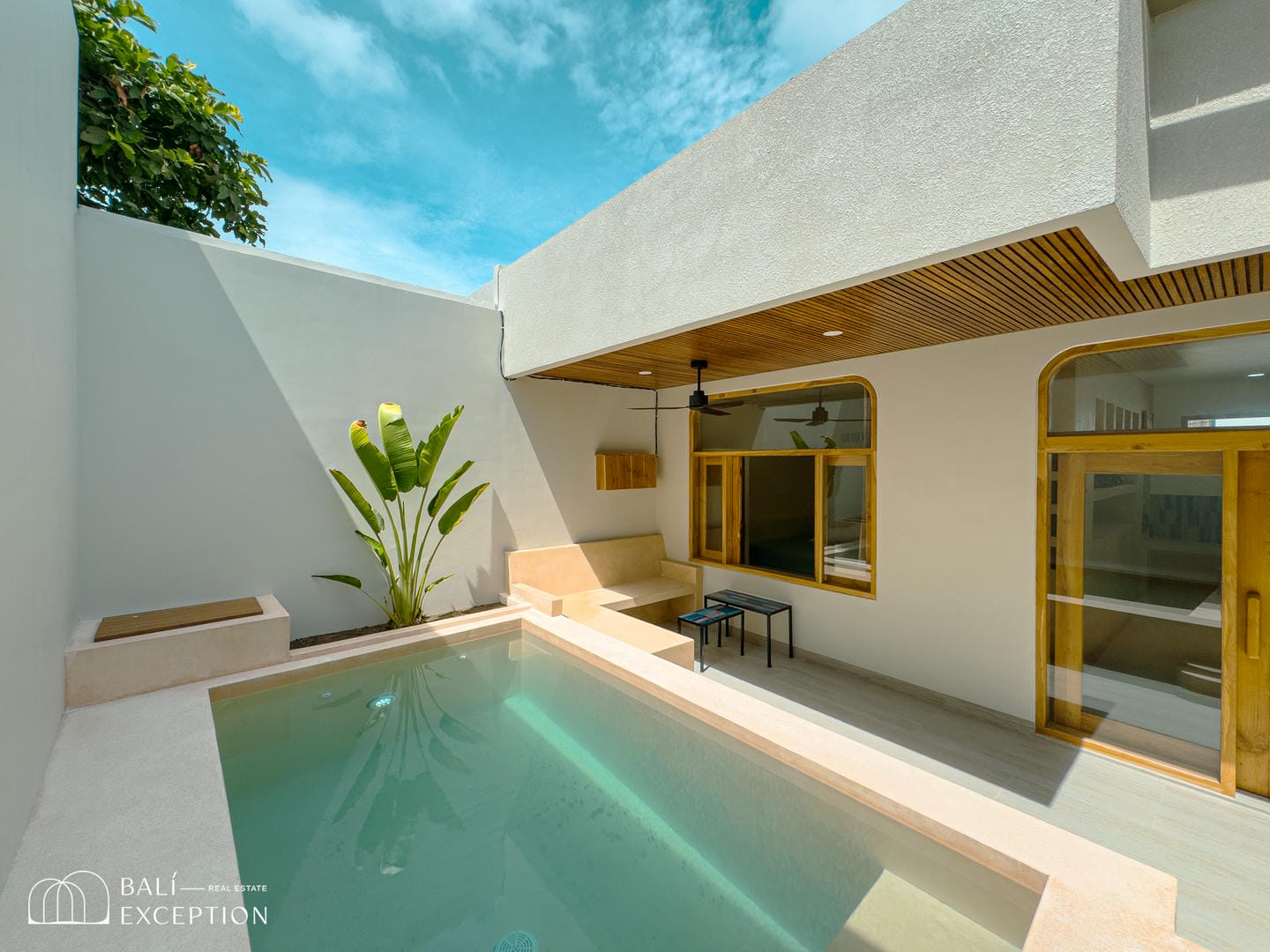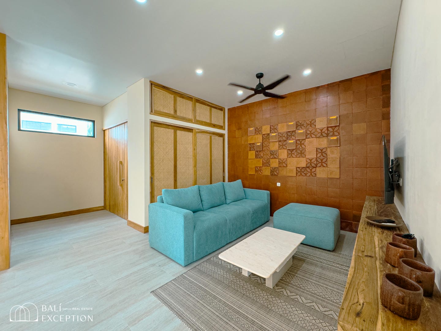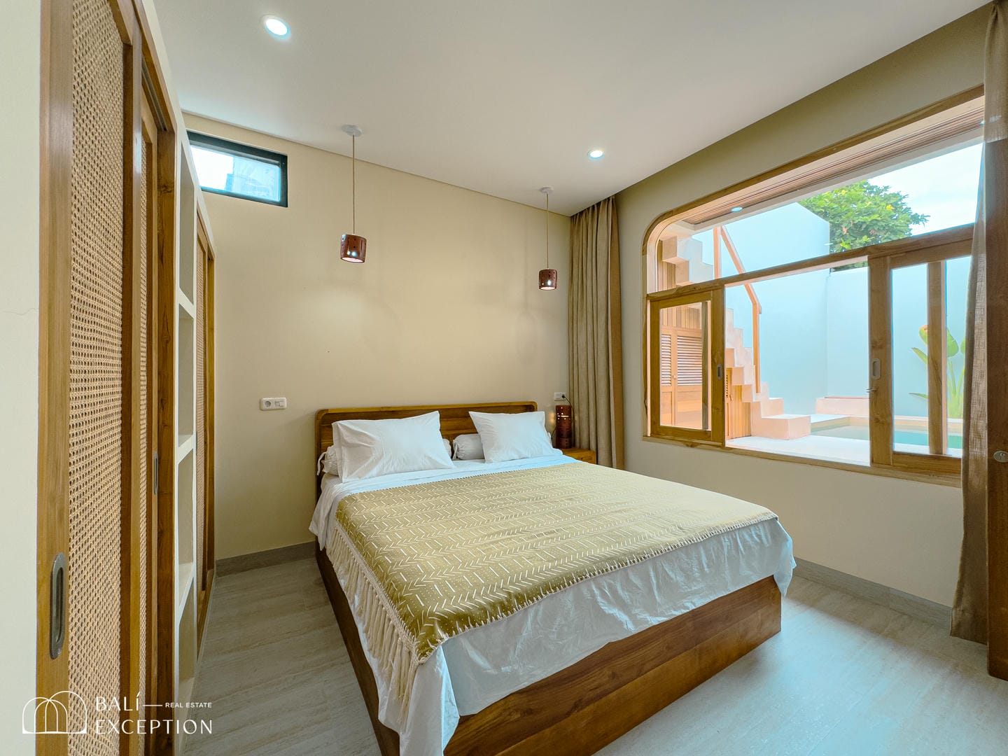 Step into this beautifully designed villa, where modern Mediterranean style meets warm tropical charm. Large windows allow abundant natural light to fill the space, enhancing the bright and airy atmosphere. The kitchen comes fully equipped and is complemented by a solid wooden dining table that adds warmth and character to the room. The spacious living and dining area features thoughtfully crafted wooden furniture, creating a comfortable and inviting setting for everyday living. This villa offers two bedrooms, each