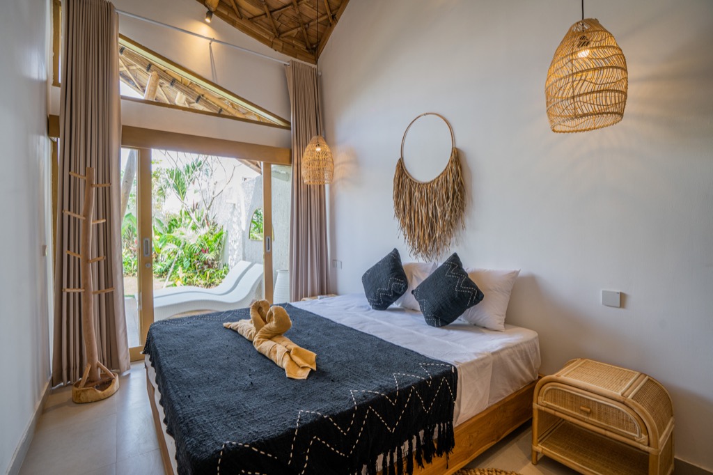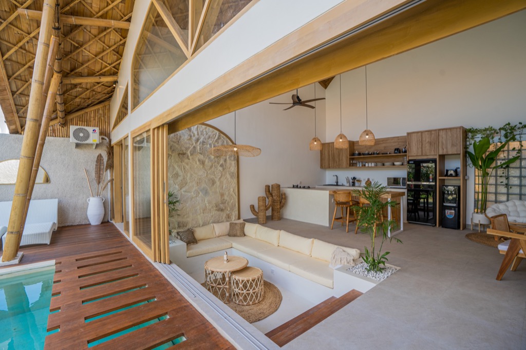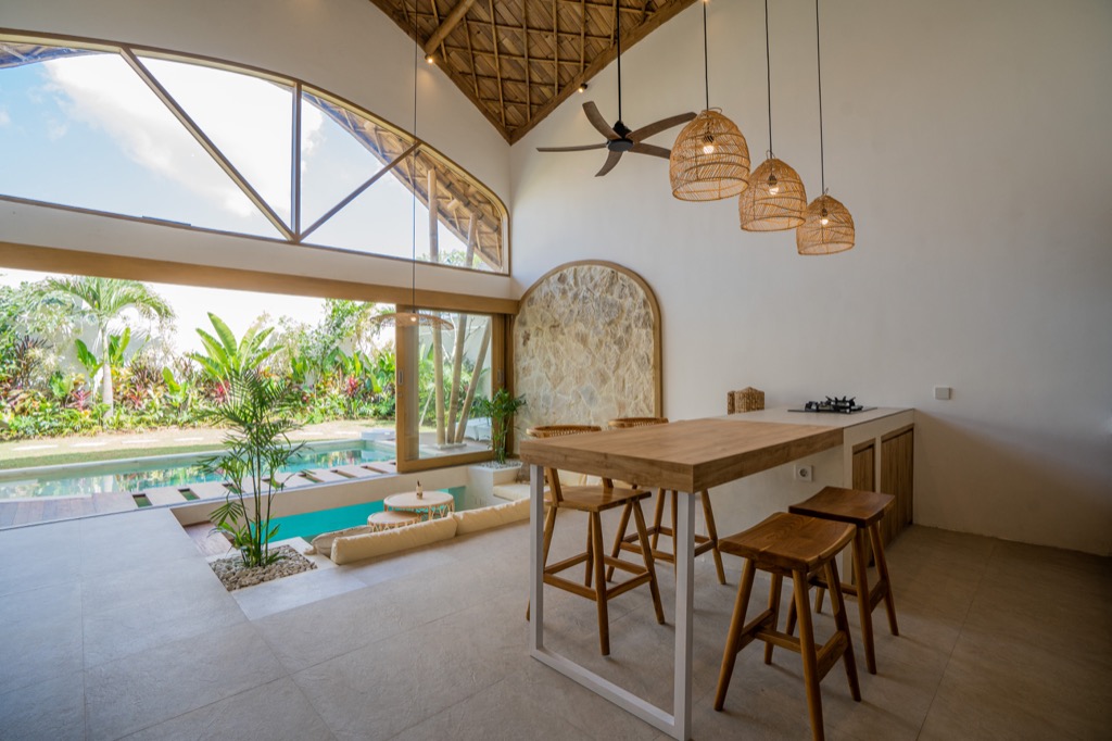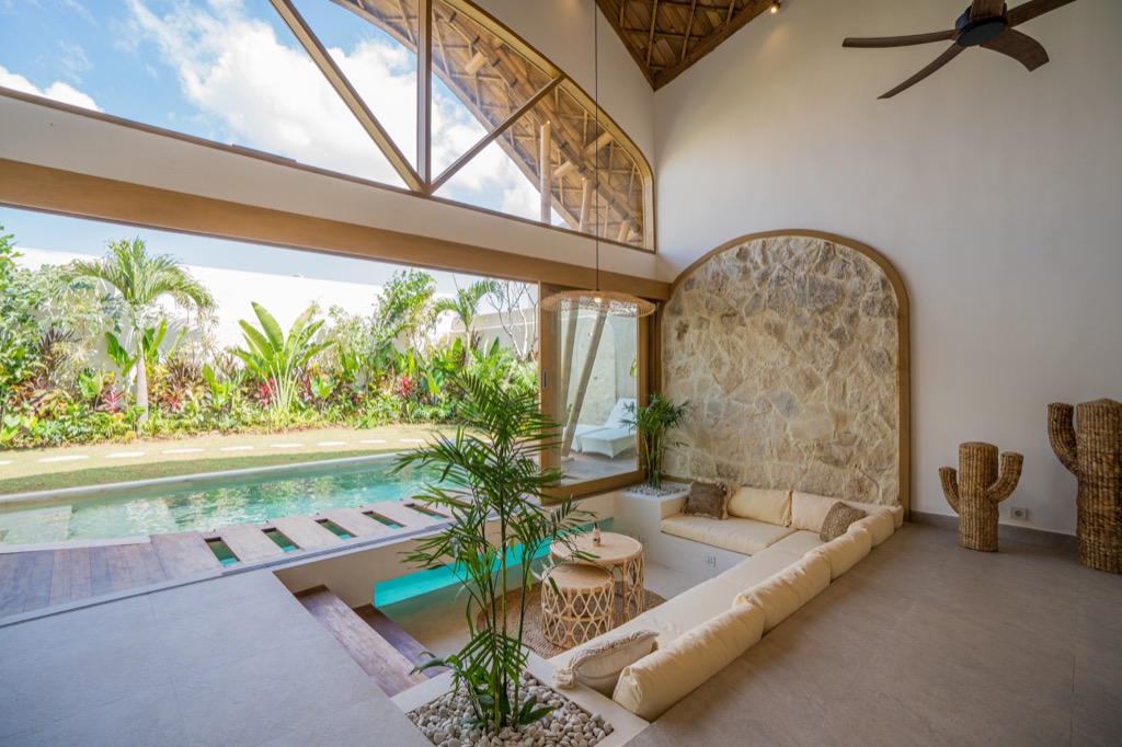 This beautifully designed 2-bedroom villa comes with ensuite bathrooms and features a sunken living room with soaring high ceiling windows, creating a bright and airy atmosphere. The open-enclosed living layout seamlessly connects the indoor and outdoor areas, ideal for tropical living. Fully furnished and equipped with a modern kitchen, the villa is ready to move in.