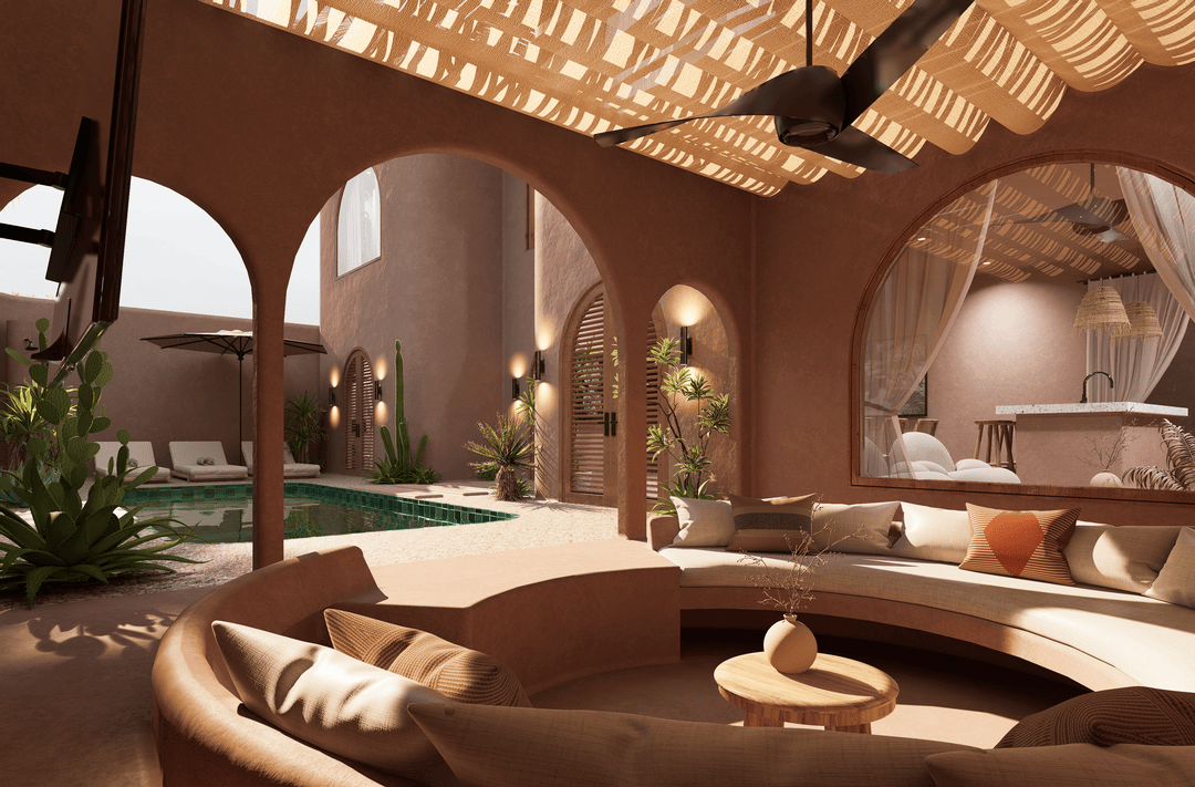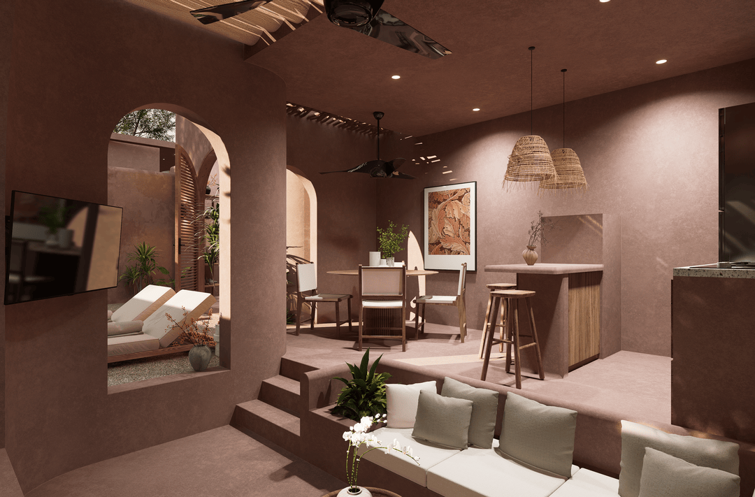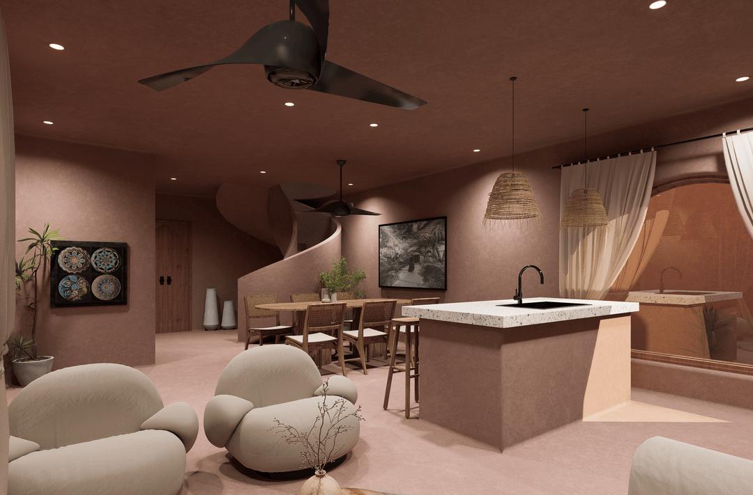 This off-plan project offers a selection of 1, 2, and 3-bedroom villas, each designed with a sunken living room, a cozy dining area, and a functional kitchen.