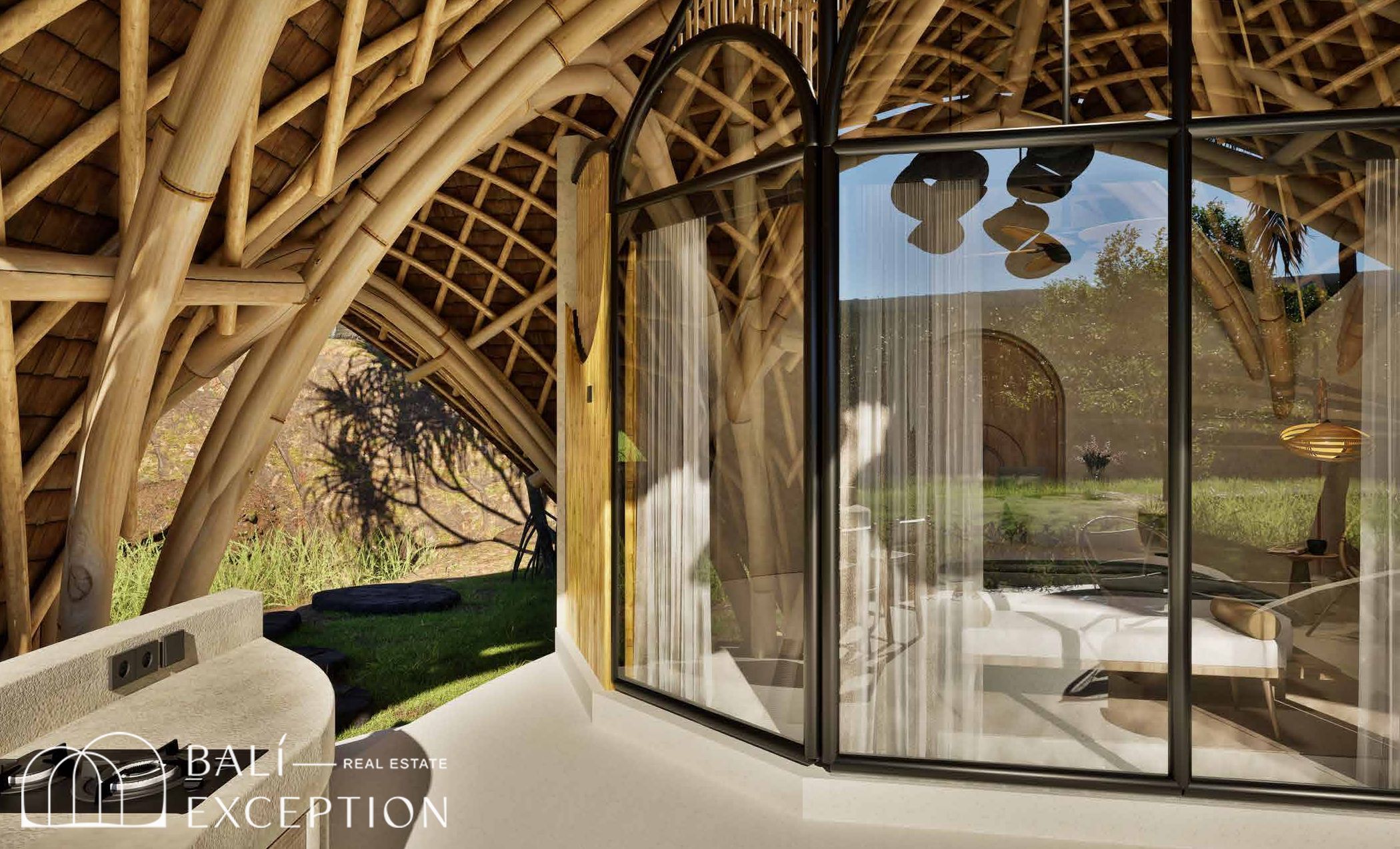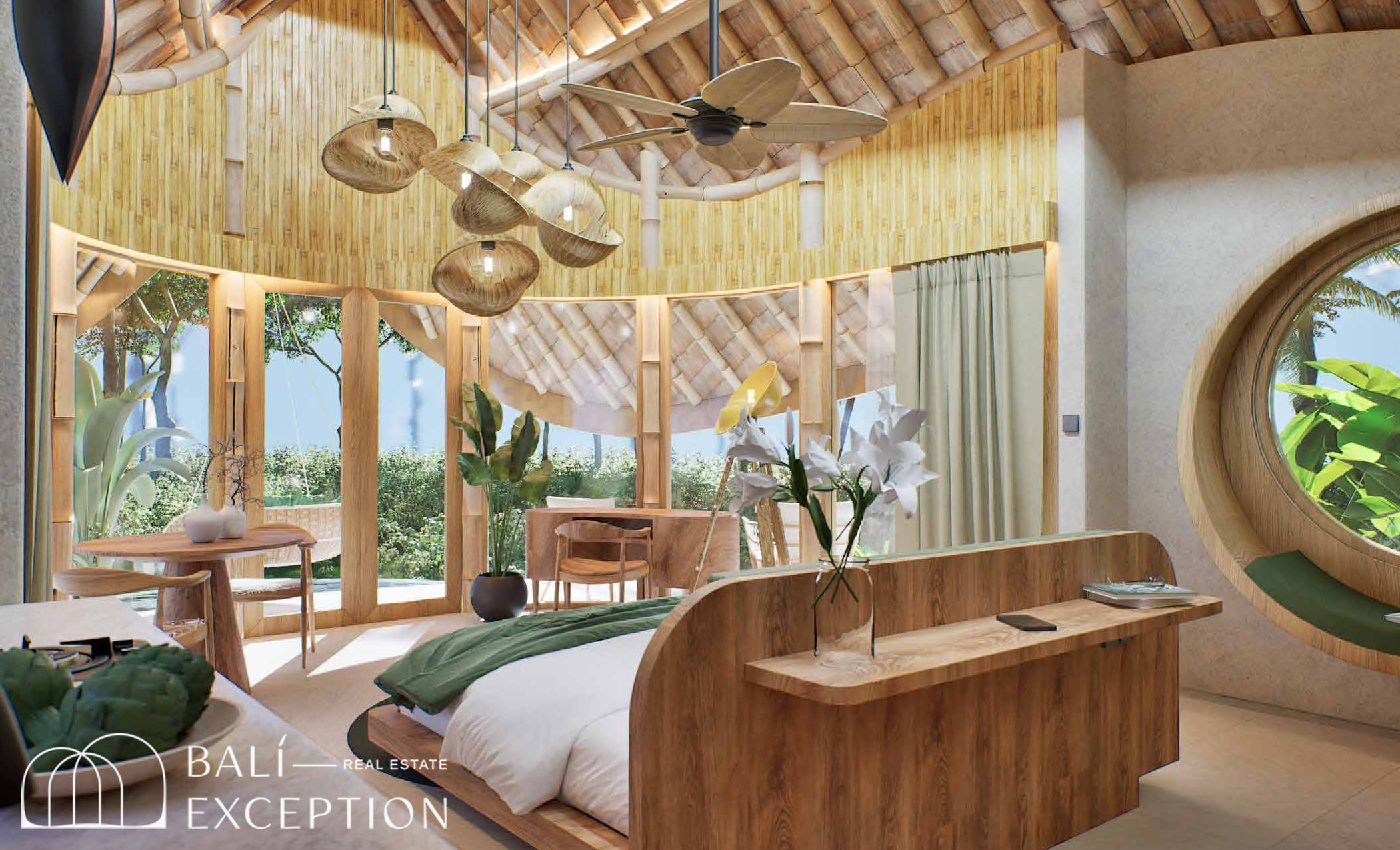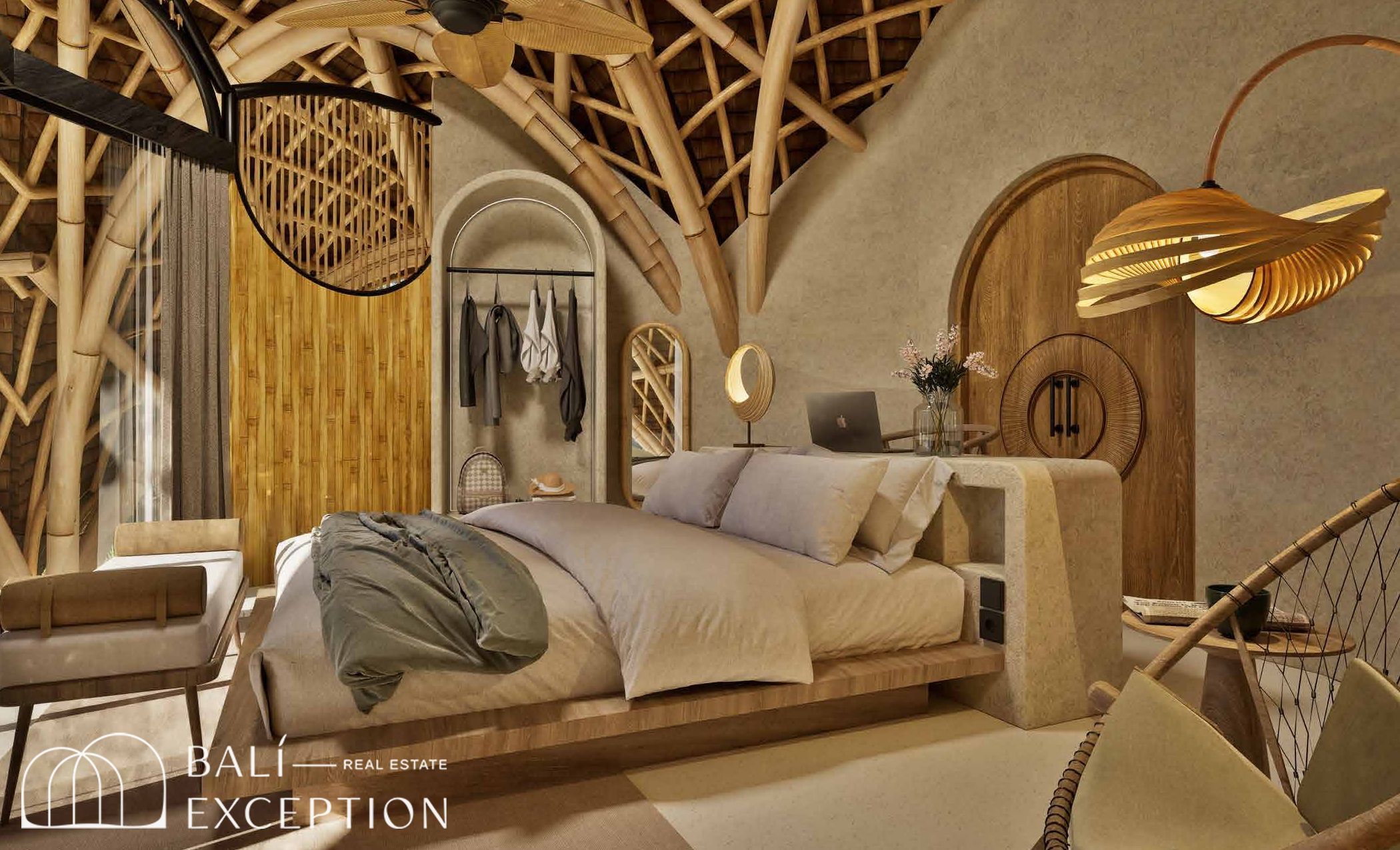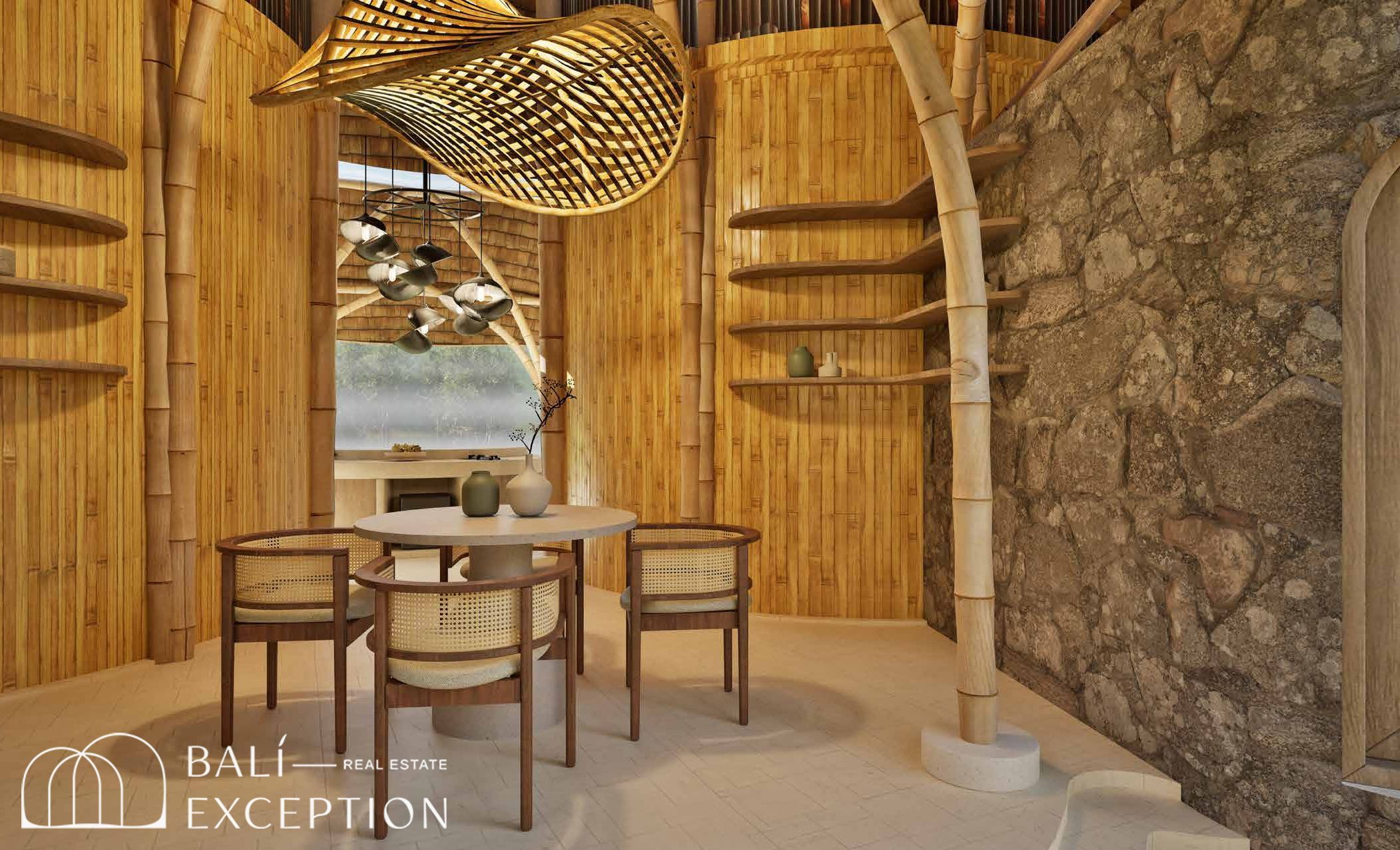The interior showcases a warm tropical organic style, dominated by natural materials such as bamboo, wood, and stone. The architecture features sculptural bamboo structures, soft earthy tones, and handcrafted details, creating a cozy yet design-forward atmosphere. High ceilings and open layouts enhance airflow and natural light, giving the space a serene and airy feel.
