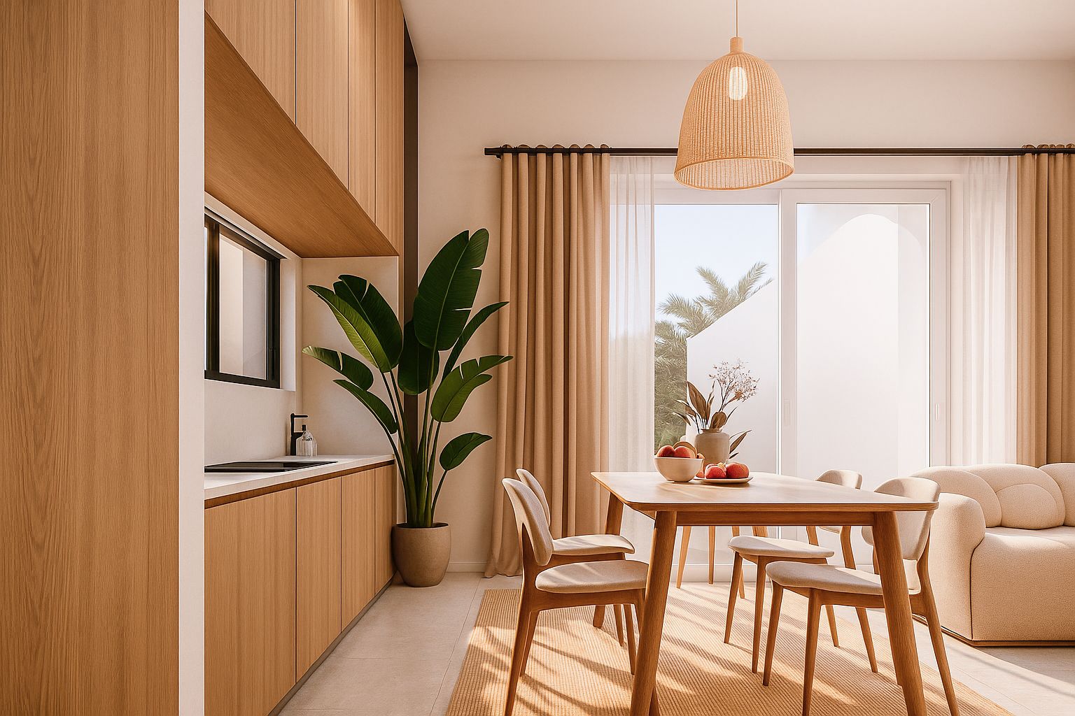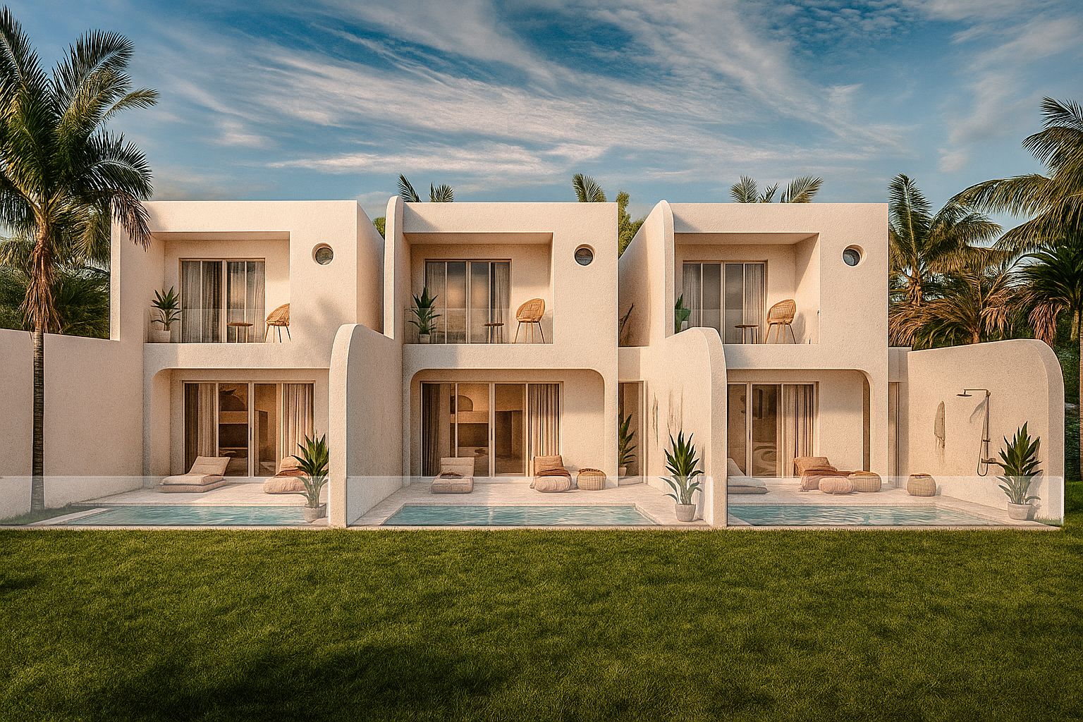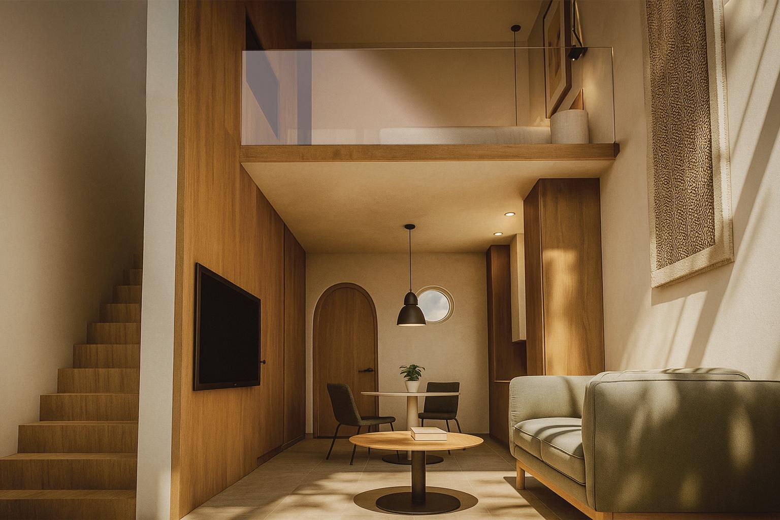 This off-plan villa comes with options of 1 or 2 bedrooms, each with an ensuite bathroom. The enclosed living room features high-ceiling windows, and the villa comes fully furnished with a fully equipped kitchen.