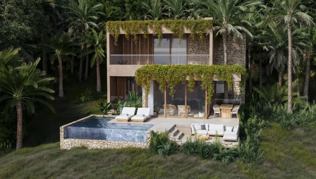 Inspired by nature and designed with sustainability and simplicity at its core, these two-storey villas offer a refined and tranquil living experience in perfect harmony with their surroundings. Each villa features spacious open-plan living areas, a fully equipped kitchen, and elegantly designed bedrooms with en-suite bathrooms distributed over two levels. Expansive floor-to-ceiling windows flood the interiors with natural light while framing panoramic ocean views, complemented by a private balcony and generous terraces ideal for enjoying the tropical setting. Built with high-quality materials and handcrafted finishes such as wood, steel, concrete, ceramics, porcelain flooring, LED lighting, air conditioning, and fitted wardrobes, the villas emphasize open spaces, timeless design, and understated elegance. Every property includes a private swimming pool, a landscaped garden, outdoor chill-out and lounge areas, large terraces designed for relaxed tropical living, as well as private parking. Plot sizes range from 260 to 460 sqm, ensuring privacy, comfort, and a seamless connection with the natural environment.