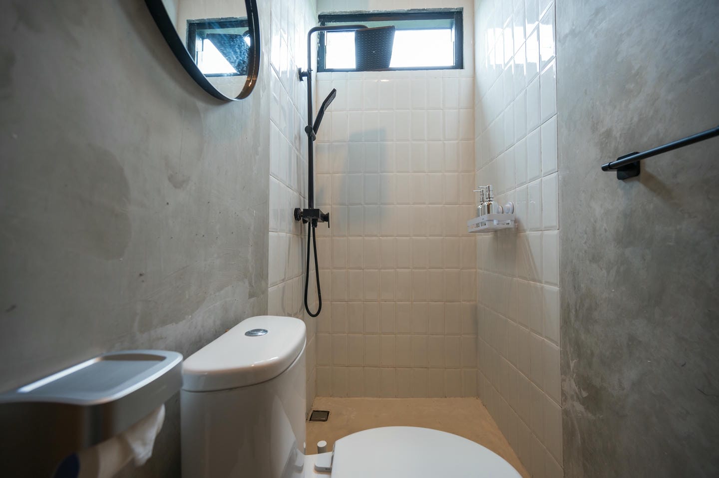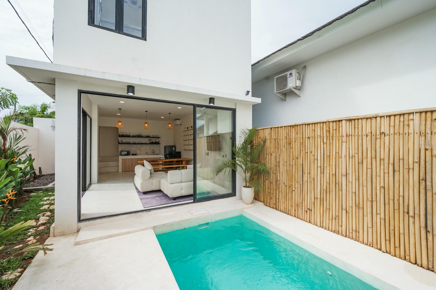 Outdoors, enjoy a private pool framed by bamboo fencing and lush tropical plants, complemented by an outdoor shower that enhances the ultimate Bali living experience.