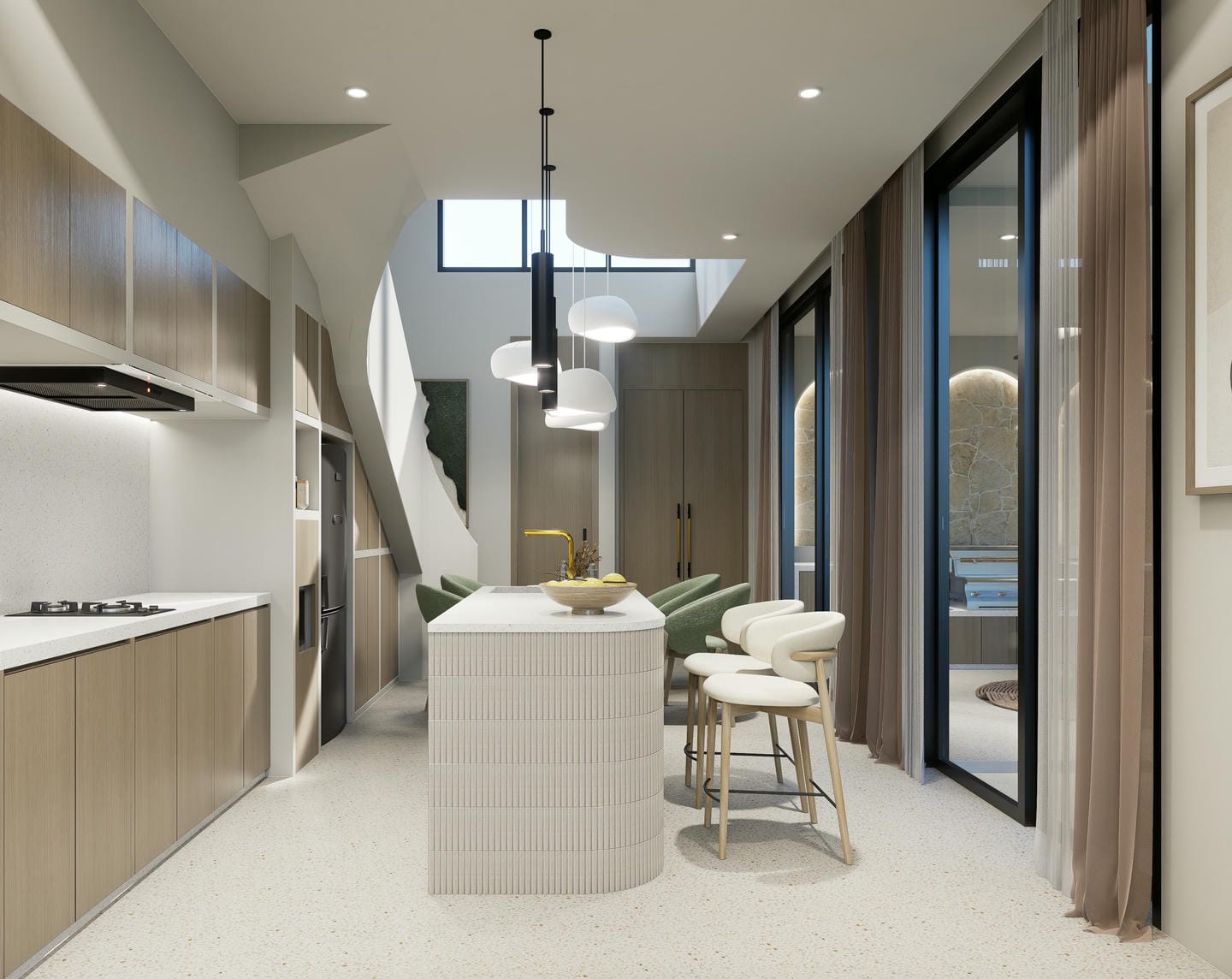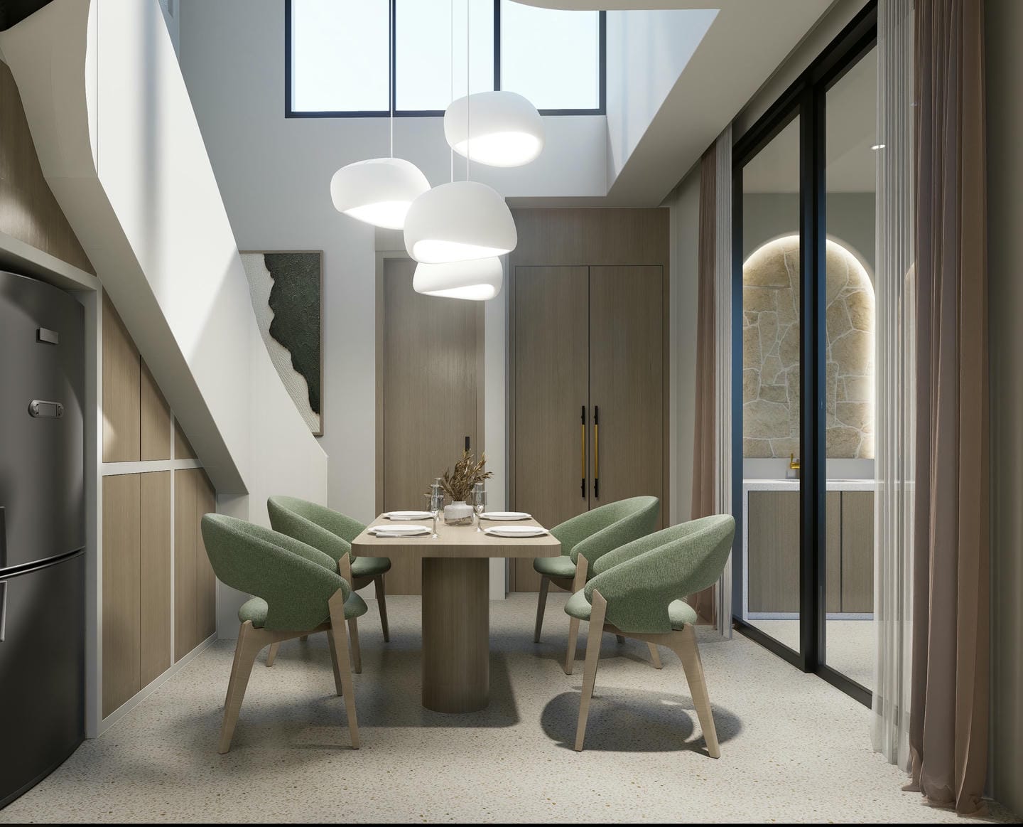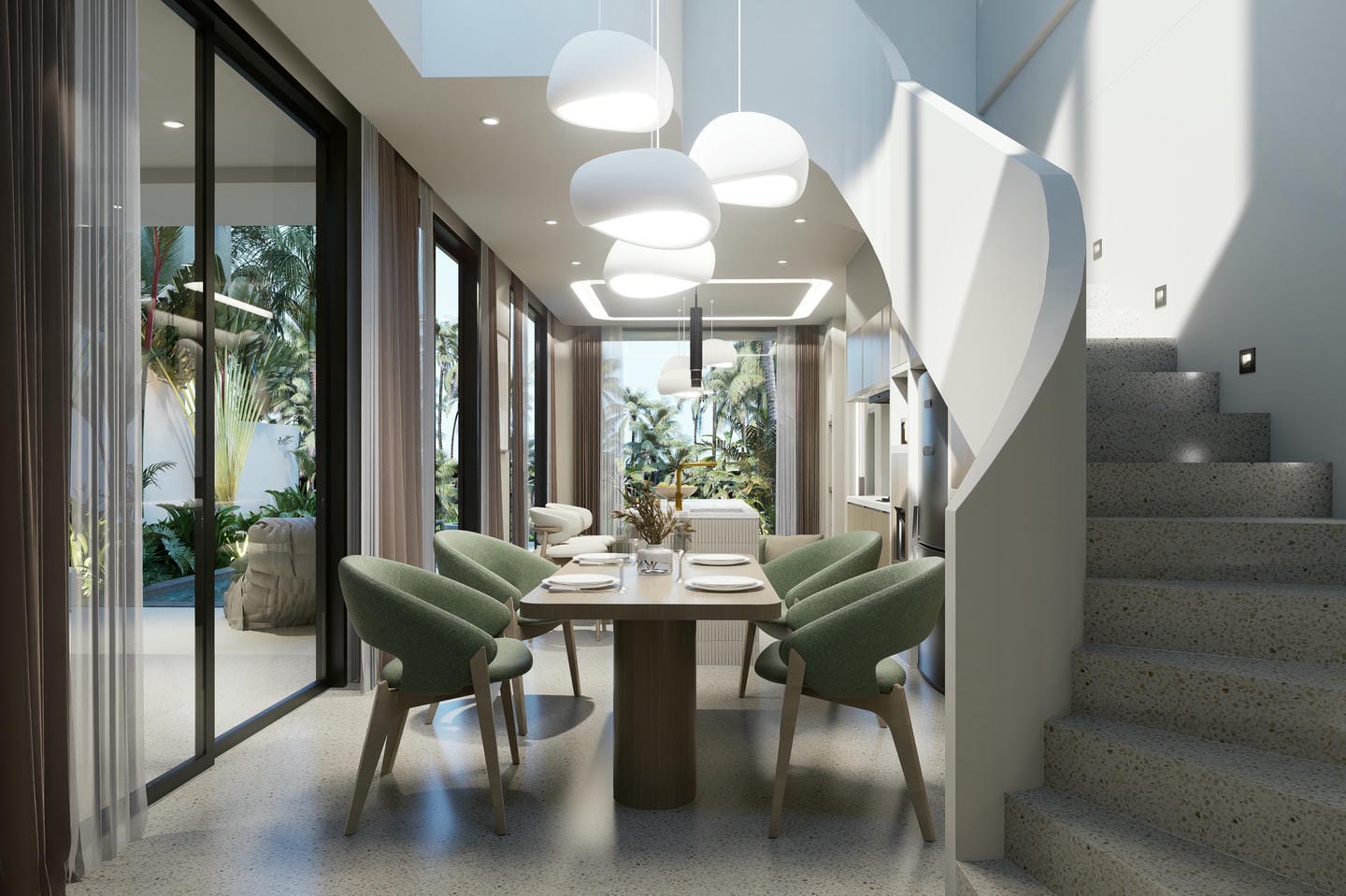 The interior embraces a modern tropical style with clean lines, soft neutral tones, and natural accents. Large windows bring in plenty of light, creating a warm and inviting living space that seamlessly connects with the dining and kitchen areas.