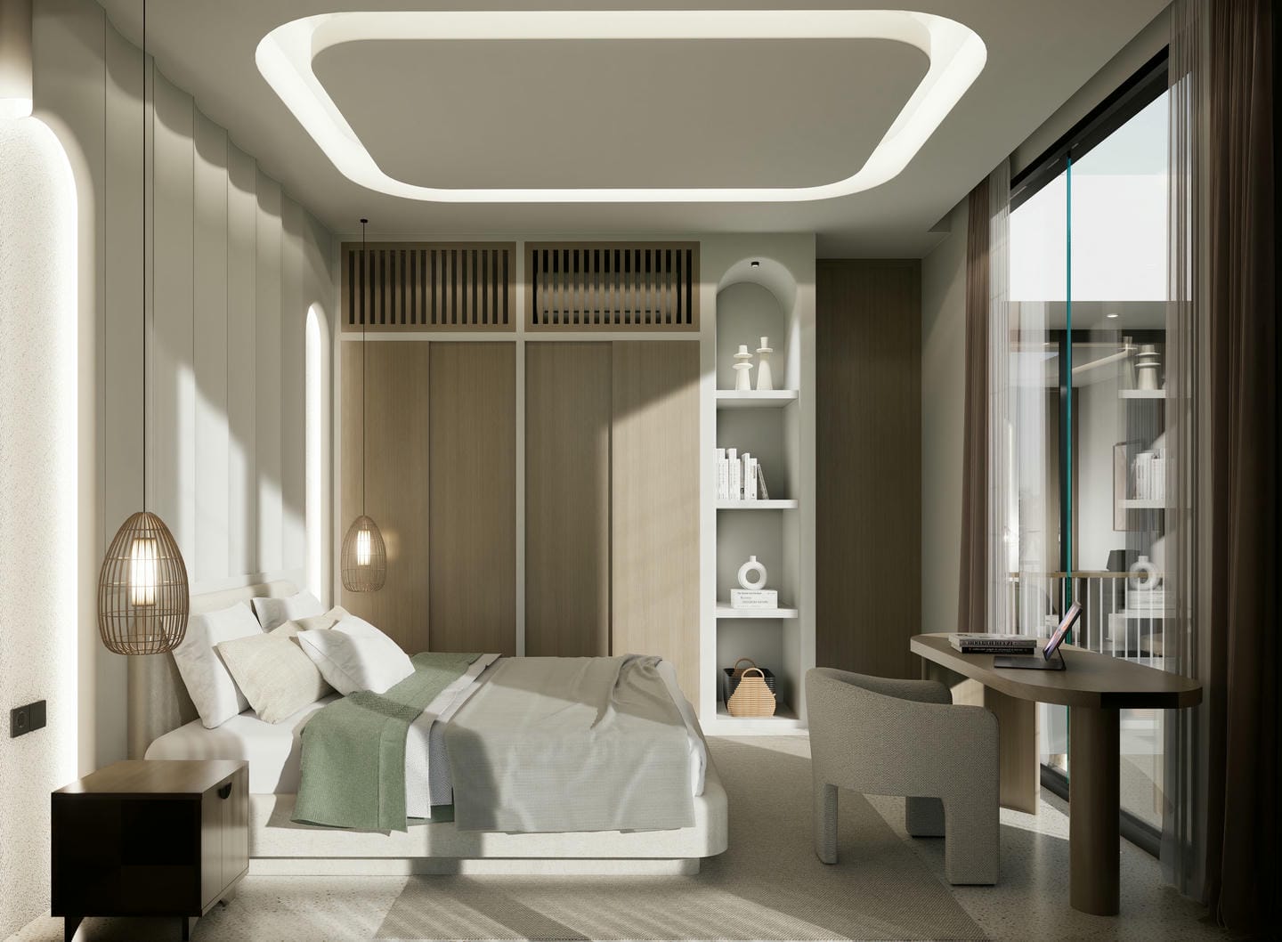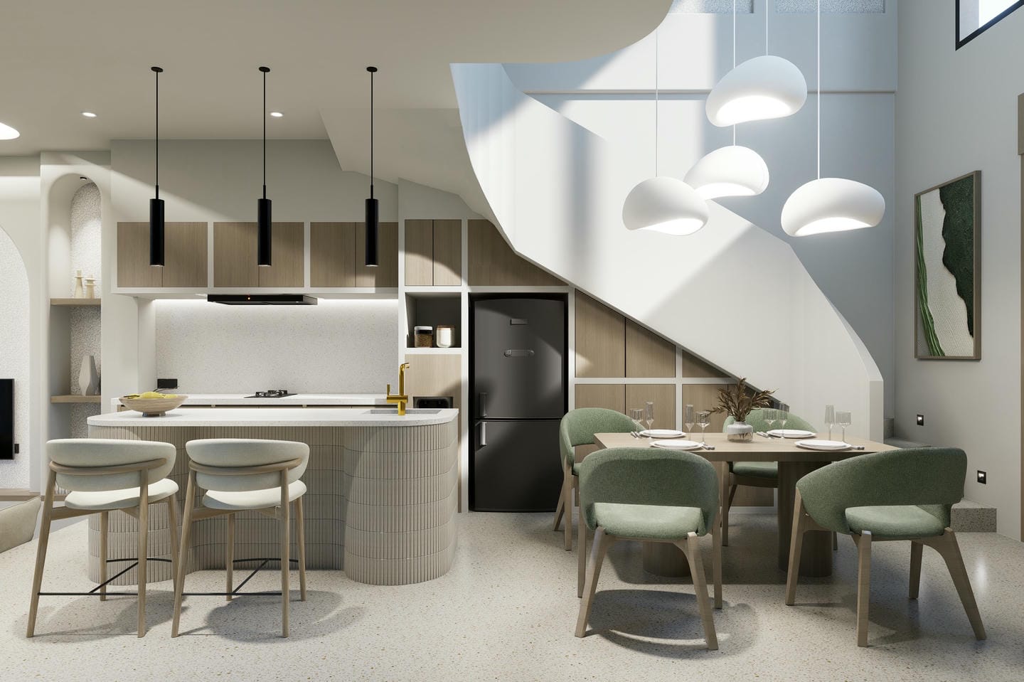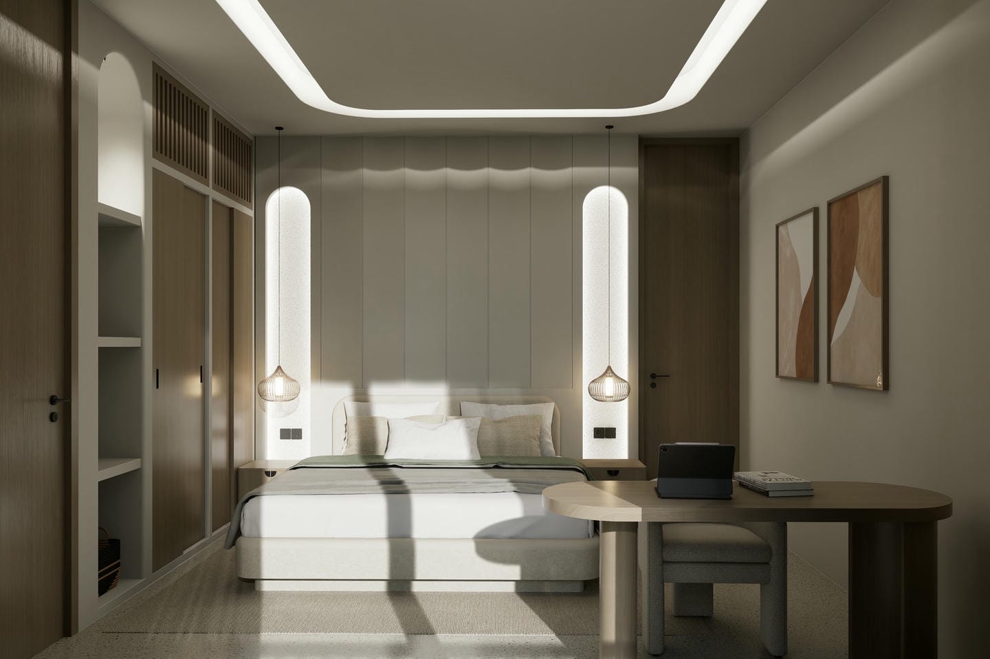 The interior embraces a modern tropical style with clean lines, soft neutral tones, and natural accents. Large windows bring in plenty of light, creating a warm and inviting living space that seamlessly connects with the dining and kitchen areas.