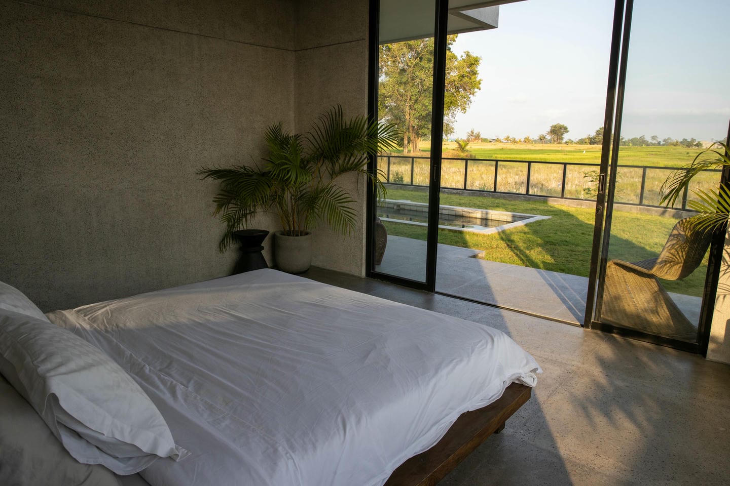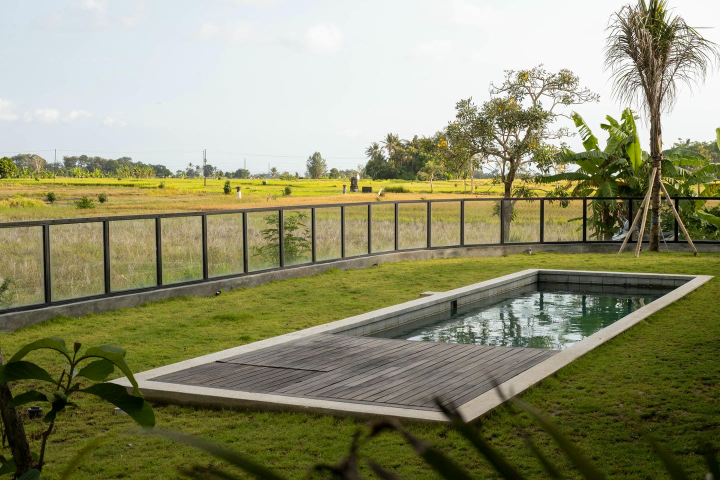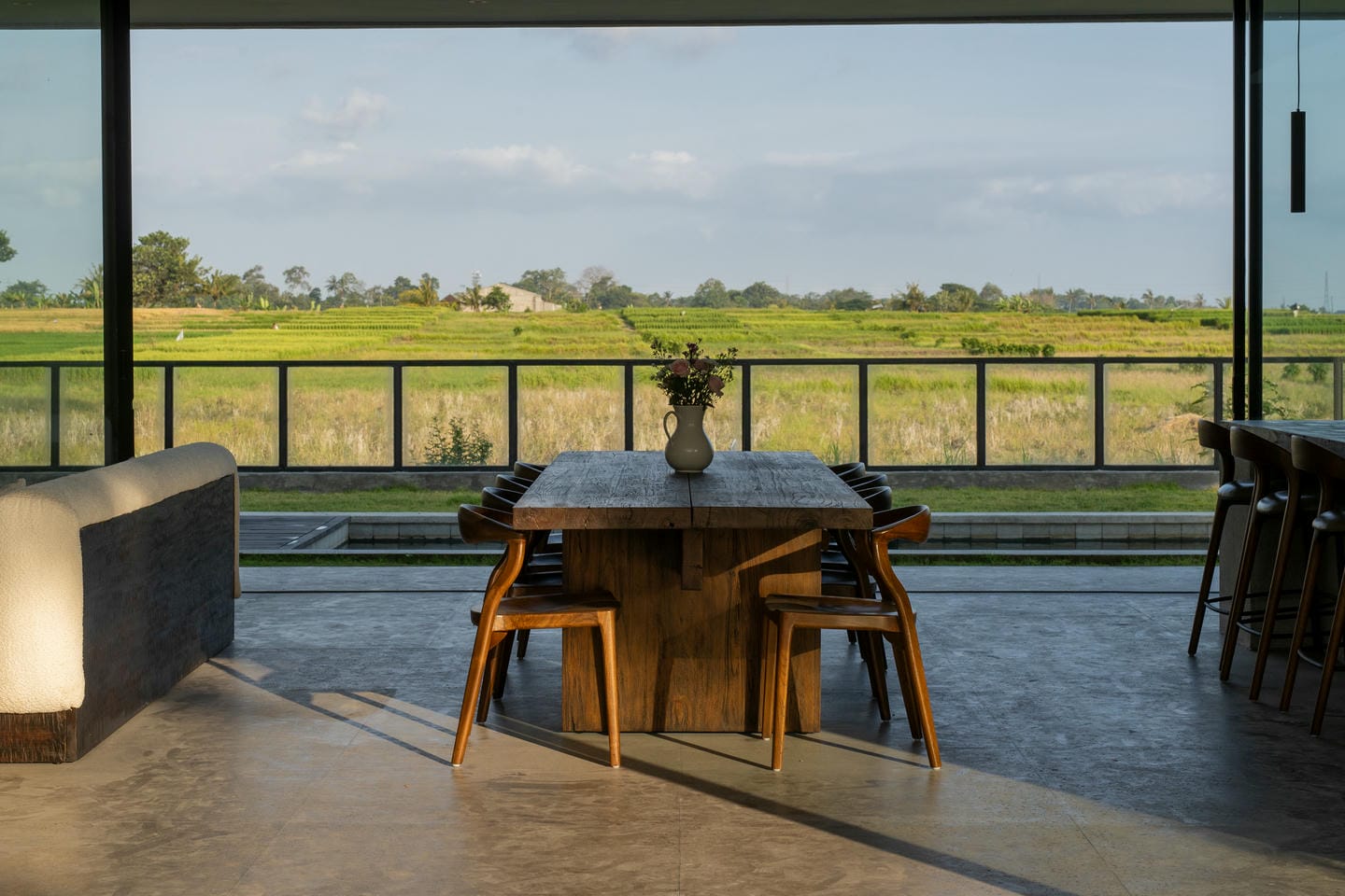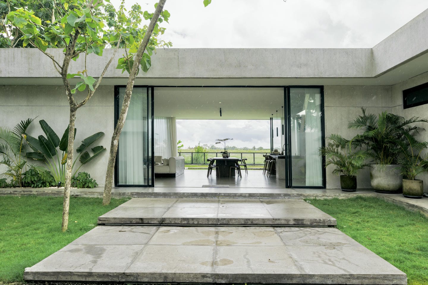 Outdoors, the villa opens to lush greenery and expansive rice field views, creating a serene and open landscape. The flat lawn and surrounding trees enhance the sense of space, nature, and tranquility.
