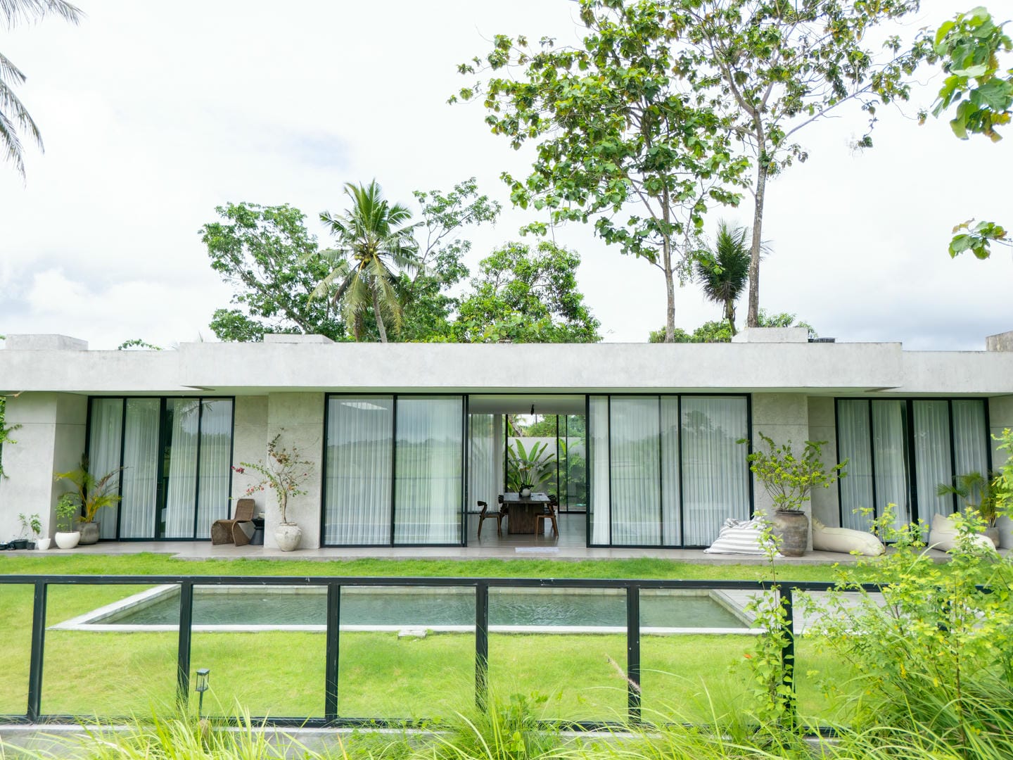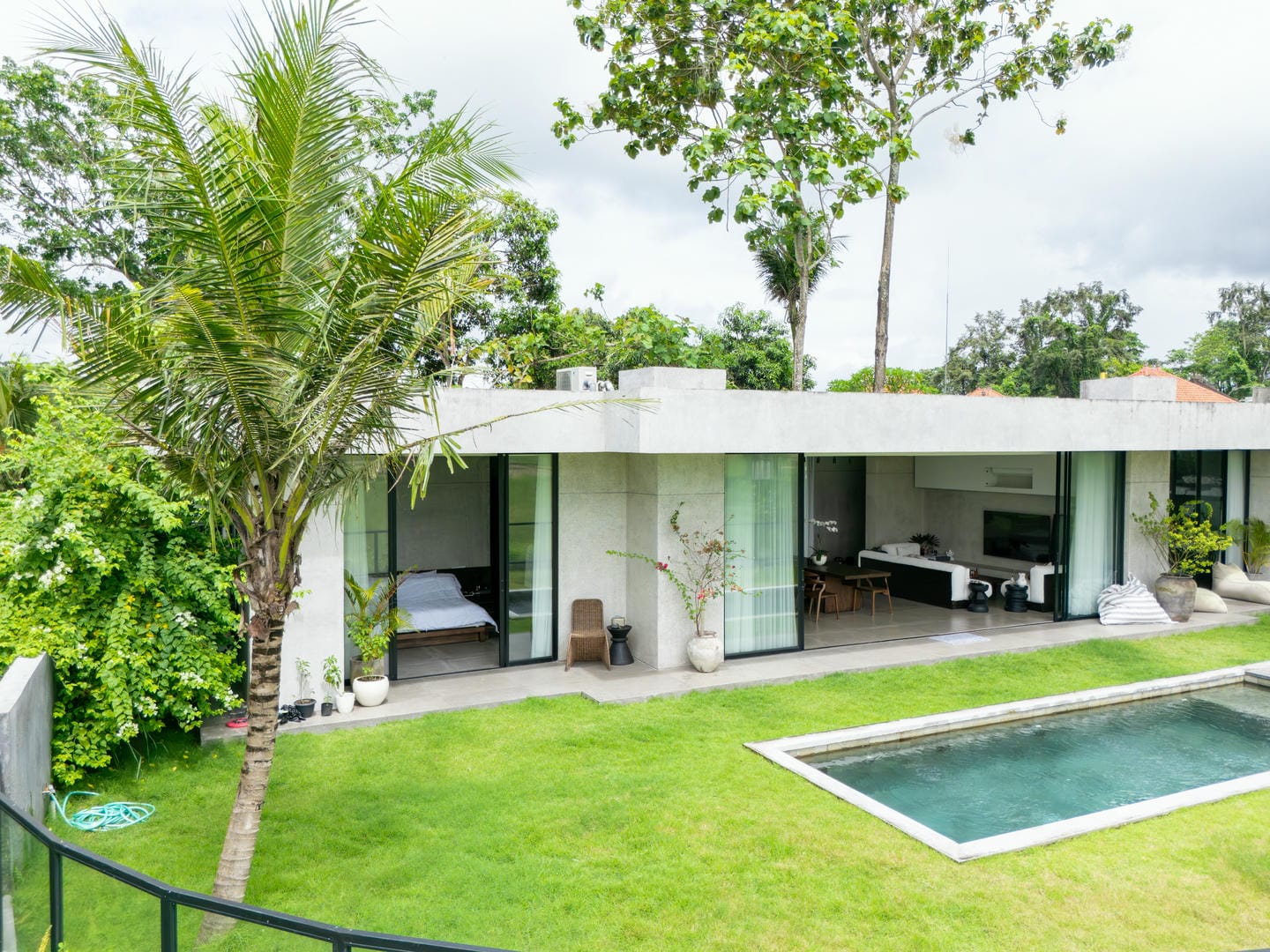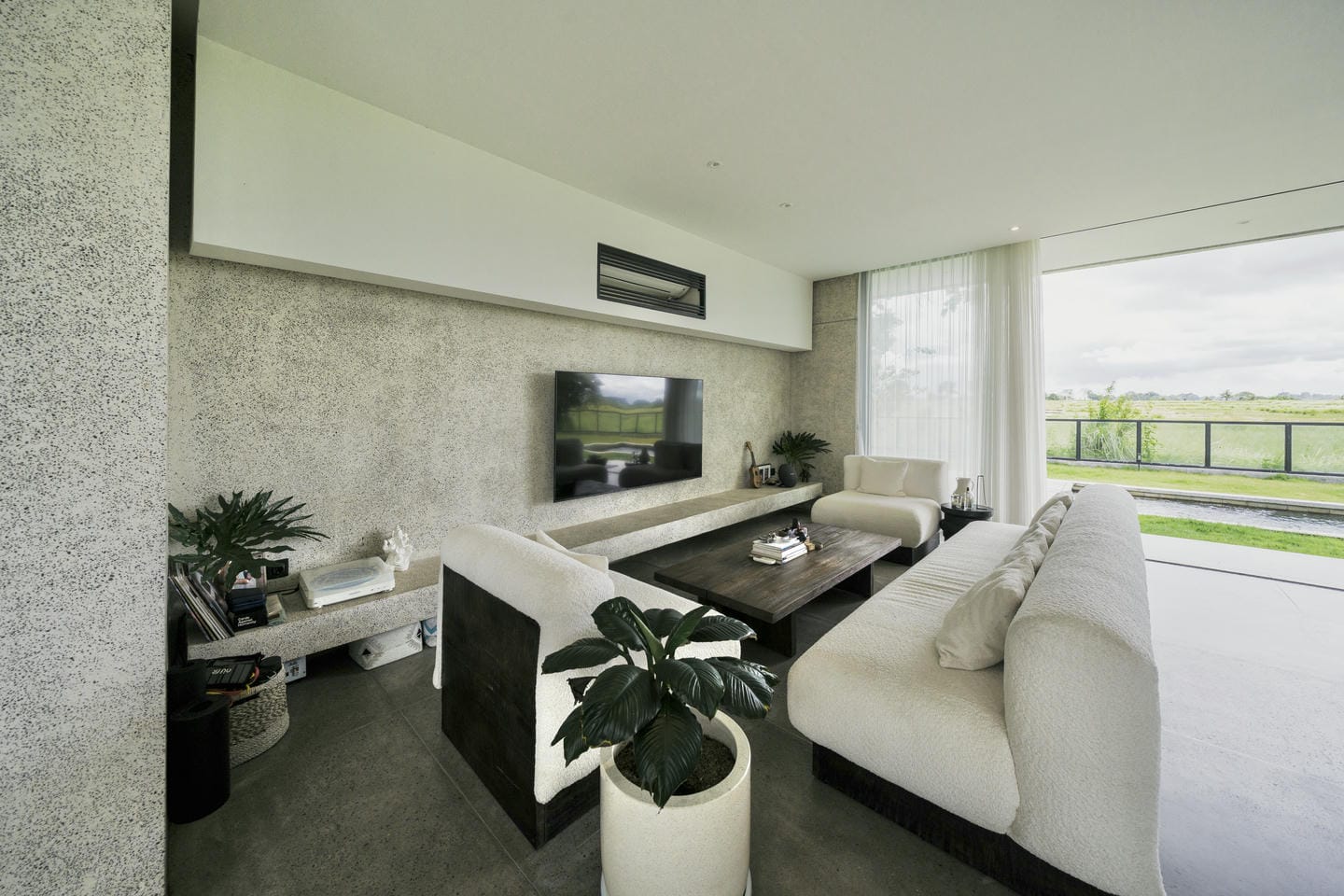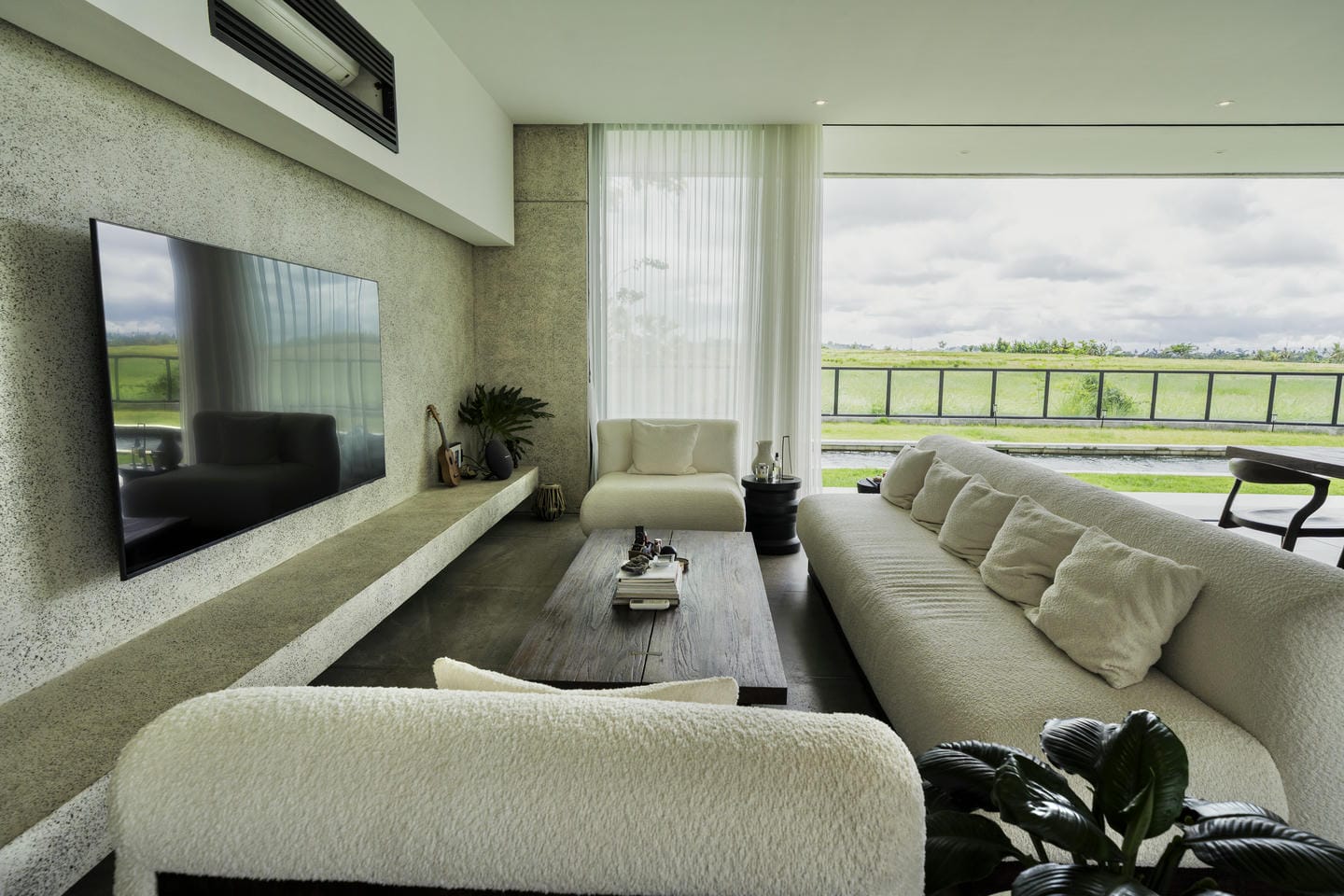 The interior features a refined modern-minimalist style with a strong tropical touch. Clean architectural lines, concrete textures, soft neutral tones, and comfortable furnishings create a calm and elegant atmosphere. Large glass doors allow natural light to flow seamlessly through the living spaces.