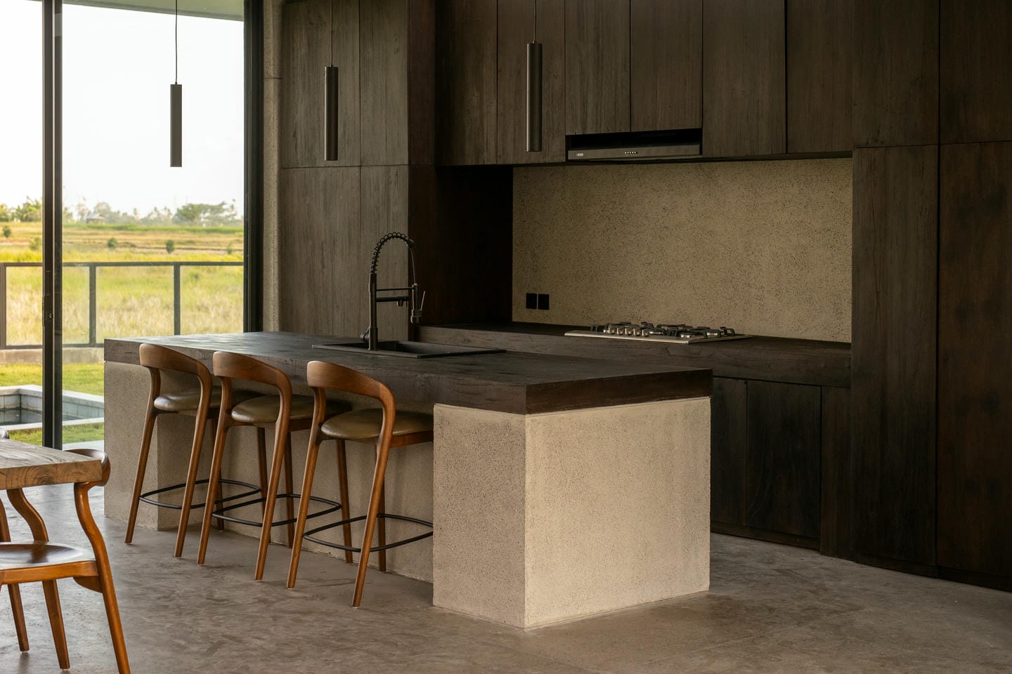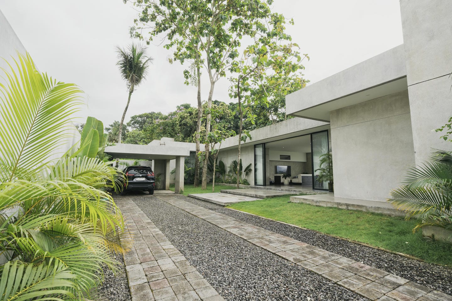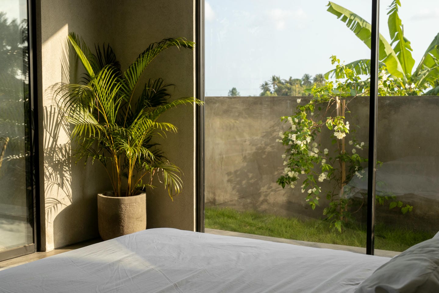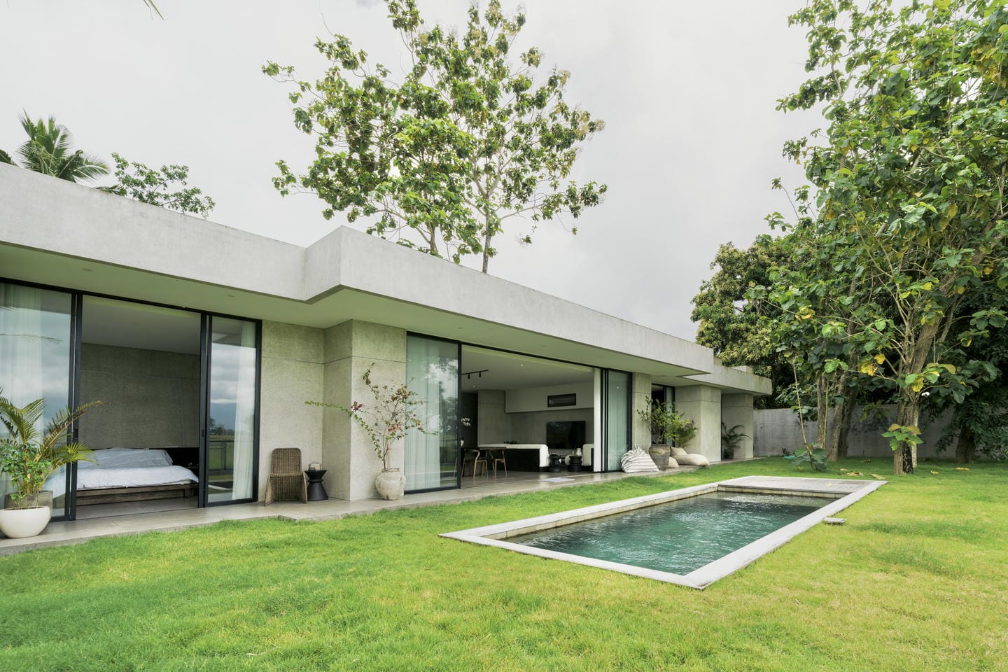 The interior features a refined modern-minimalist style with a strong tropical touch. Clean architectural lines, concrete textures, soft neutral tones, and comfortable furnishings create a calm and elegant atmosphere. Large glass doors allow natural light to flow seamlessly through the living spaces.