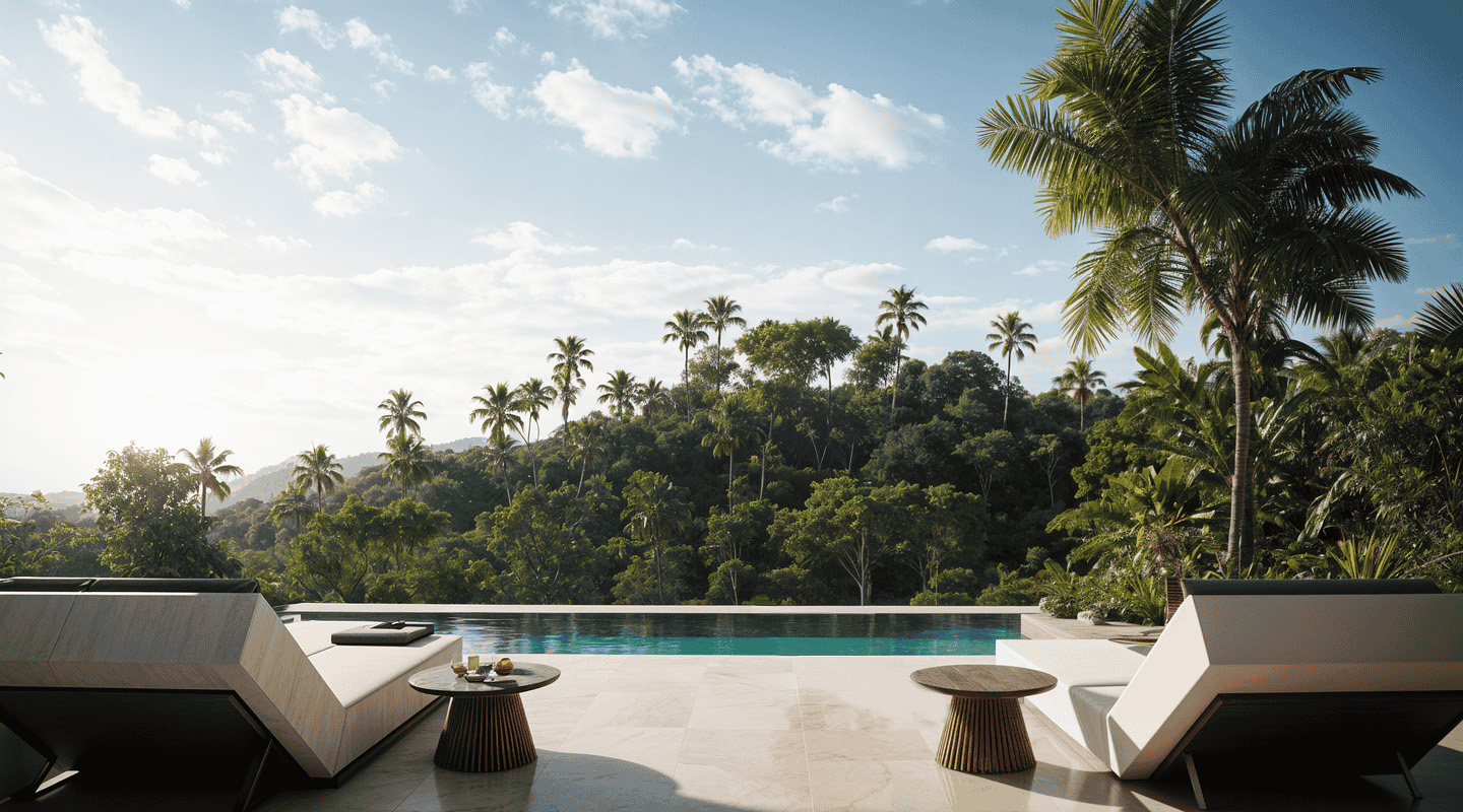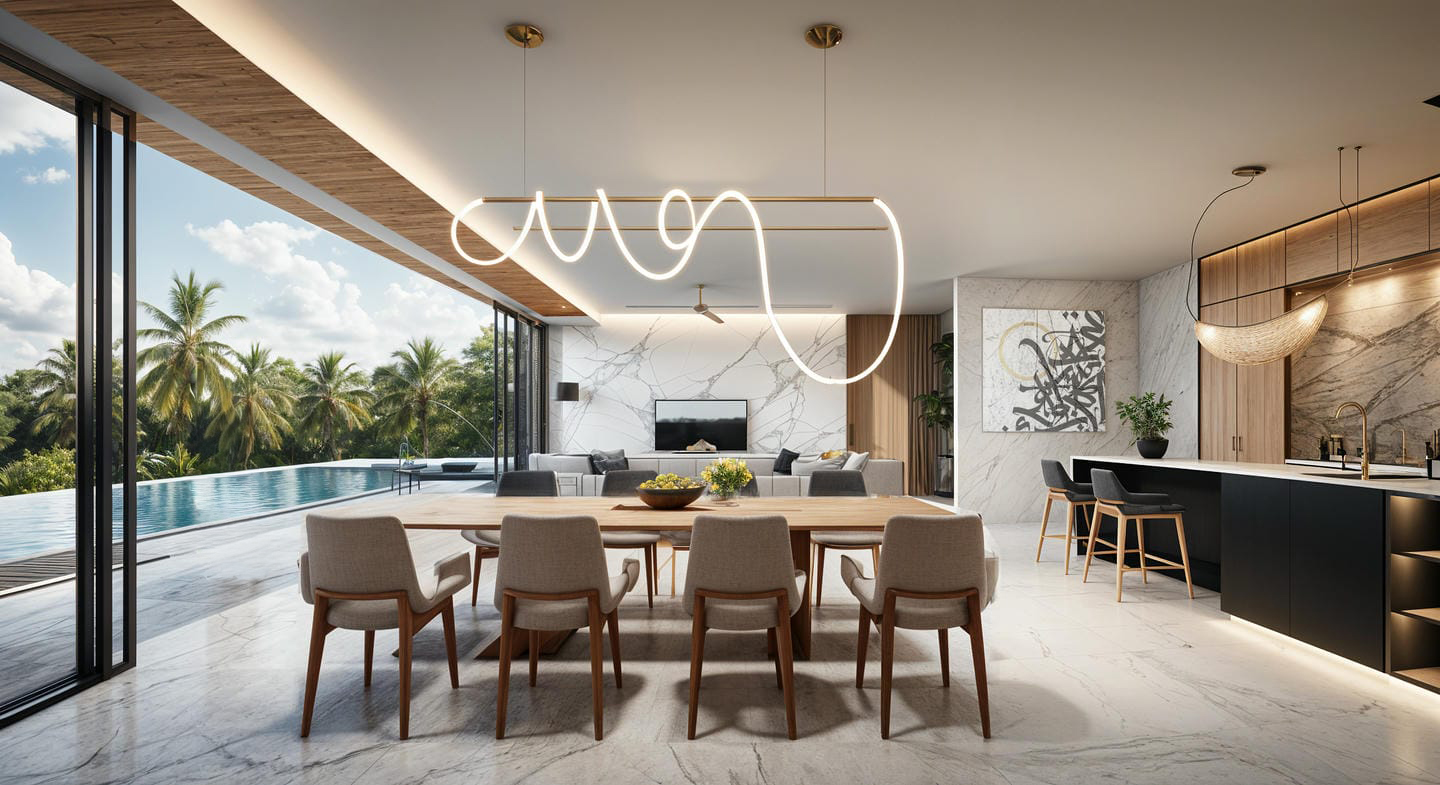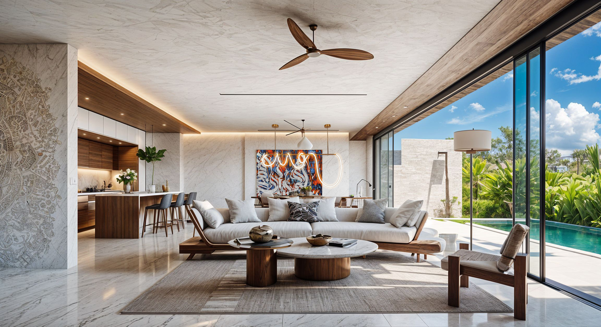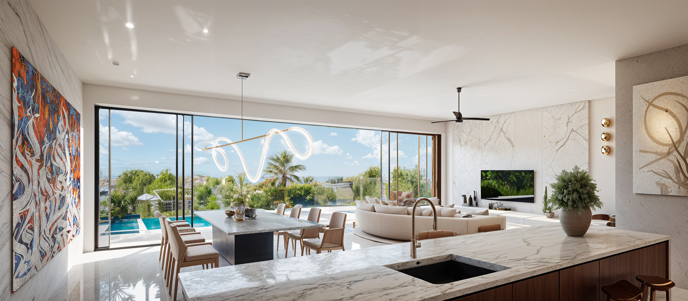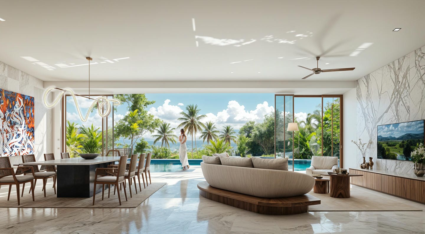 The interior showcases a refined modern tropical design, blending clean architectural lines with warm natural materials. Open-plan living, floor-to-ceiling glass doors, and elegant finishes create a bright, airy atmosphere that seamlessly connects the living, dining, and kitchen areas.