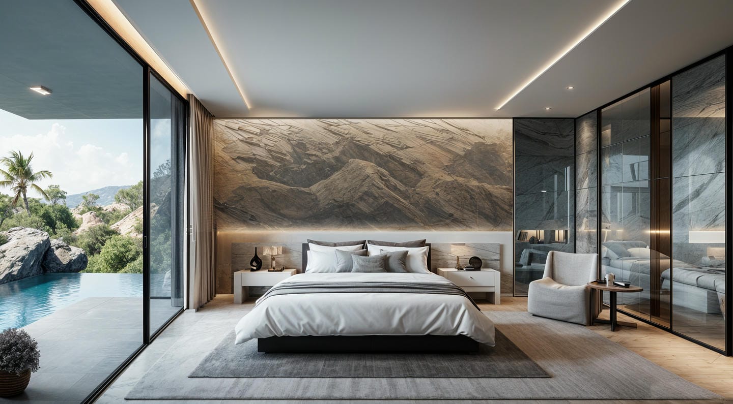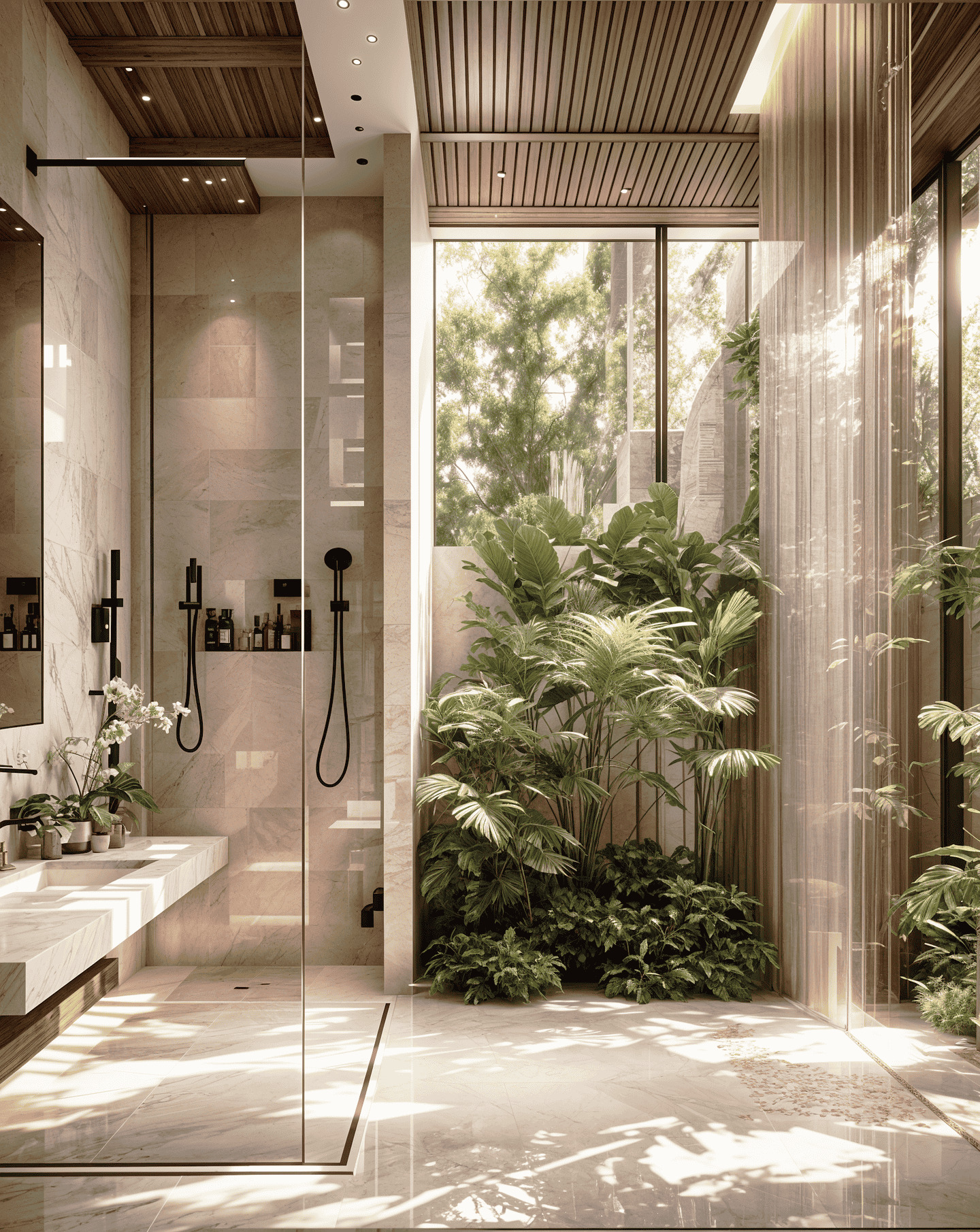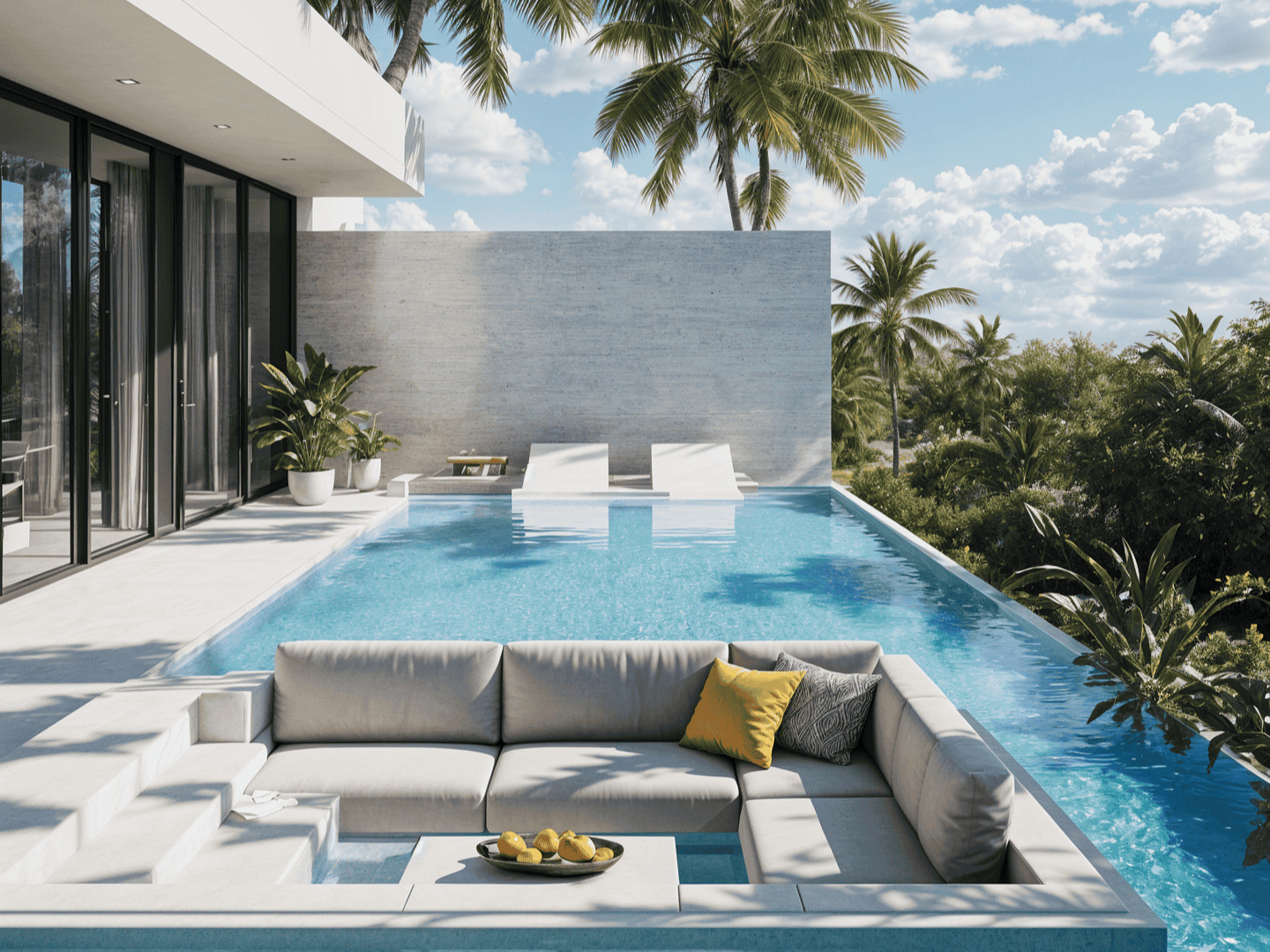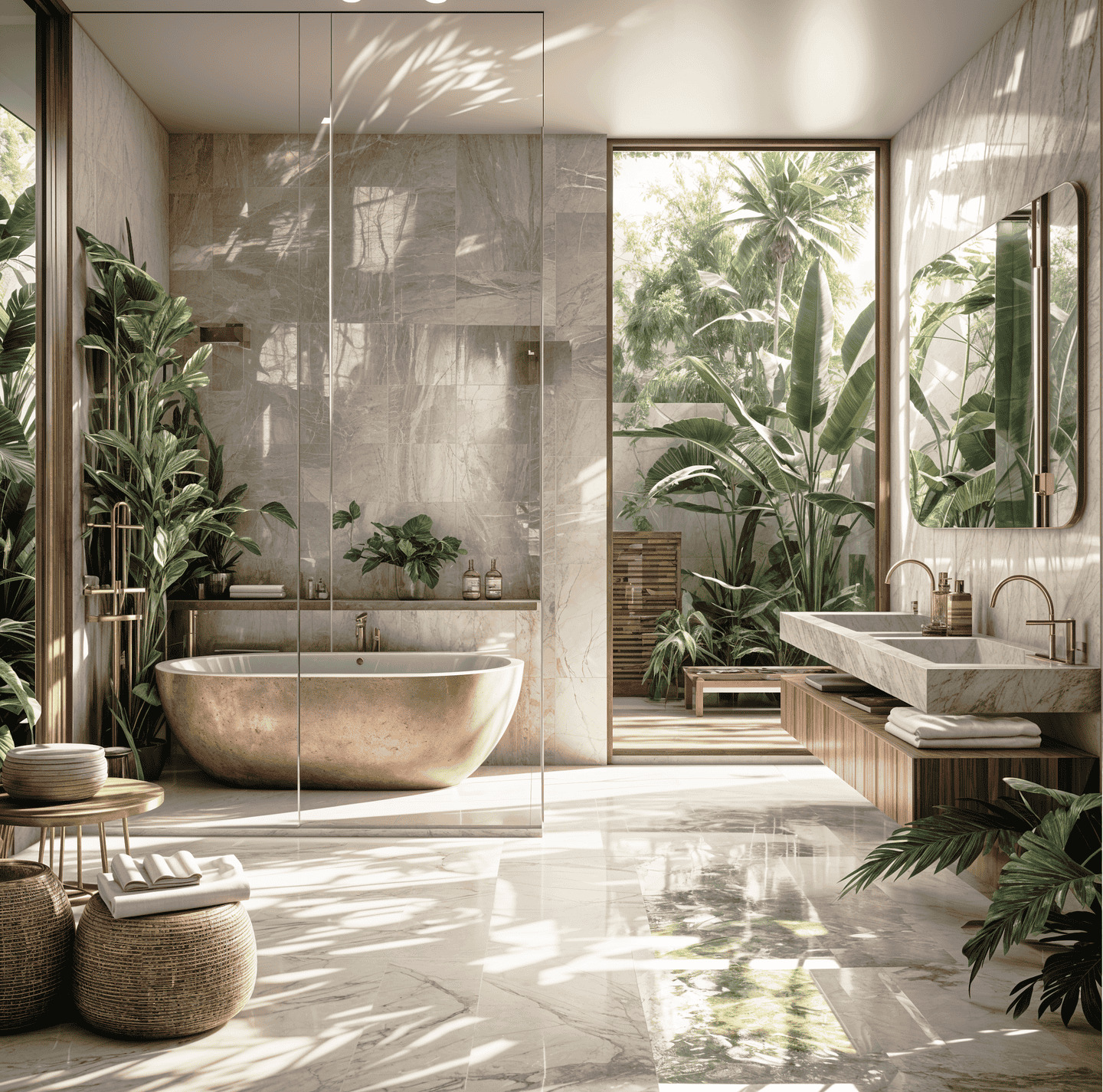 The interior showcases a refined modern tropical design, blending clean architectural lines with warm natural materials. Open-plan living, floor-to-ceiling glass doors, and elegant finishes create a bright, airy atmosphere that seamlessly connects the living, dining, and kitchen areas.