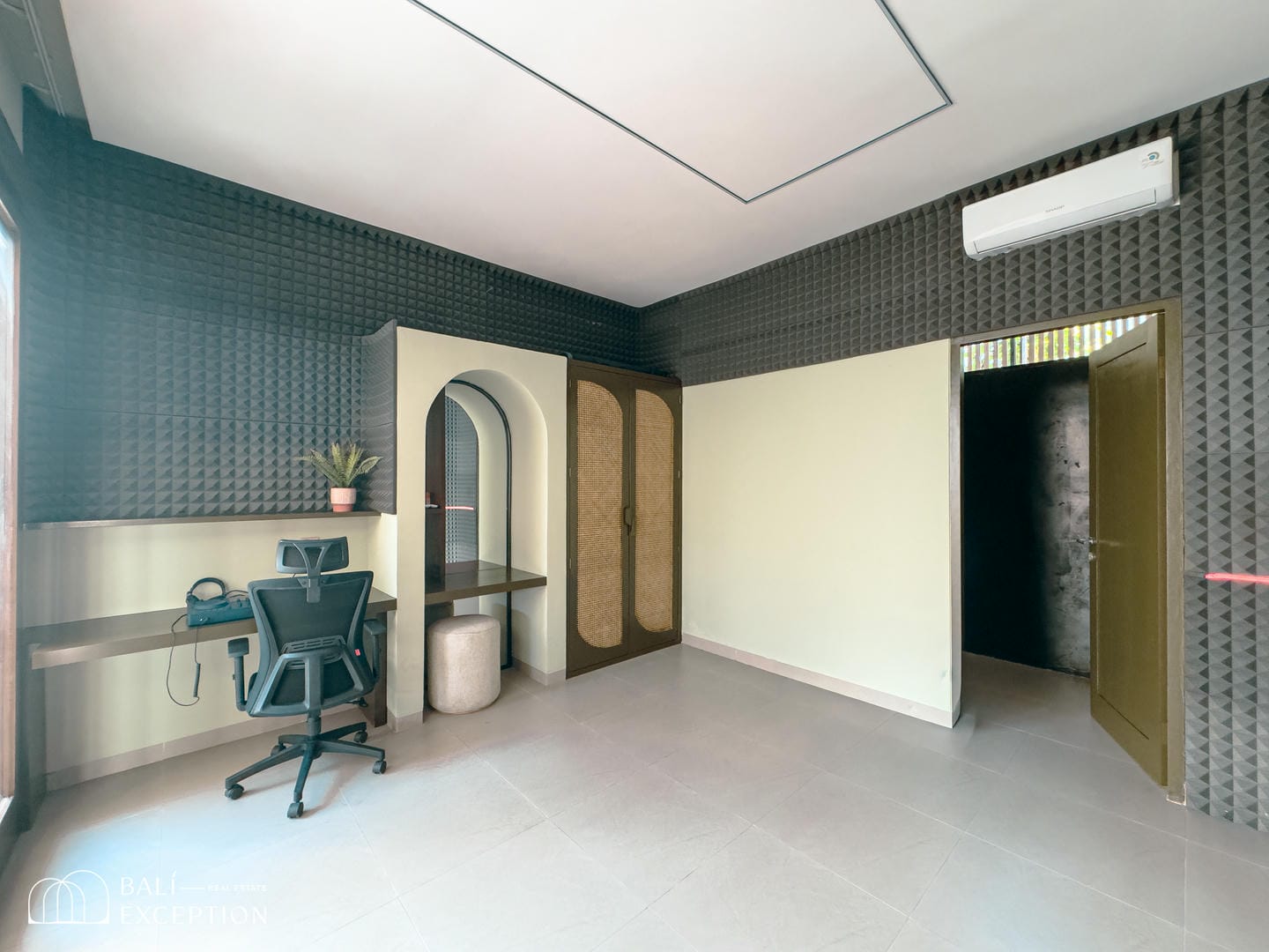 Inspiring Workspace: A luxurious bedroom on the ground floor with a working table and serene pool views.