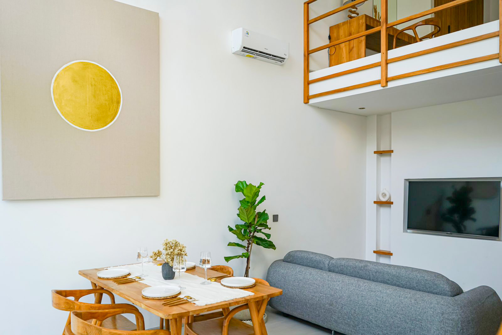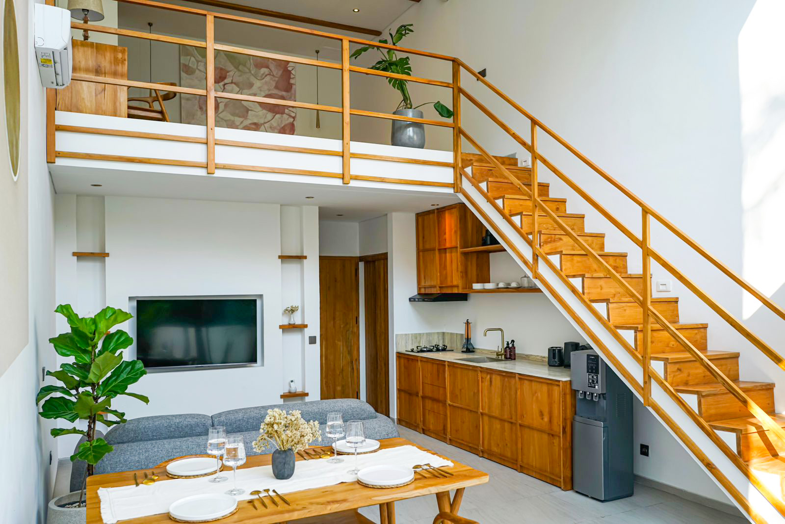 This off-plan mezzanine-style villa features 1 bedroom with an ensuite, offering a stylish and functional layout. The enclosed living room comes with high ceilings and large windows, creating a bright and airy atmosphere. It also includes an equipped kitchen and a cozy dining area.