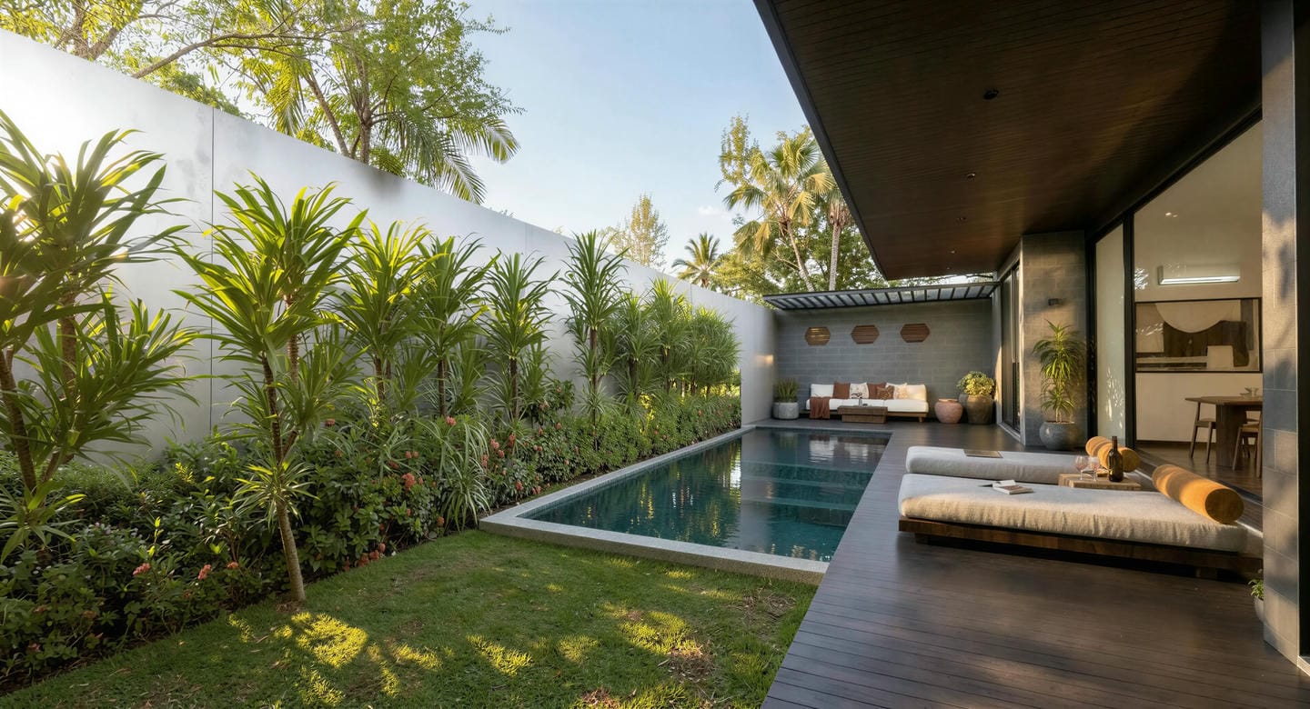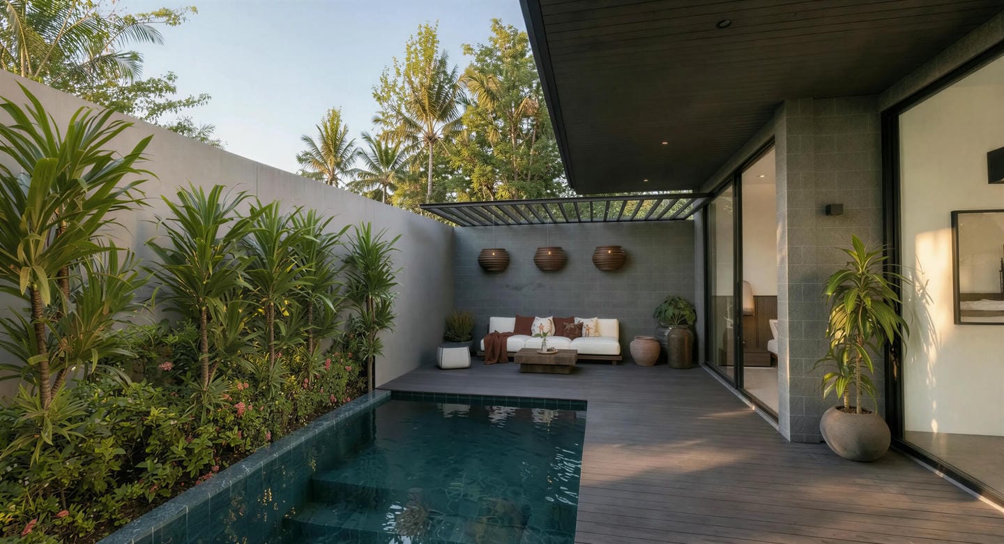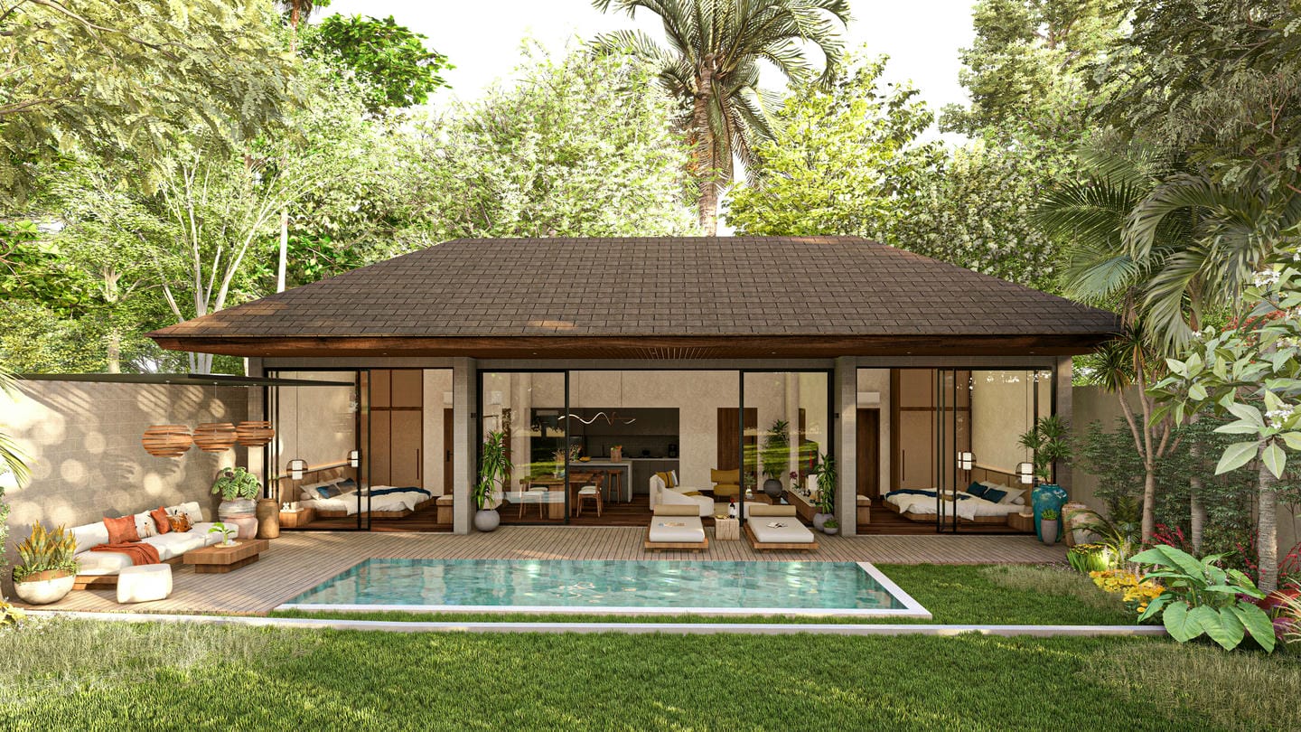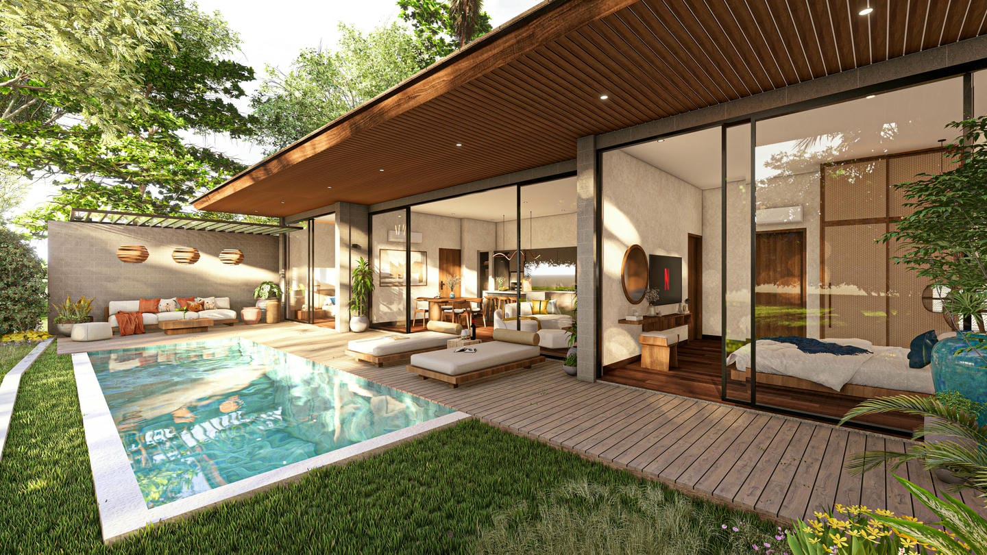 Outdoors, the villa features a spacious private garden with lush green lawns, an expansive Ulin wood pool deck, and a comfortable seating area perfect for enjoying Bali’s tropical lifestyle, with optional features such as a sauna and ice bath for added luxury.