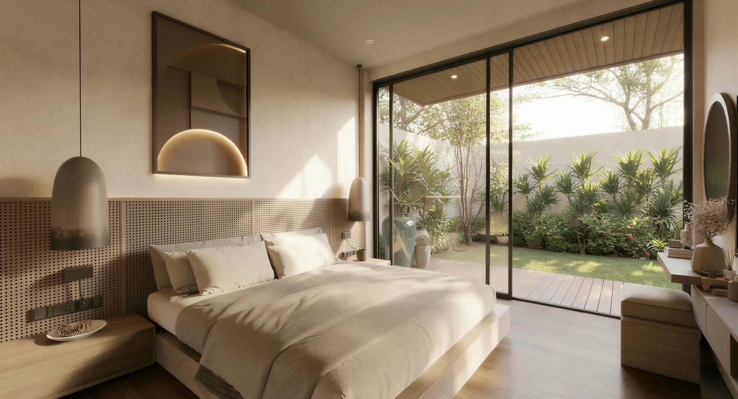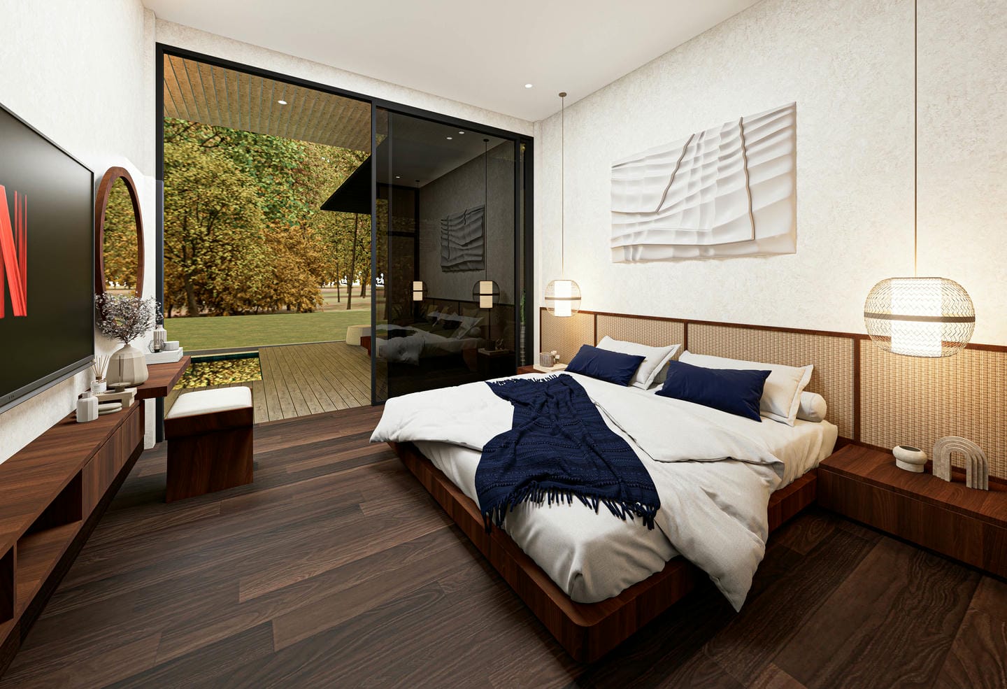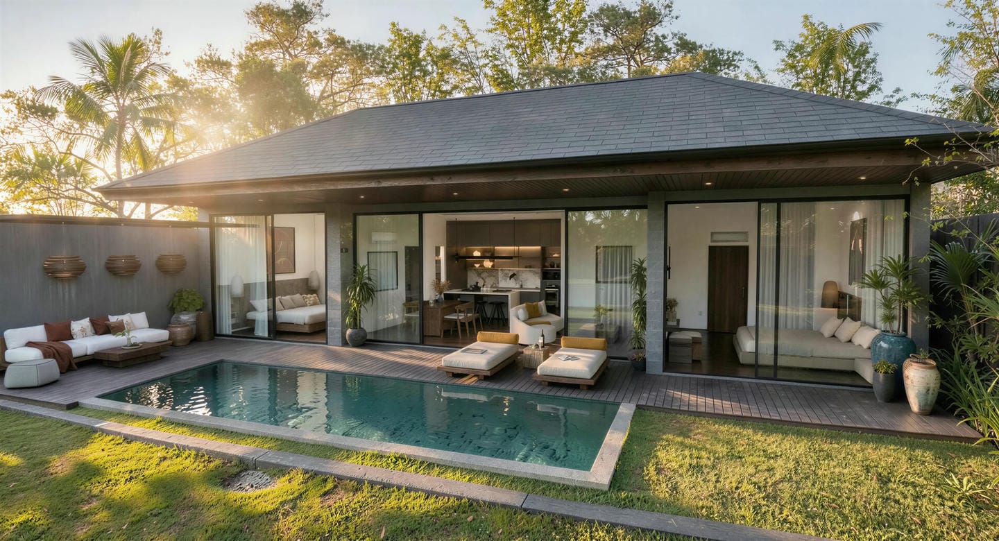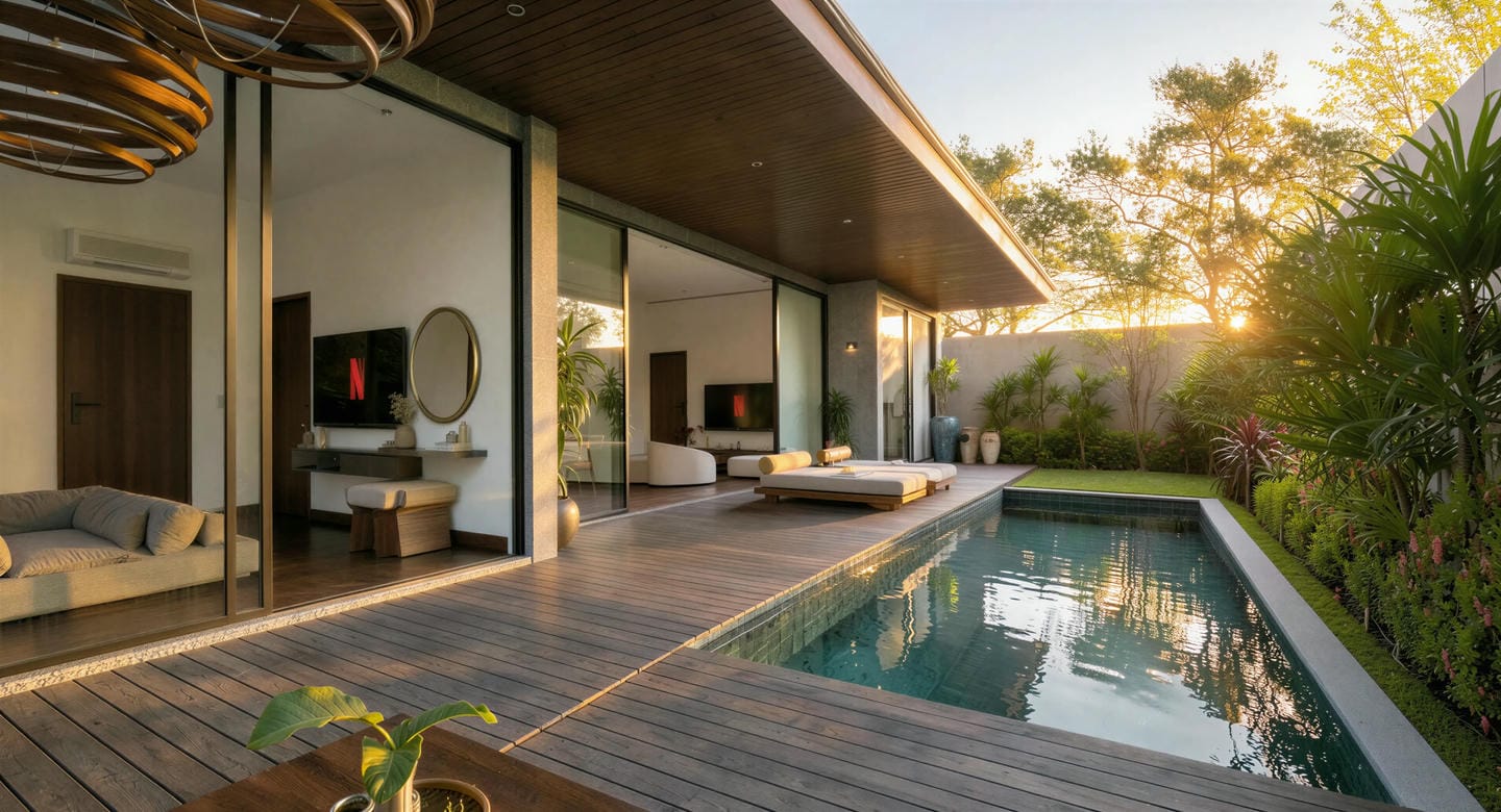 Outdoors, the villa features a spacious private garden with lush green lawns, an expansive Ulin wood pool deck, and a comfortable seating area perfect for enjoying Bali’s tropical lifestyle, with optional features such as a sauna and ice bath for added luxury.