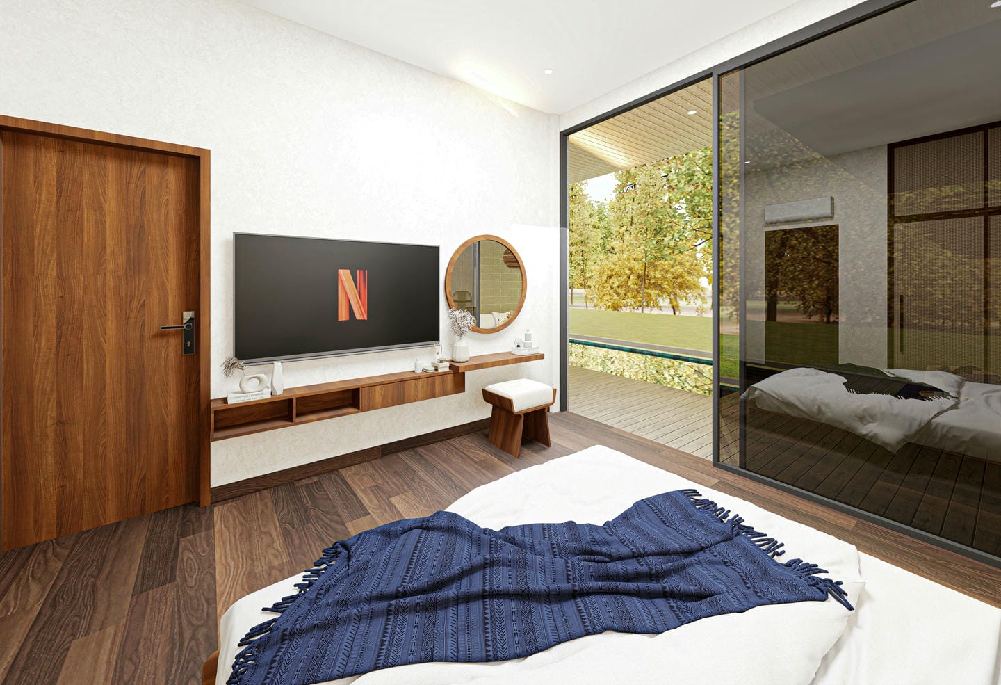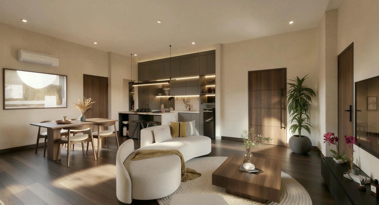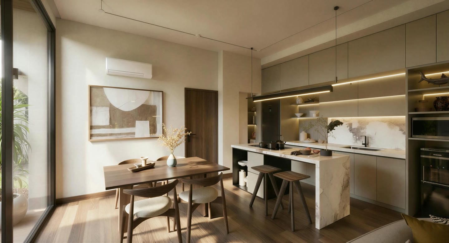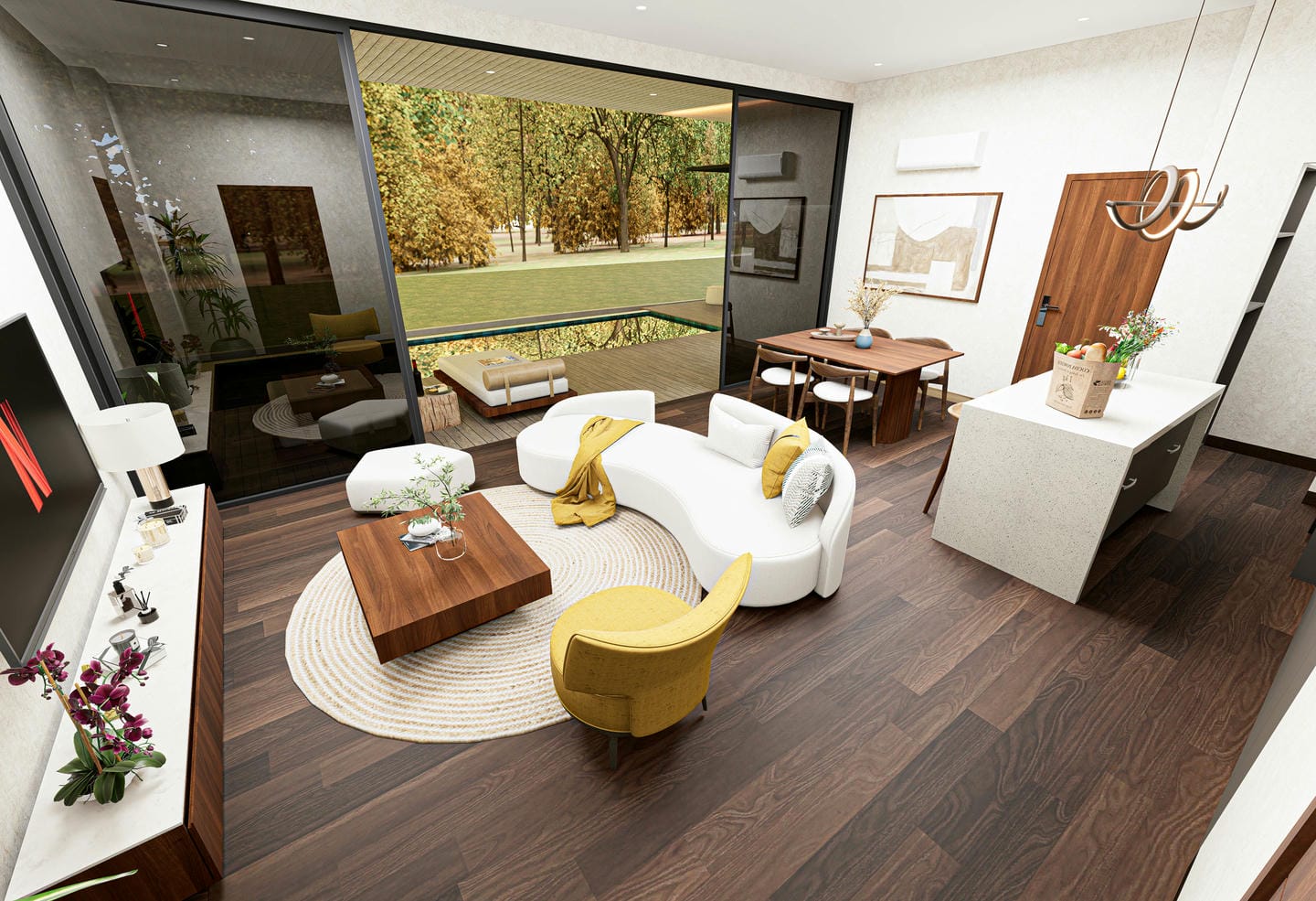 Designed semi-furnished, the villa offers two spacious bedrooms with private ensuite bathrooms and an extra guest bathroom. Its open-plan layout features large windows that bring in natural light and connect indoor and outdoor spaces. At the center of the home is a cozy living area, a modern fully equipped kitchen, and a comfortable dining area.