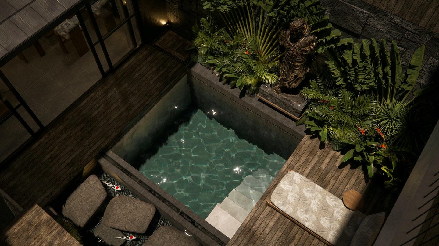 Step outside to enjoy your private pool with sunbeds, a zen patio lounge area perfect for relaxing or entertaining, and private parking for added convenience.