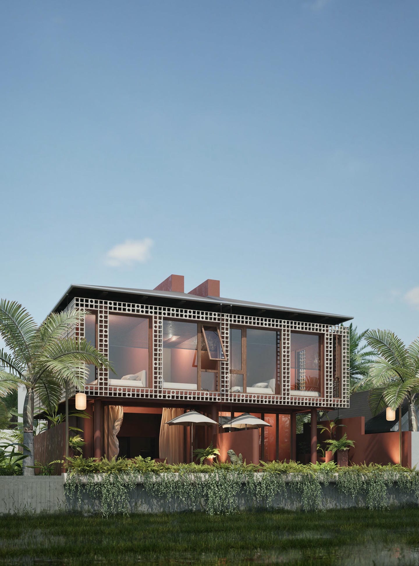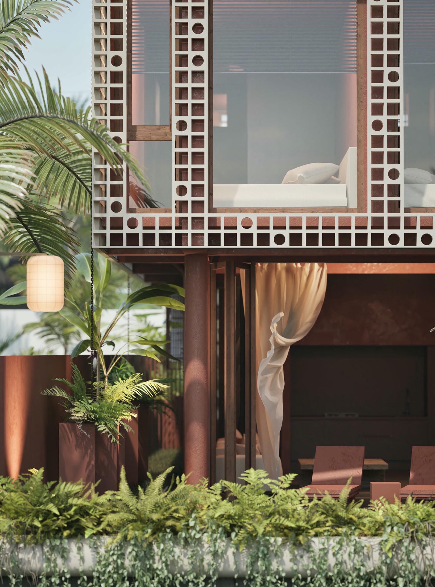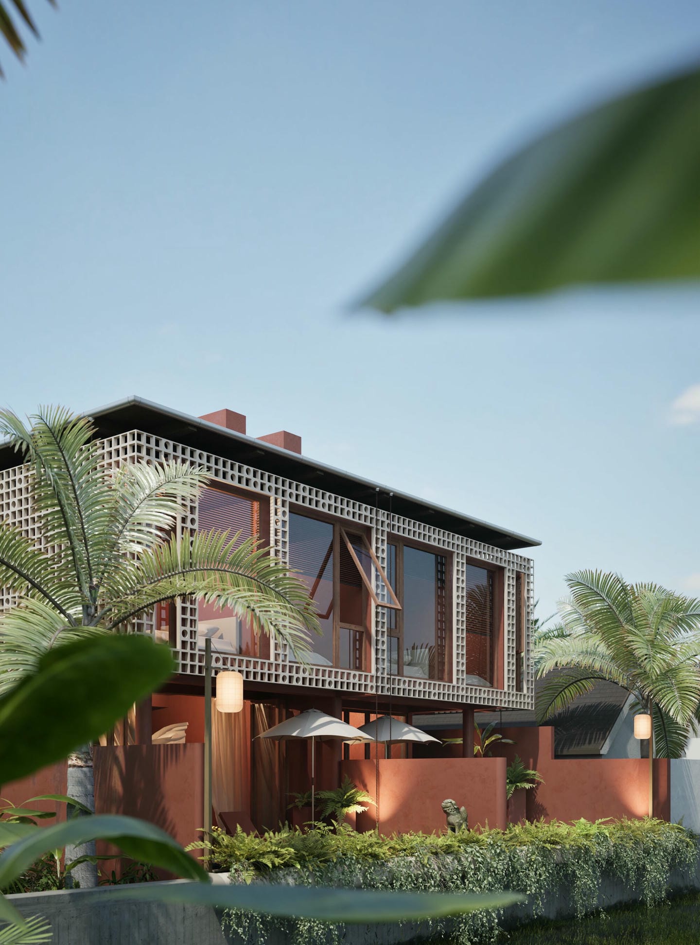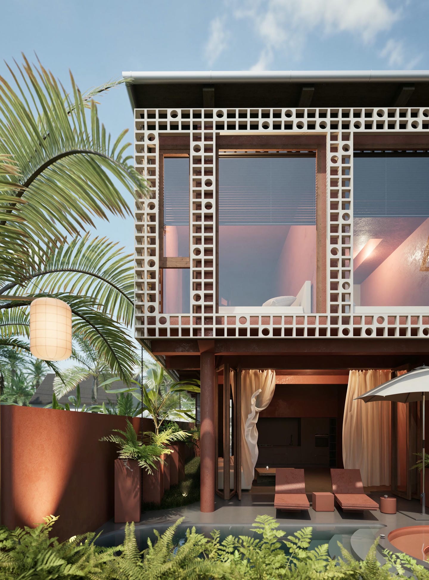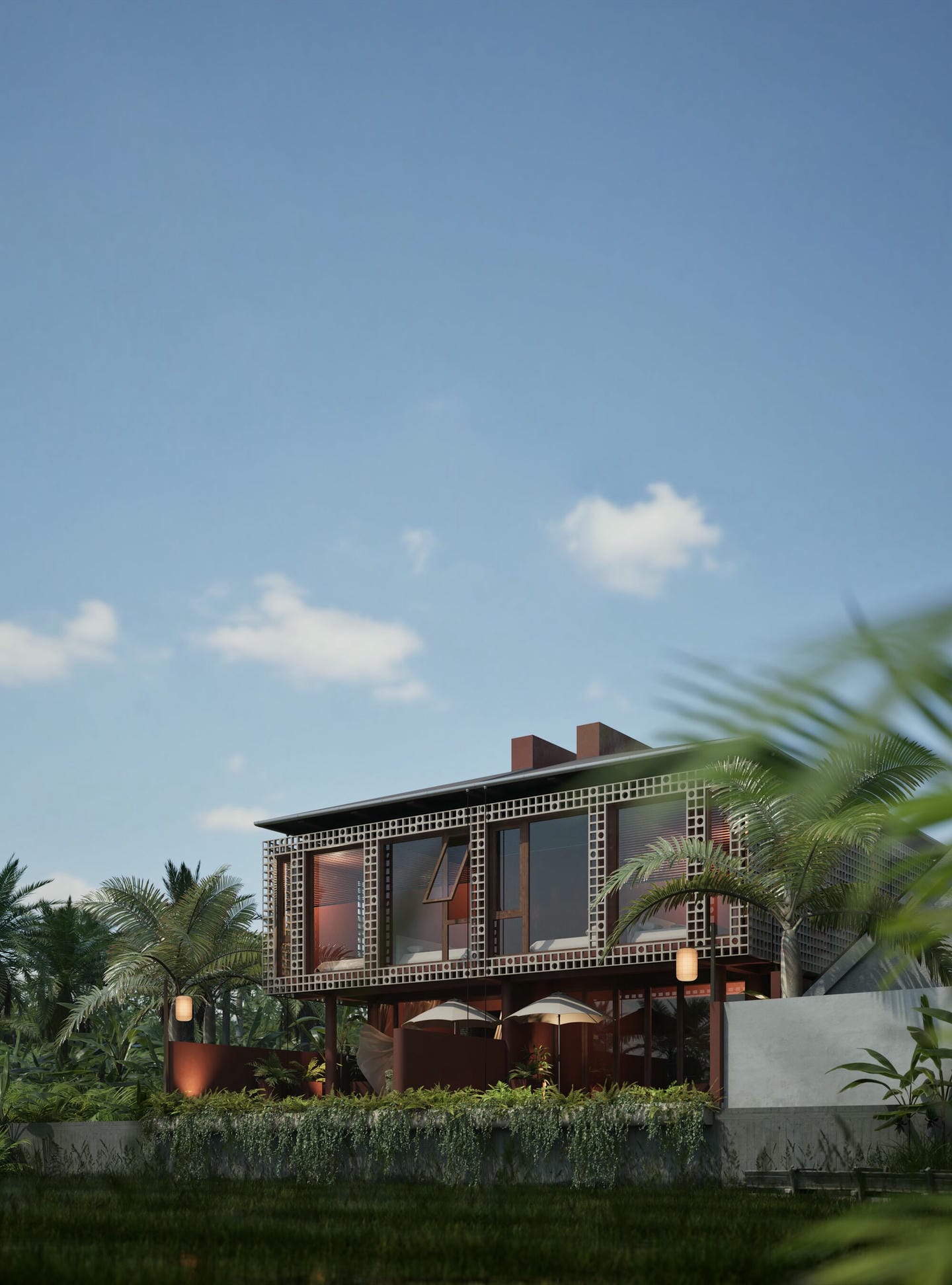 The interior features a warm modern tropical design with earthy tones, organic textures, and contemporary furnishings that create a cozy yet stylish atmosphere.