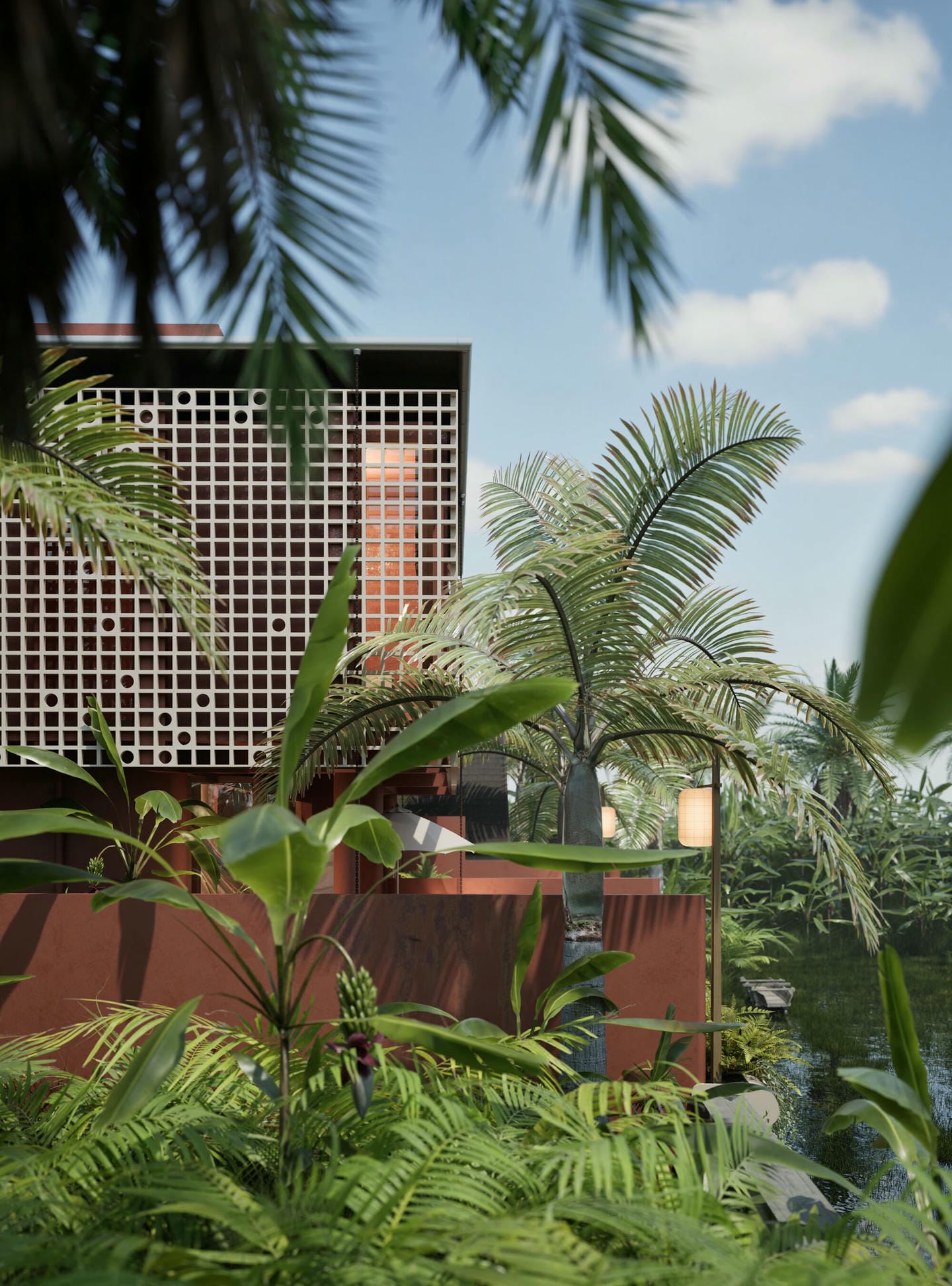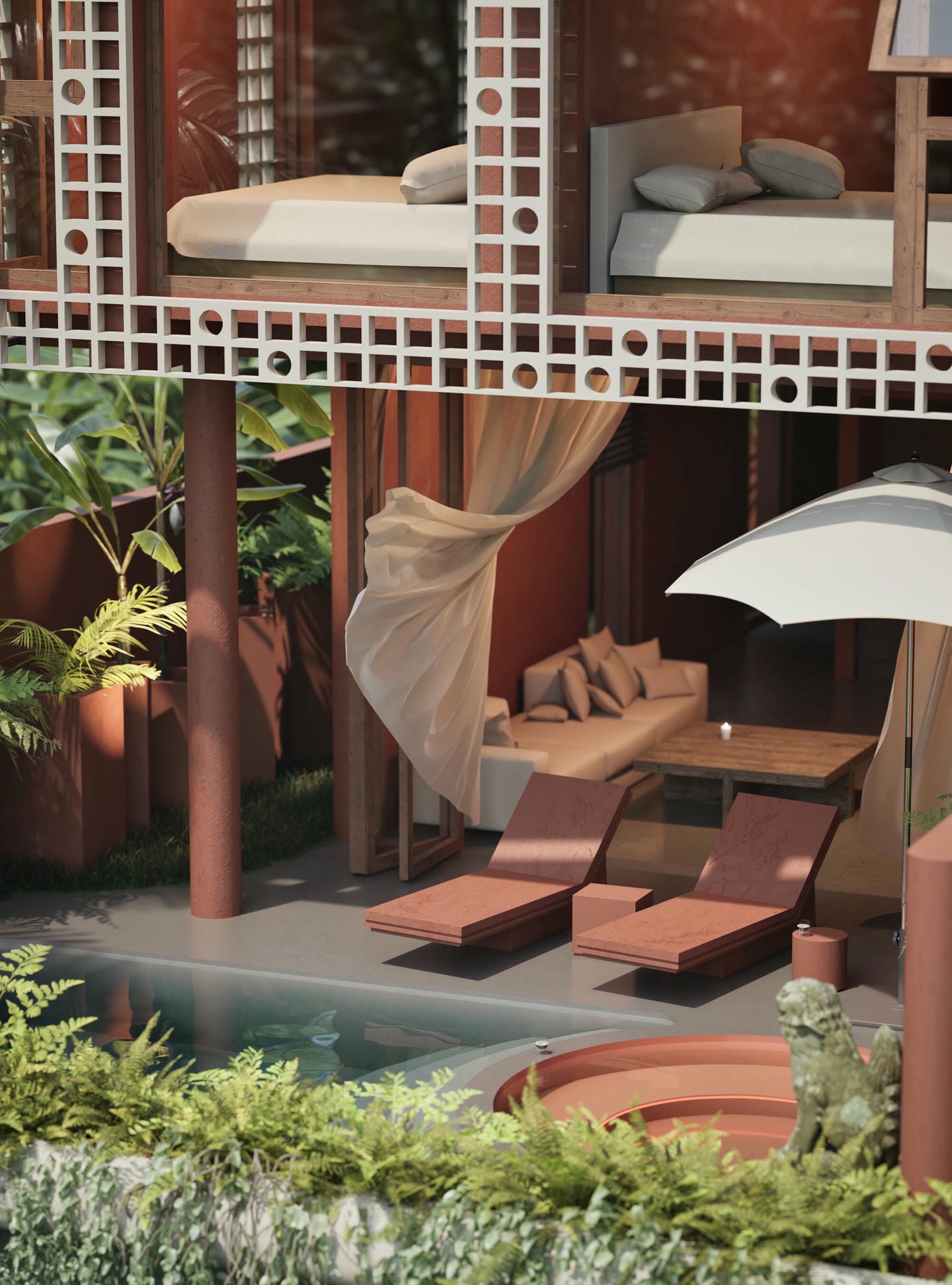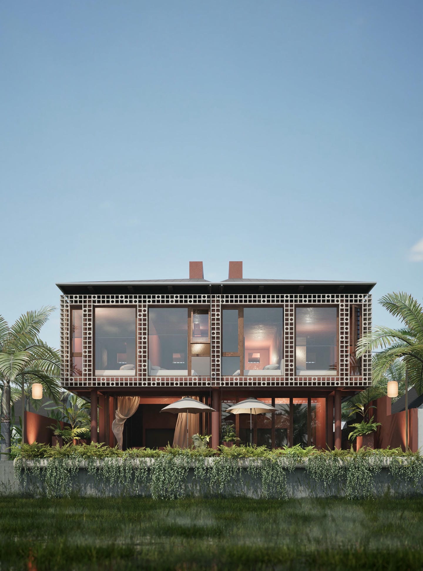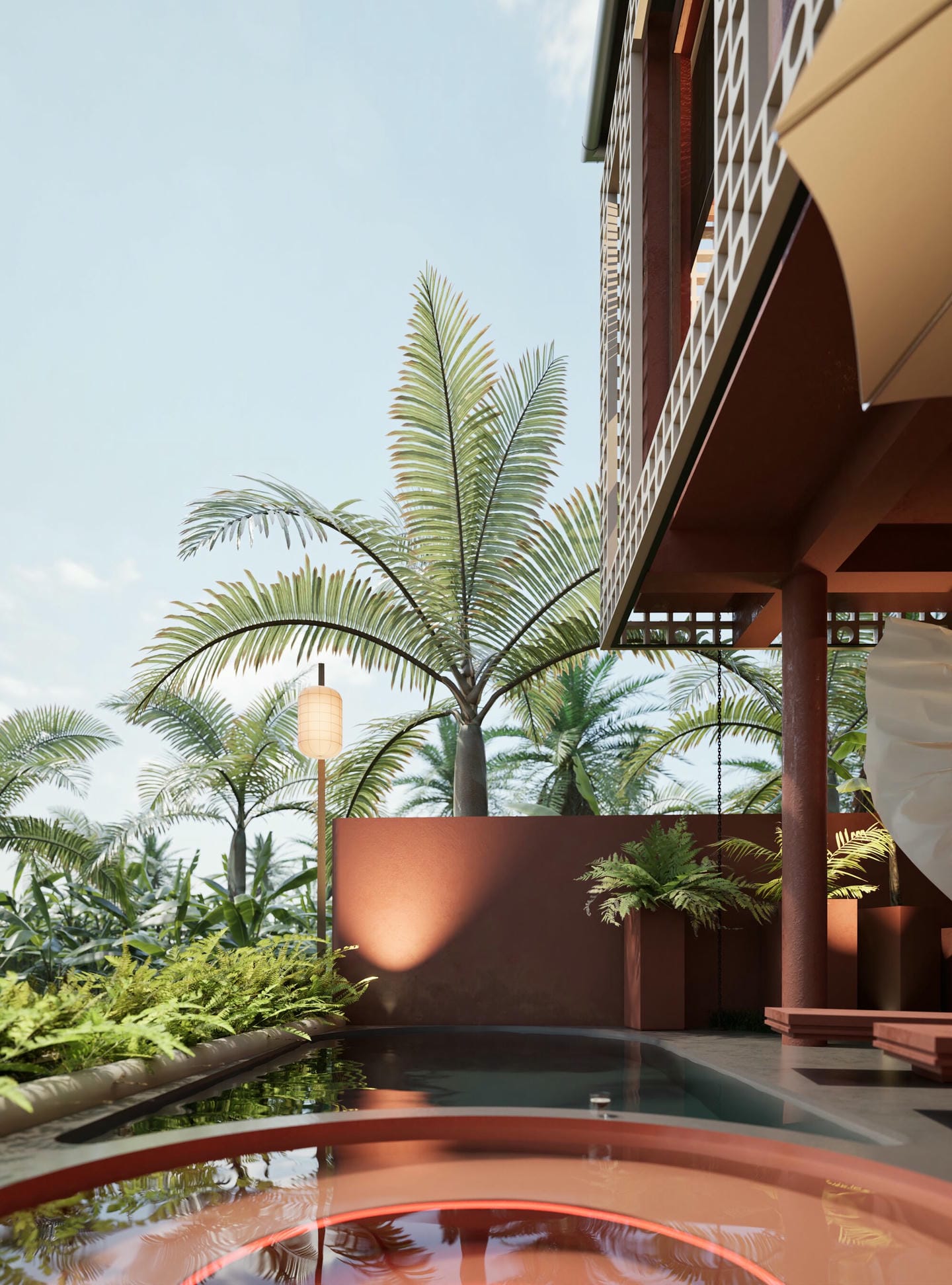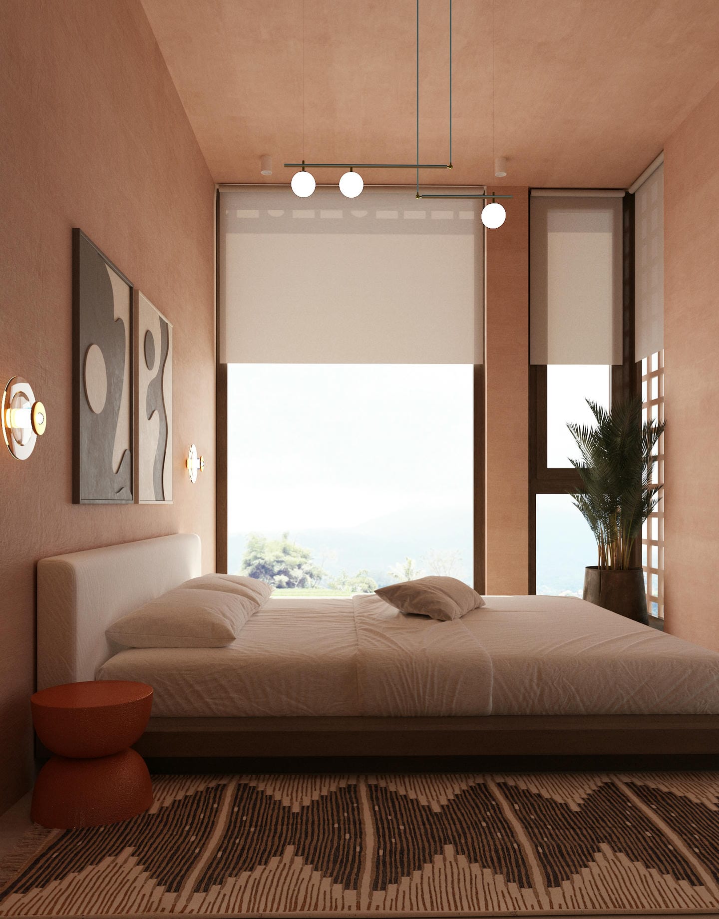 The interior features a warm modern tropical design with earthy tones, organic textures, and contemporary furnishings that create a cozy yet stylish atmosphere.
