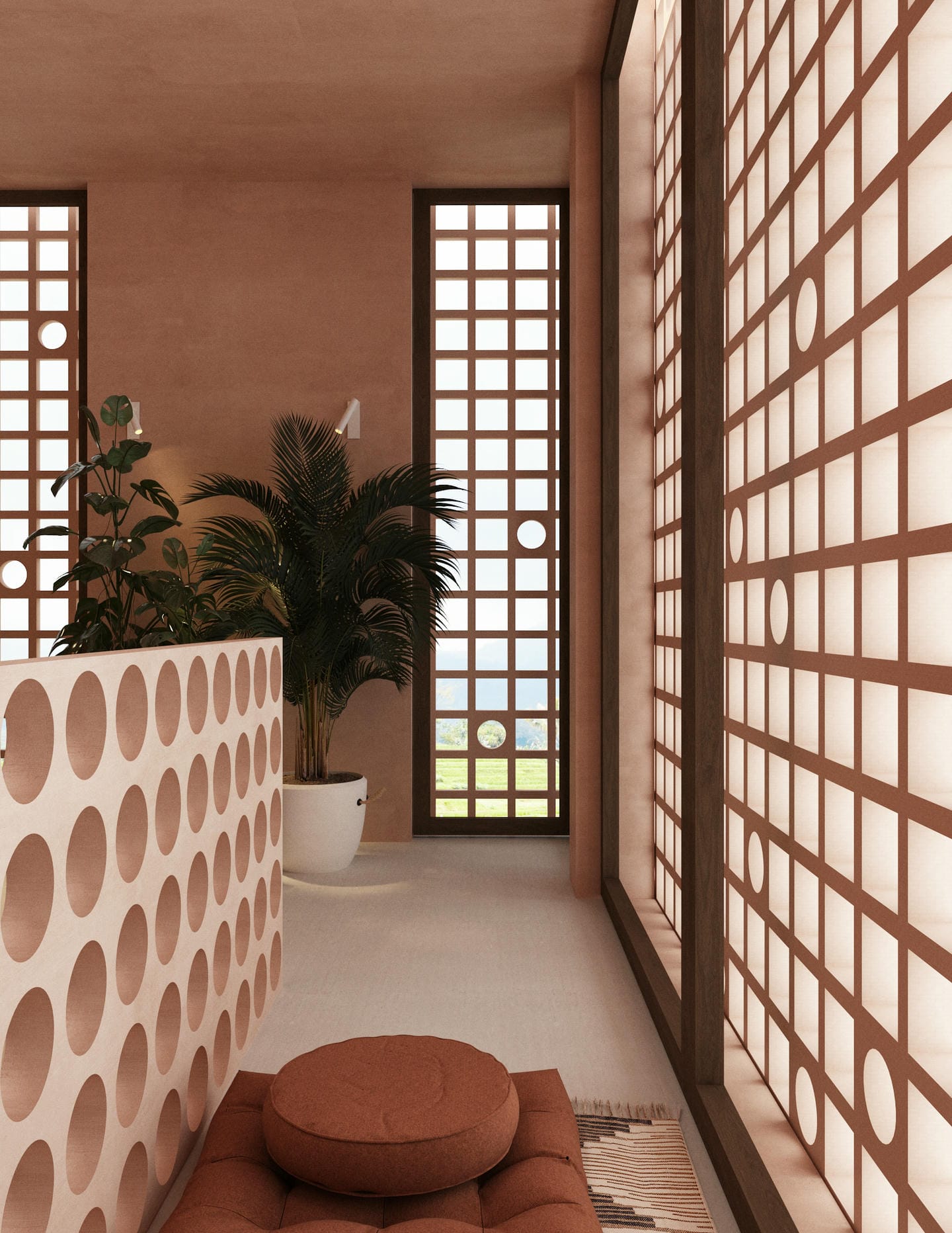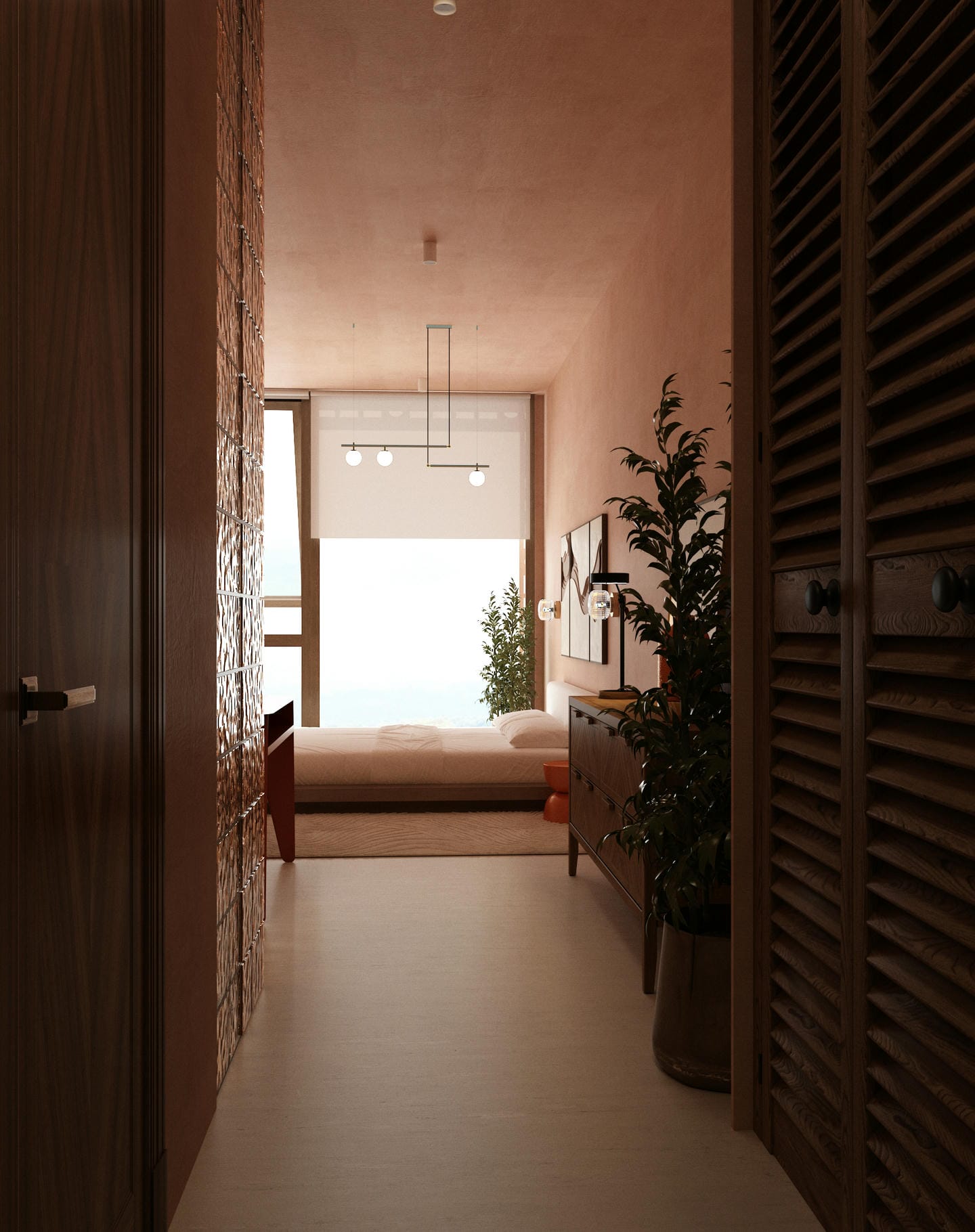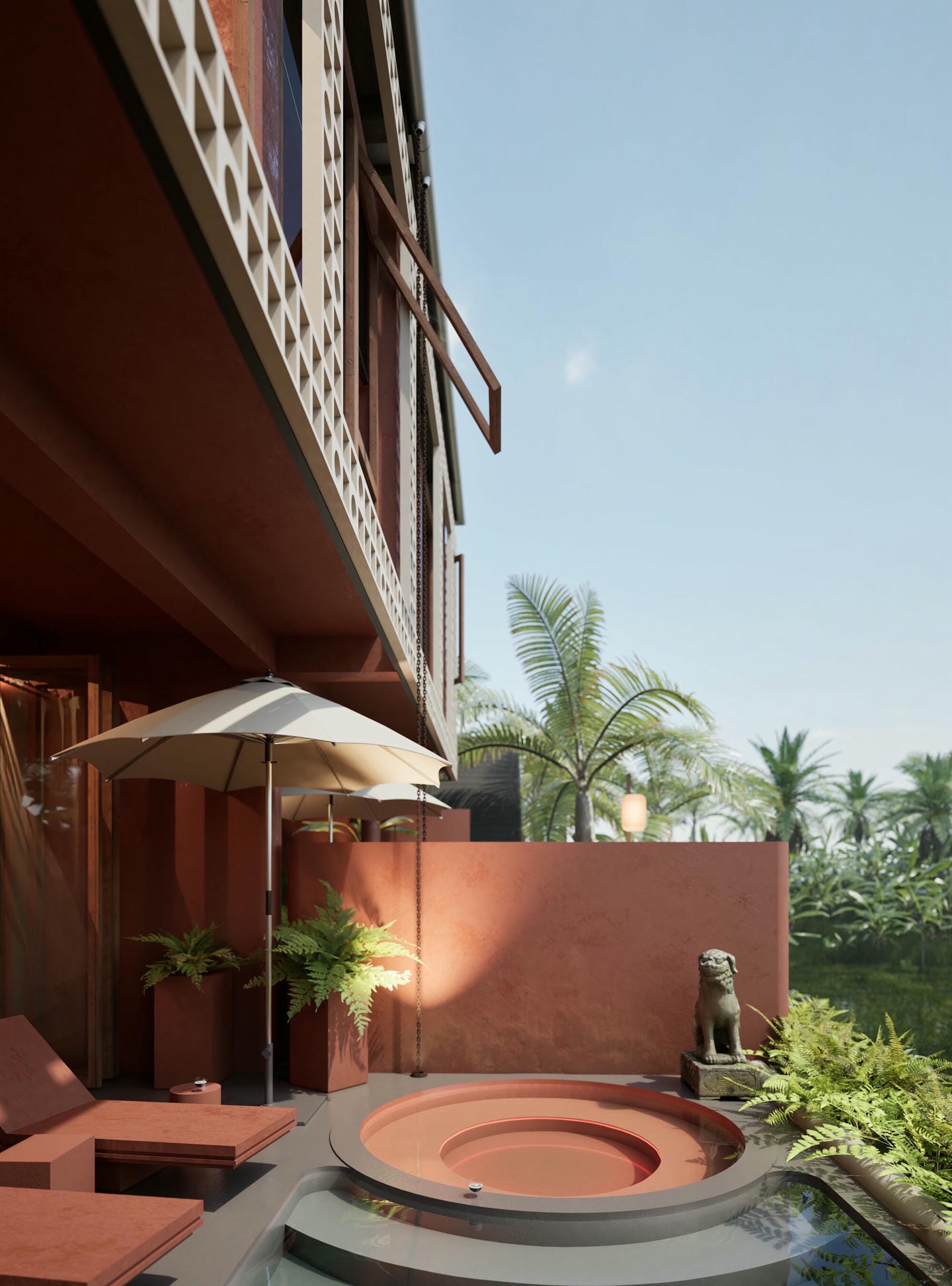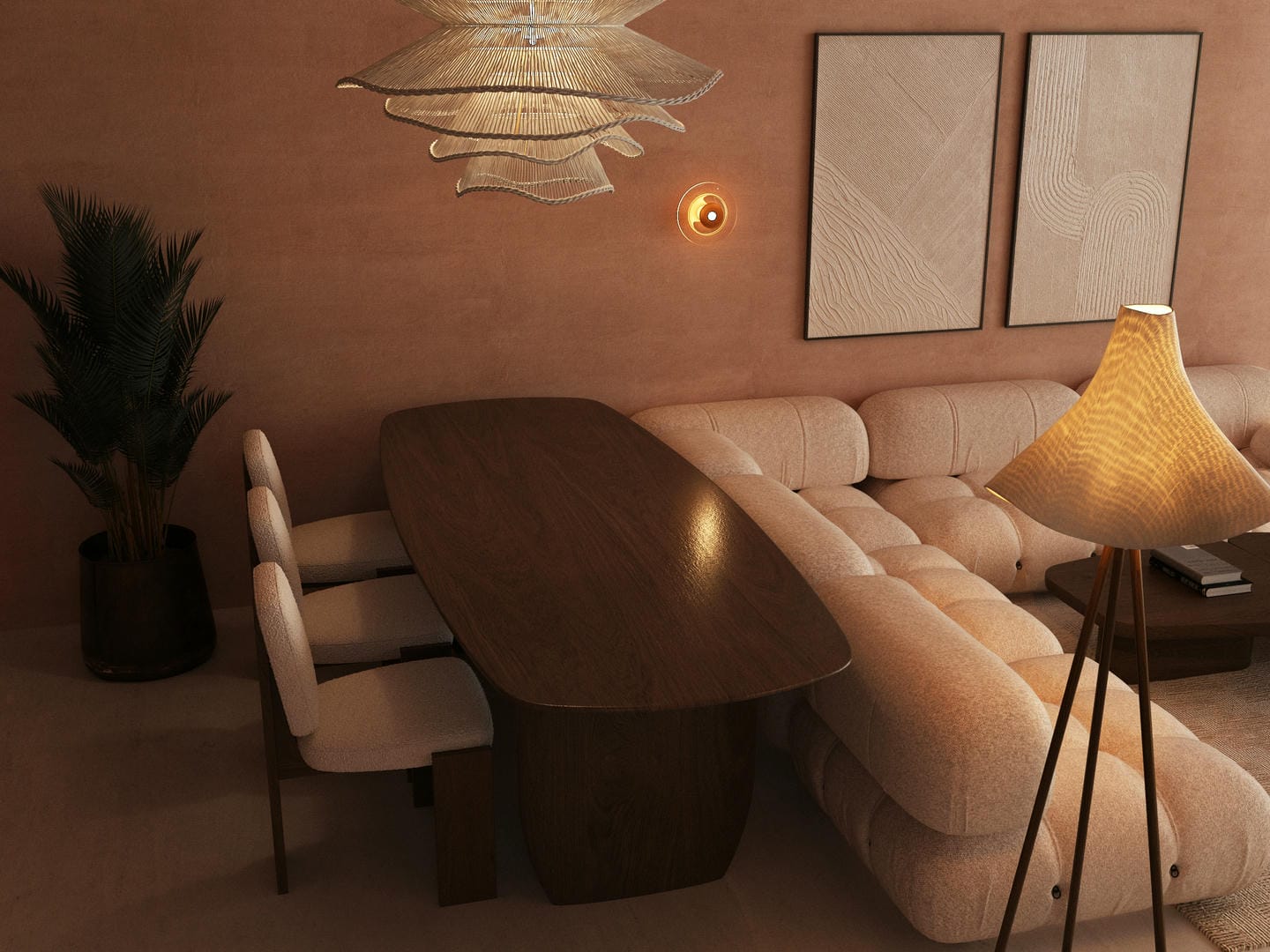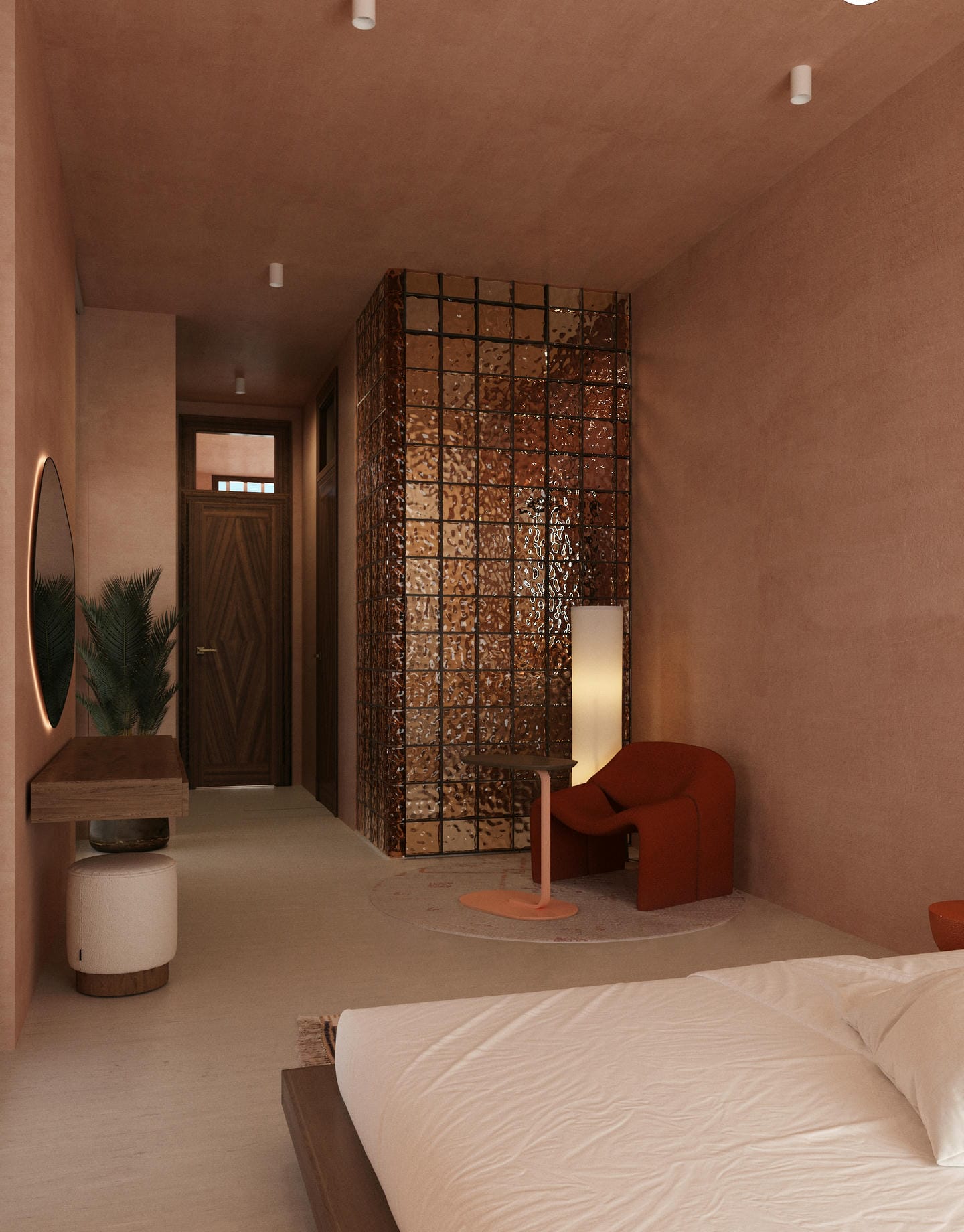 The interior features a warm modern tropical design with earthy tones, organic textures, and contemporary furnishings that create a cozy yet stylish atmosphere.