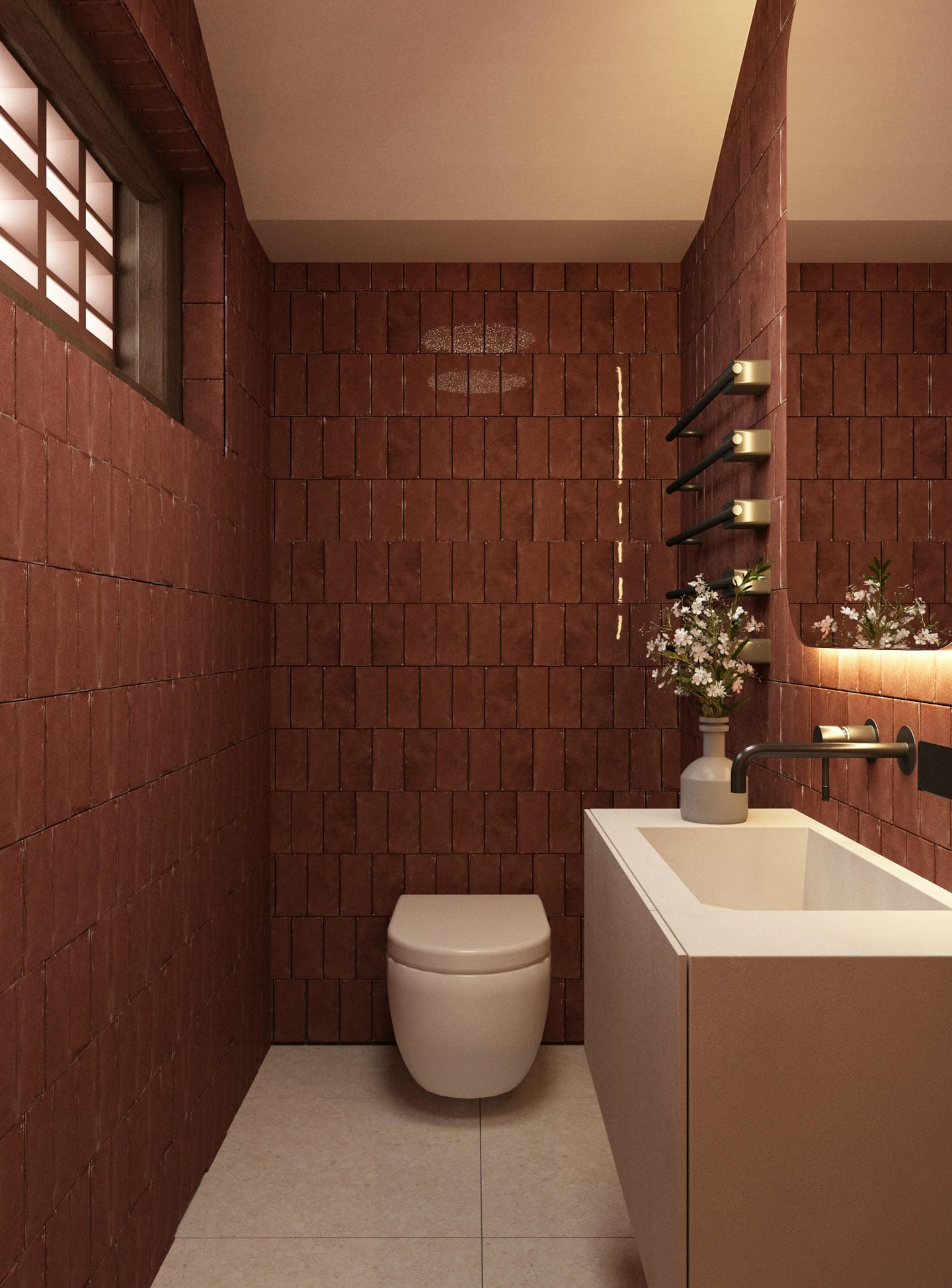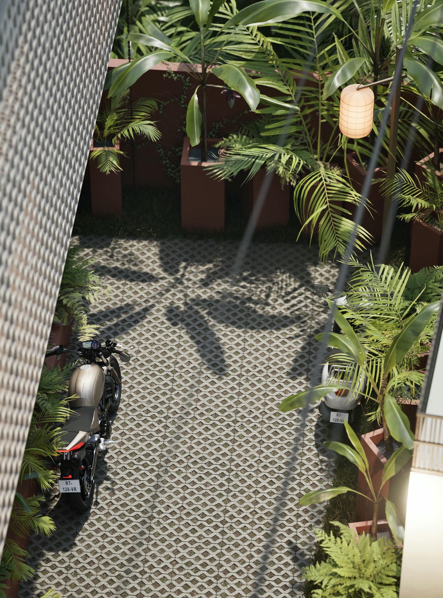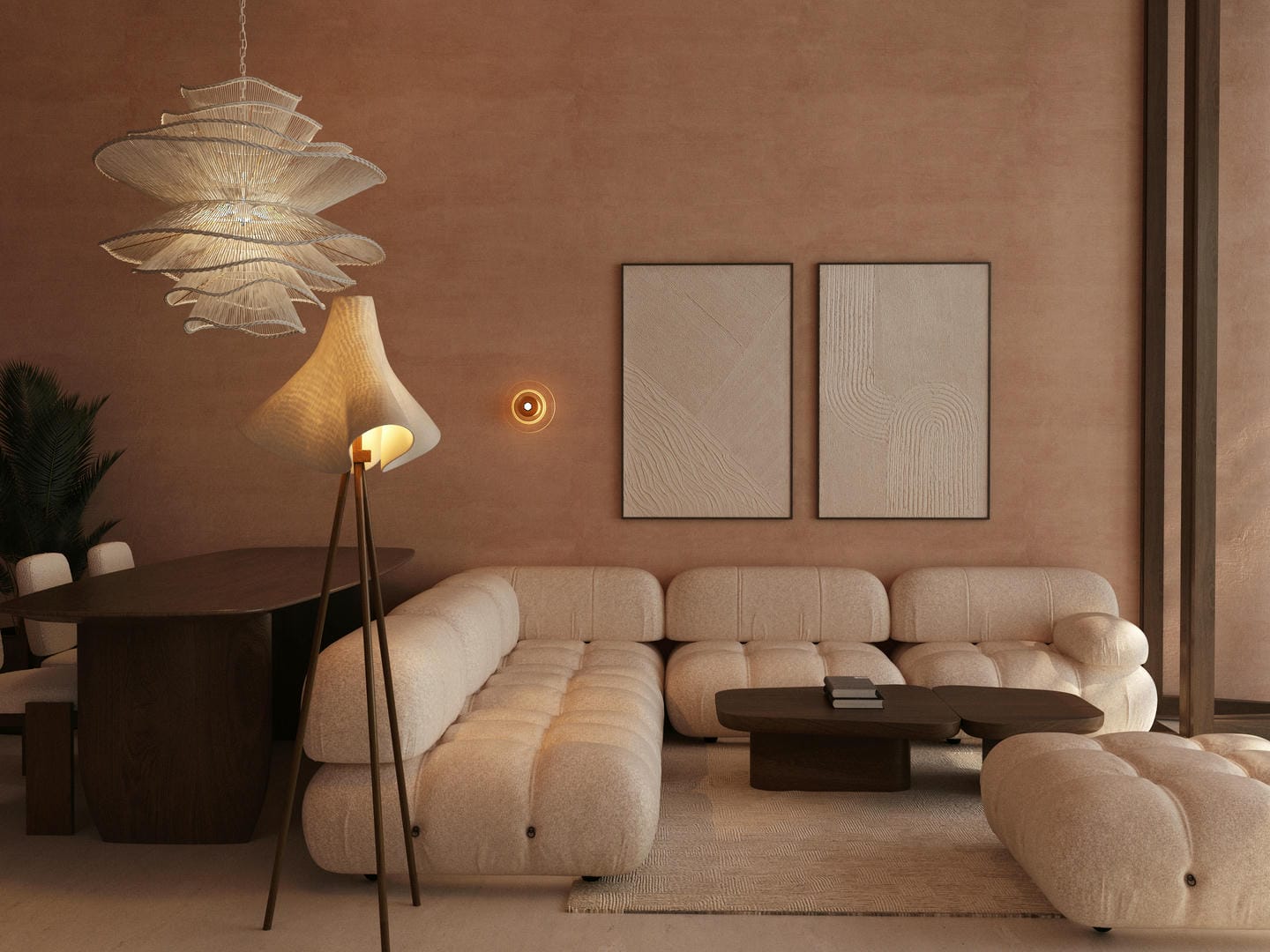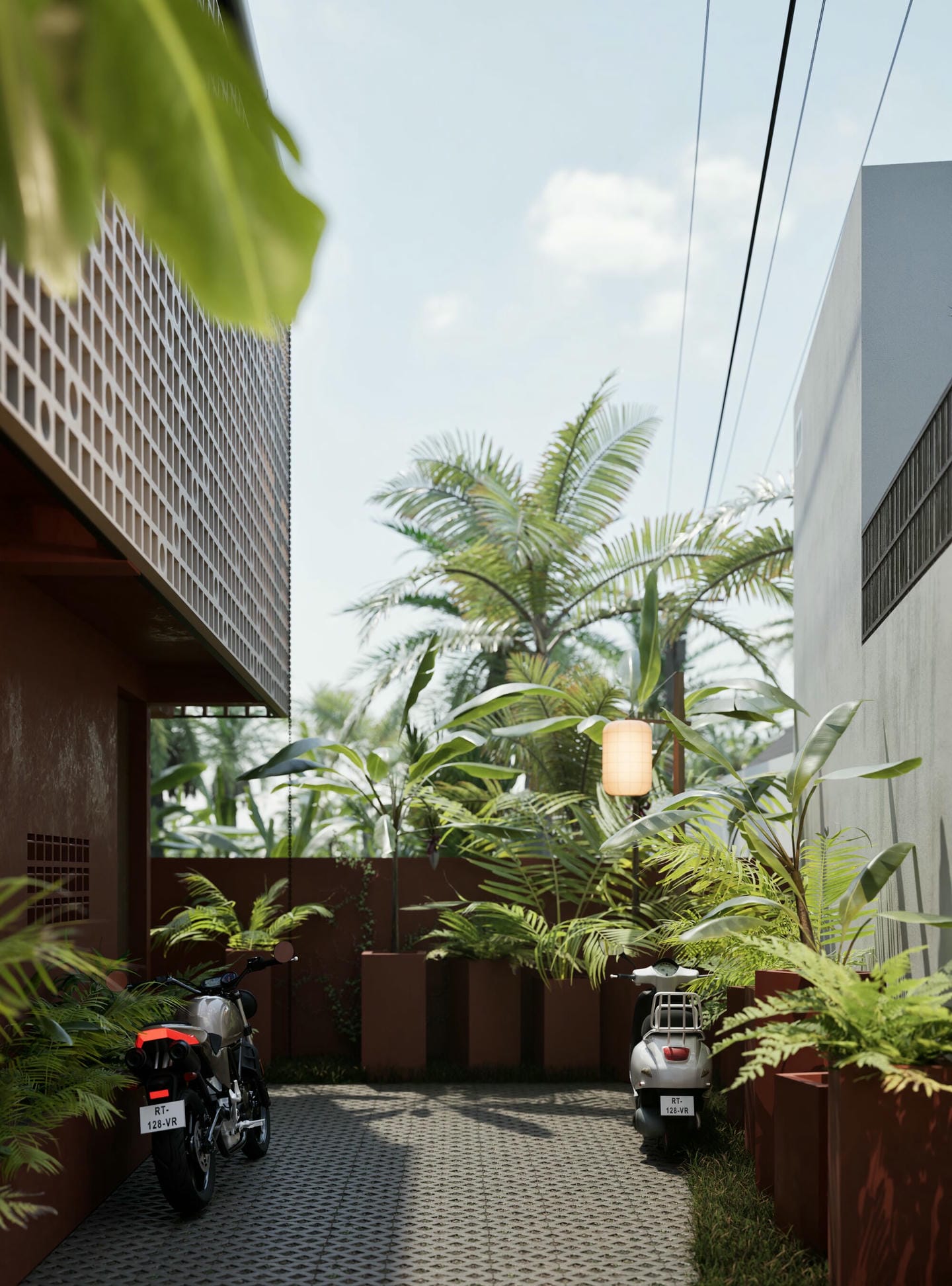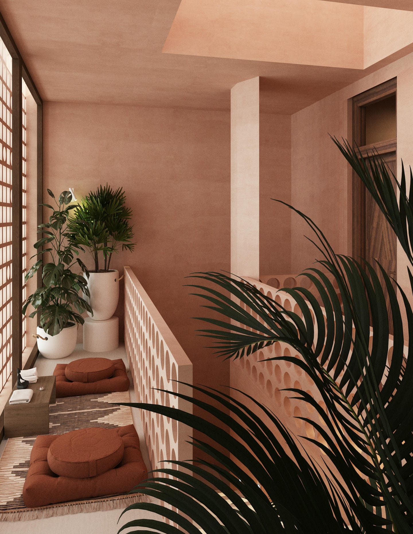 The interior features a warm modern tropical design with earthy tones, organic textures, and contemporary furnishings that create a cozy yet stylish atmosphere.