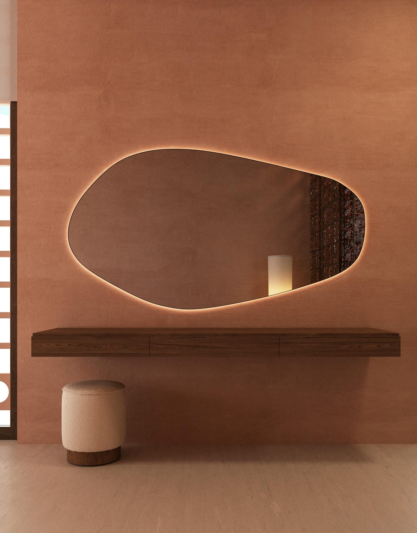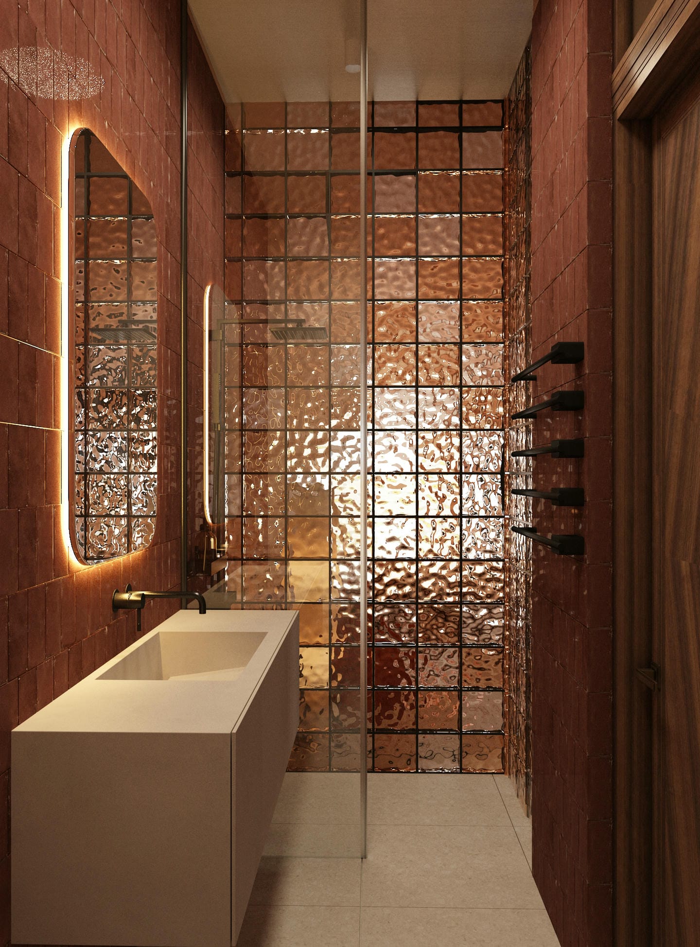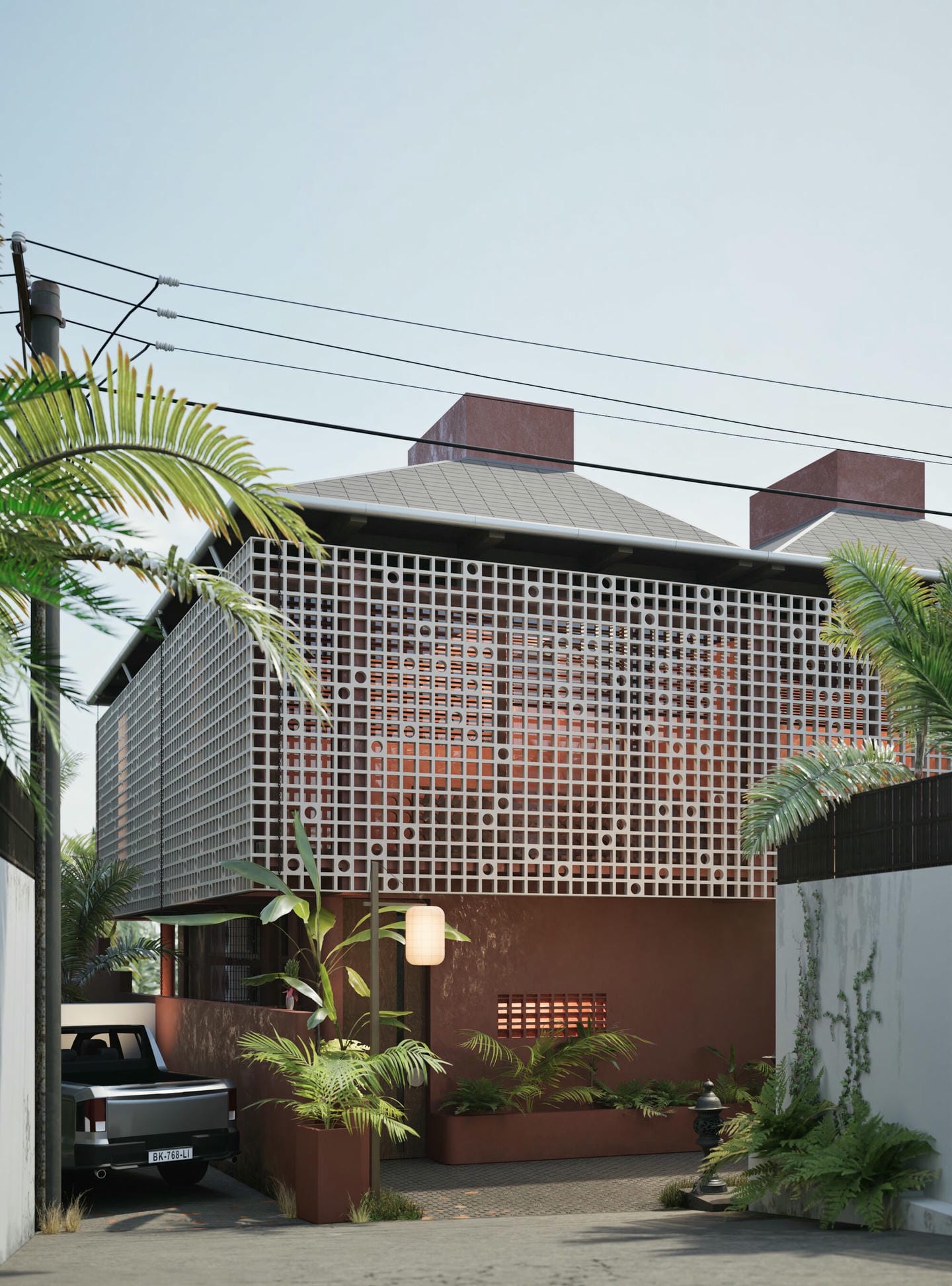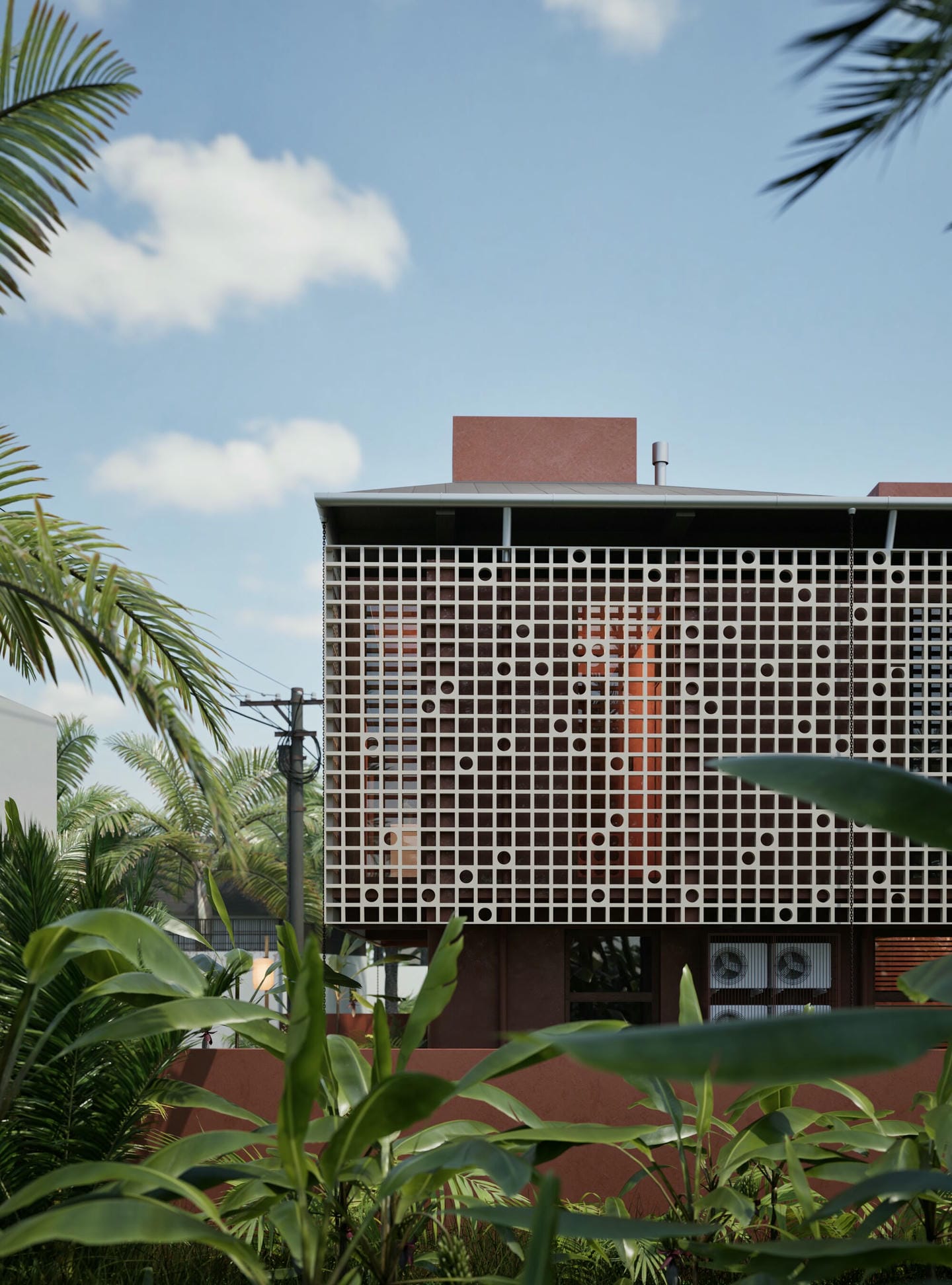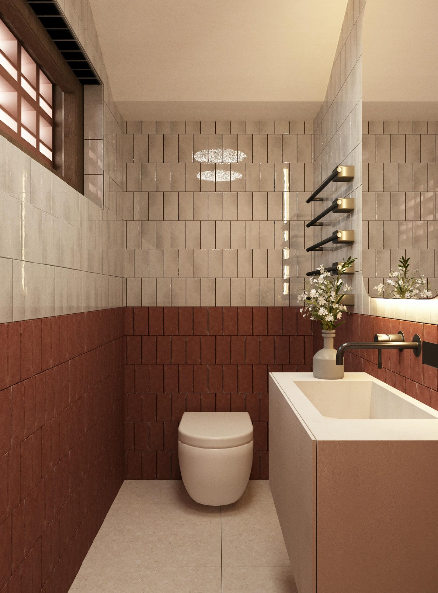 The interior features a warm modern tropical design with earthy tones, organic textures, and contemporary furnishings that create a cozy yet stylish atmosphere.