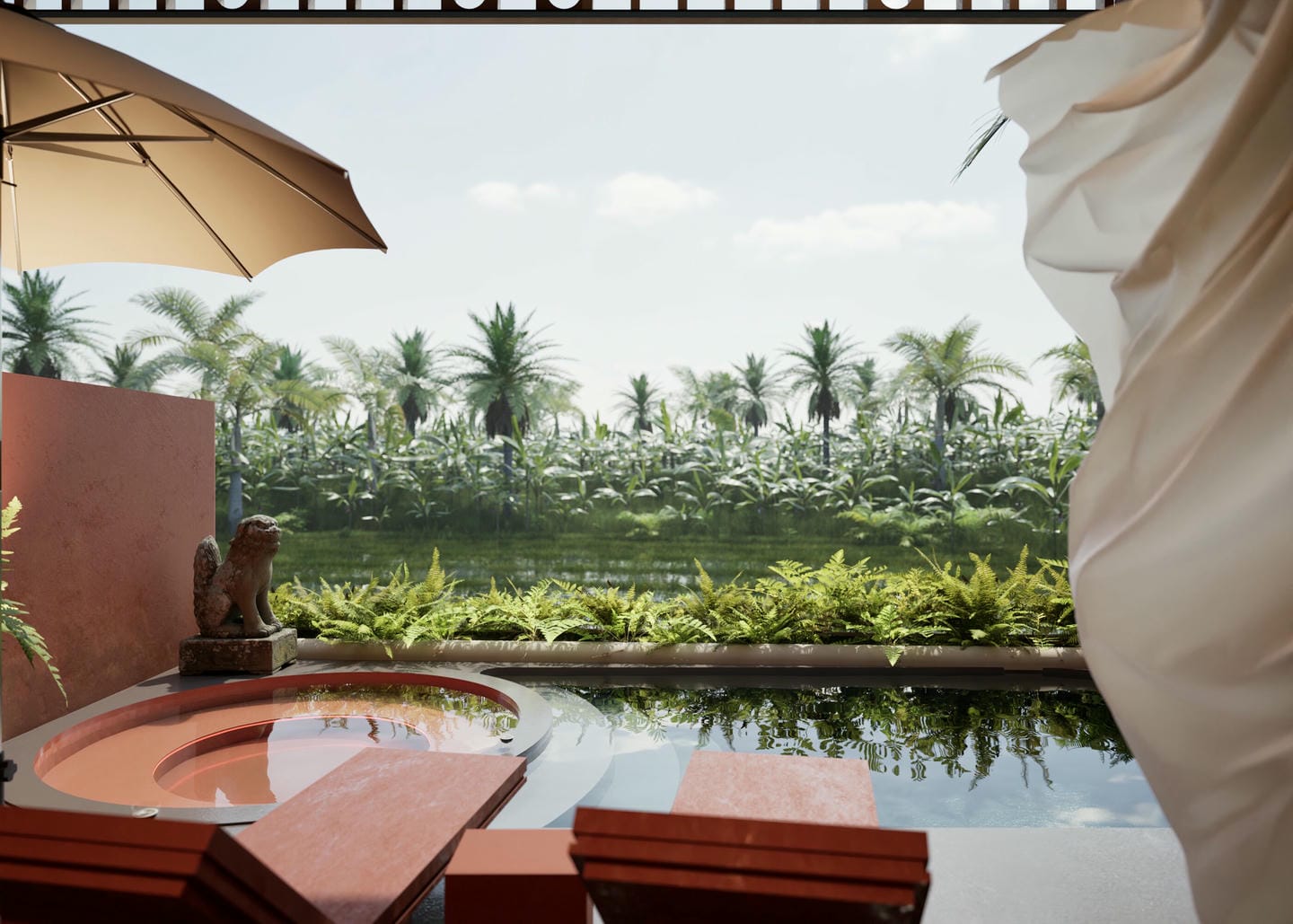 Step outside to a private pool area surrounded by lush tropical greenery, complemented by views of palm groves and rice fields that give a true Balinese charm.