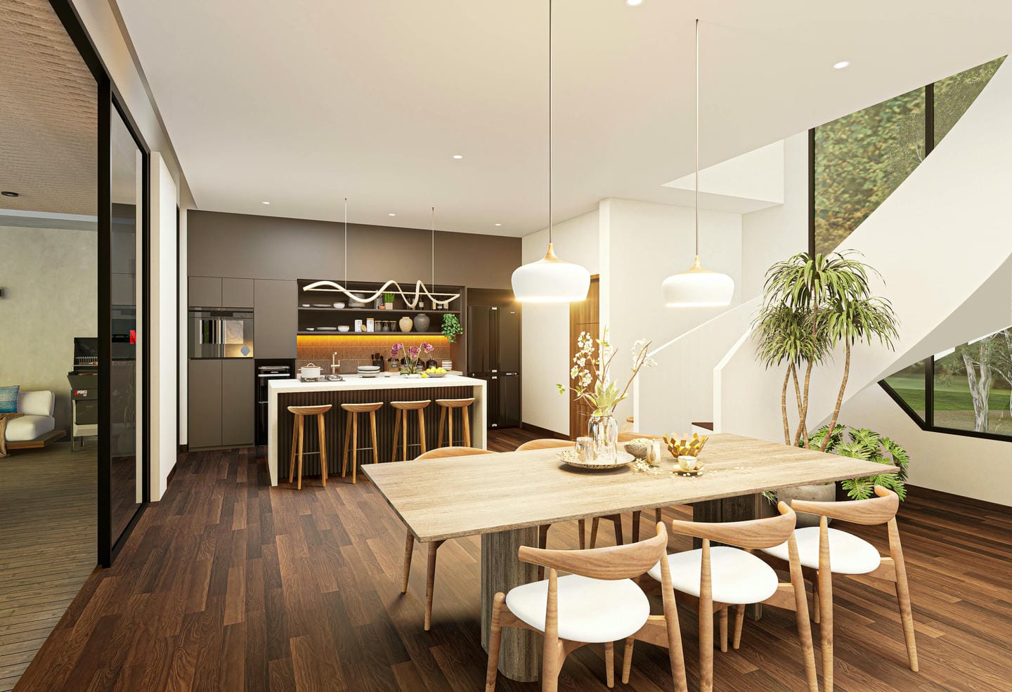 Designed semi-furnished, the villa offers three spacious bedrooms with private ensuite bathrooms and an extra guest bathroom. Its open-plan layout features large windows that bring in natural light and connect indoor and outdoor spaces. At the center of the home is a cozy living area, a modern fully equipped kitchen, and a comfortable dining area.