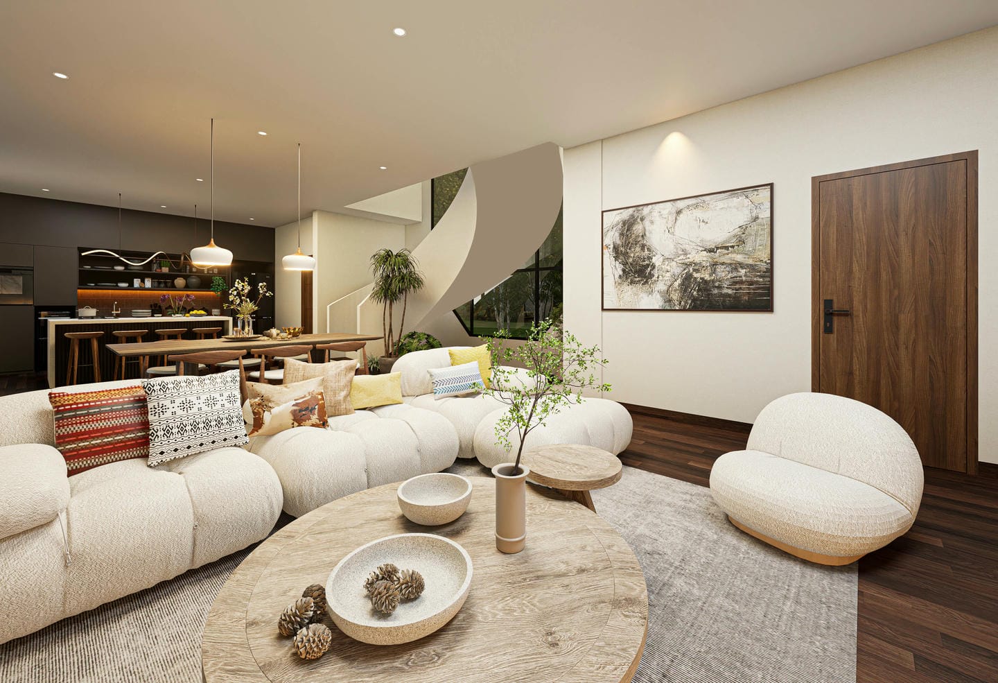 Modern living room with wooden decor and furniture.