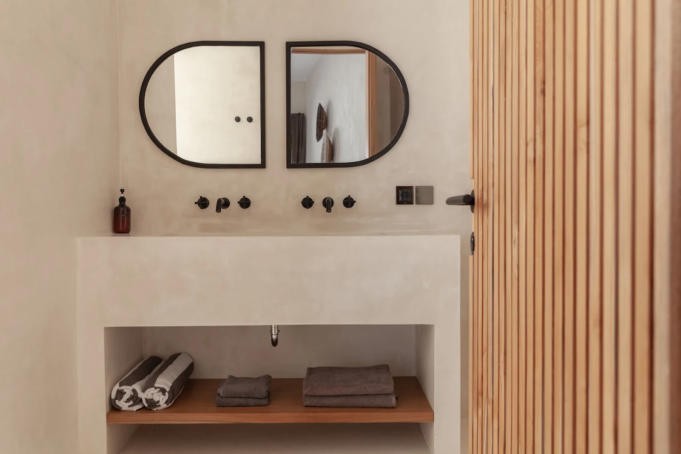 The interiors feature a modern bohemian style, blending natural textures with clean lines. Soft earthy tones, woven accents, and open spaces create a warm and calming atmosphere, while large glass doors allow abundant natural light.