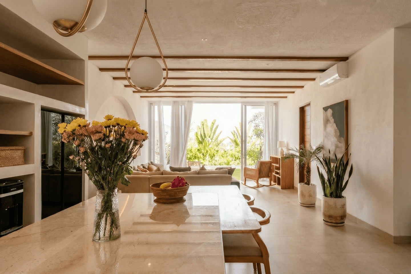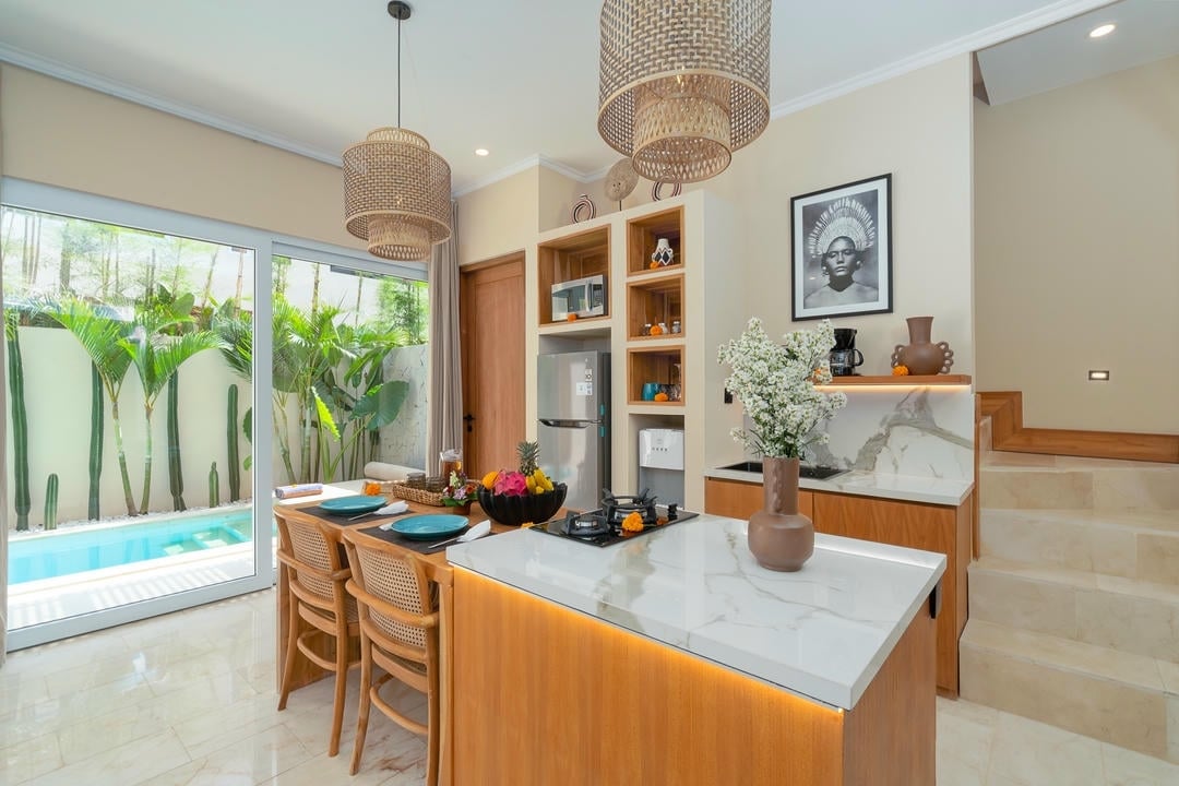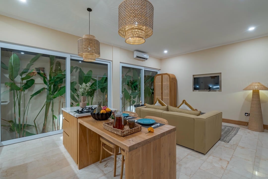 This ready villa features 1 bedroom with an ensuite bathroom, an enclosed living room, and a fully equipped kitchen with a dining area and island bar.
