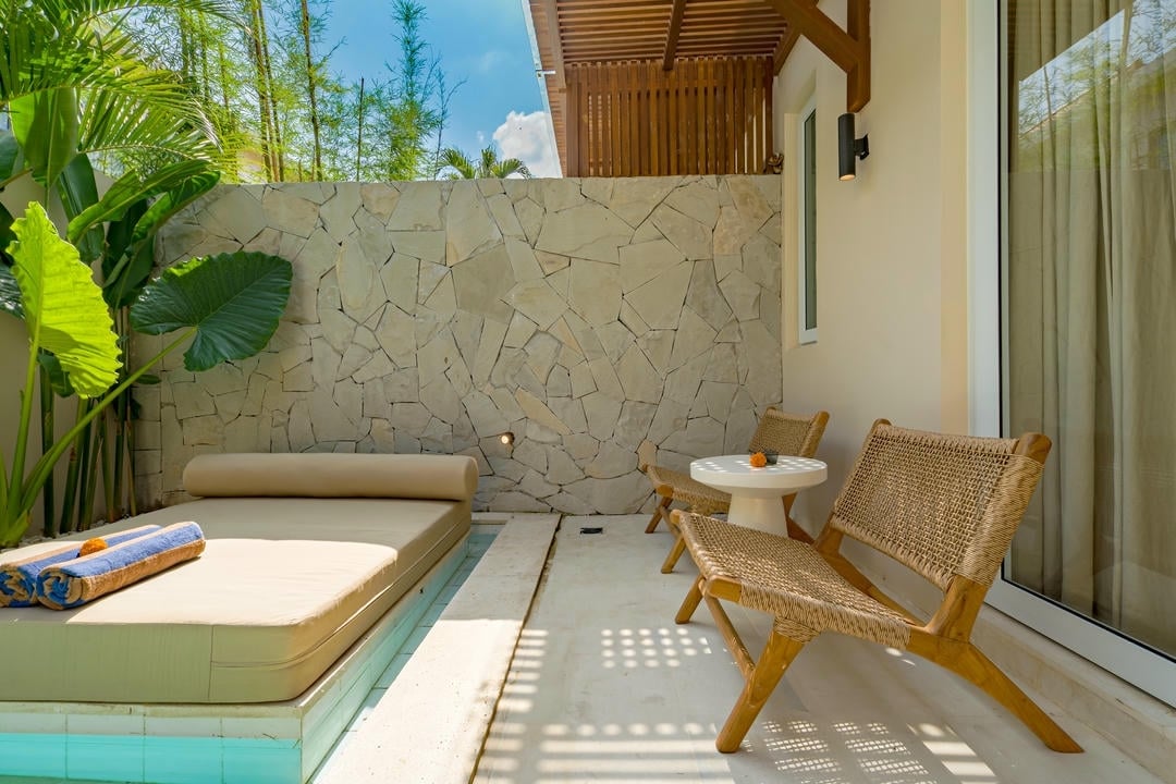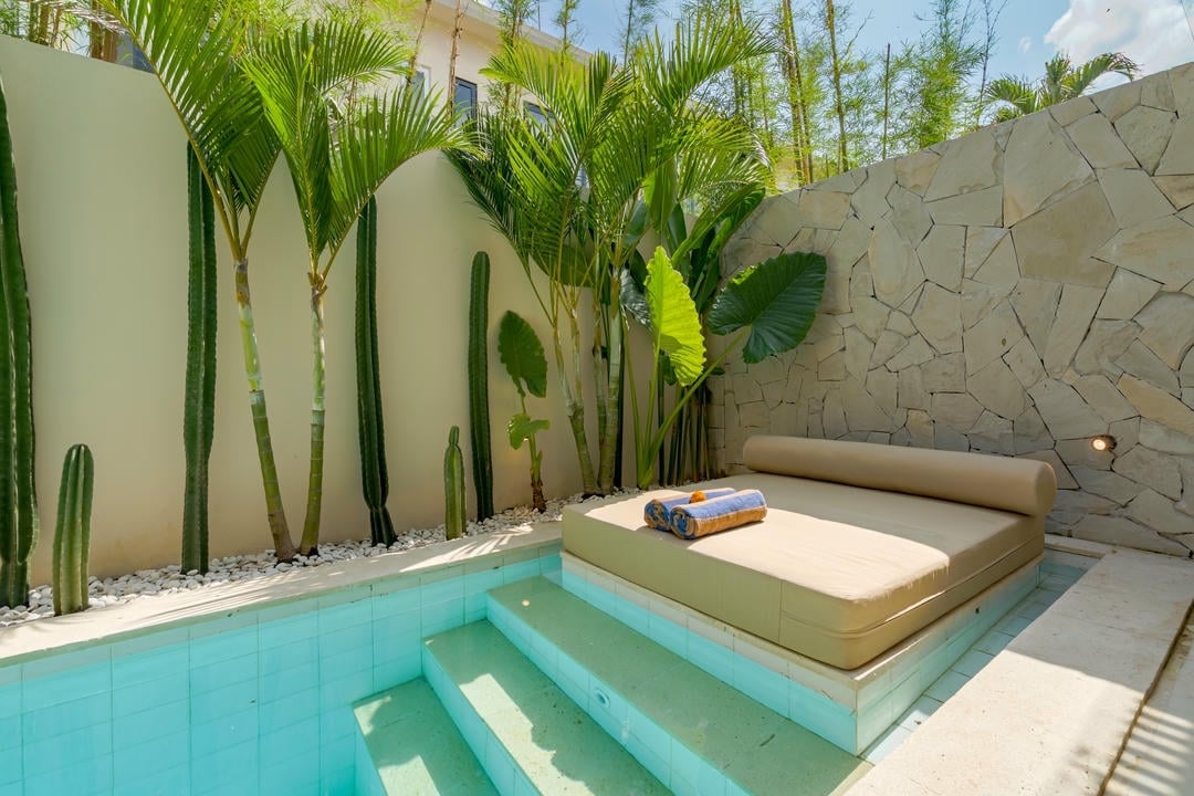 Outside, enjoy a private pool with sunbeds and a cozy lounge area, perfect for relaxing.