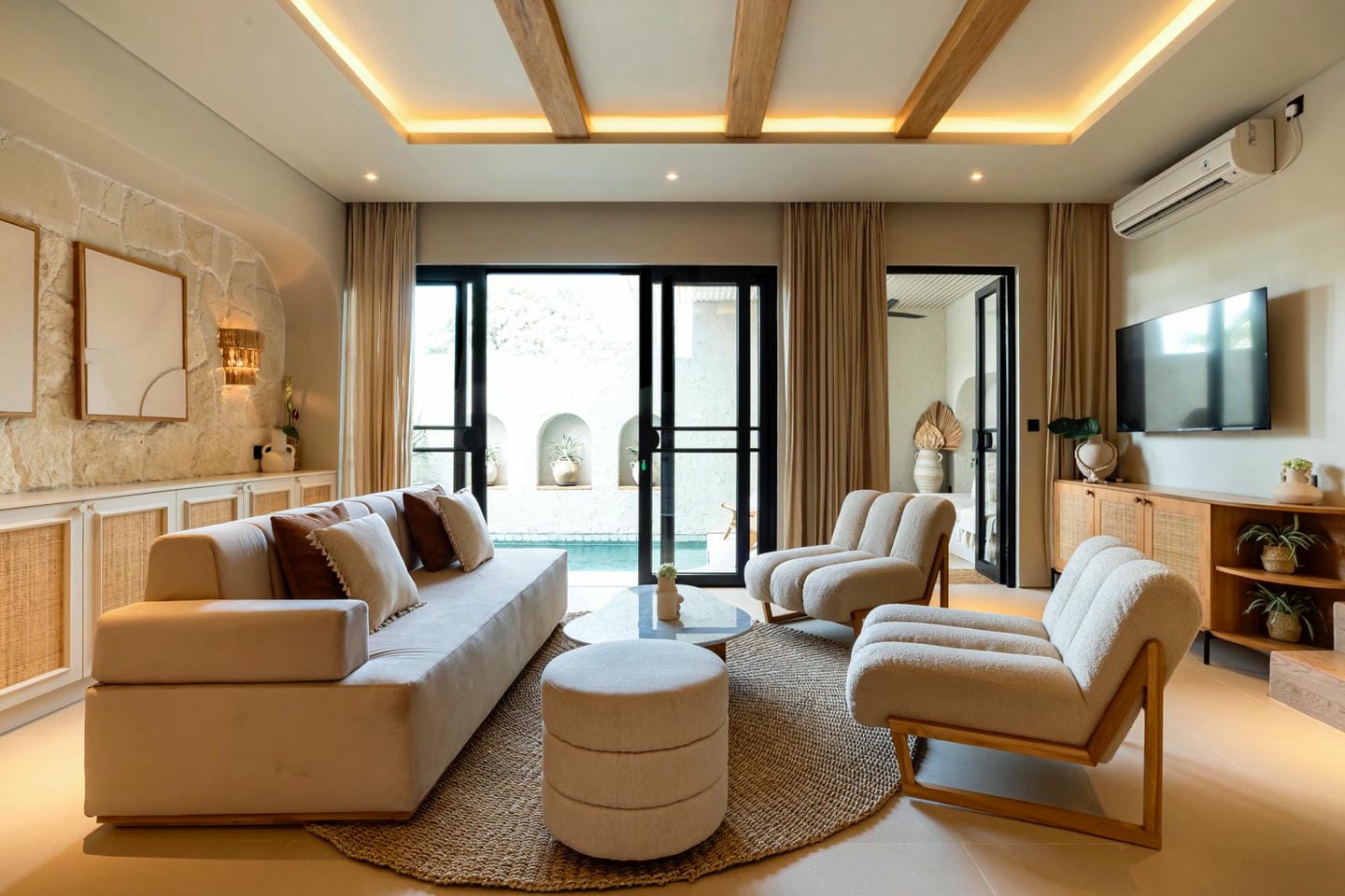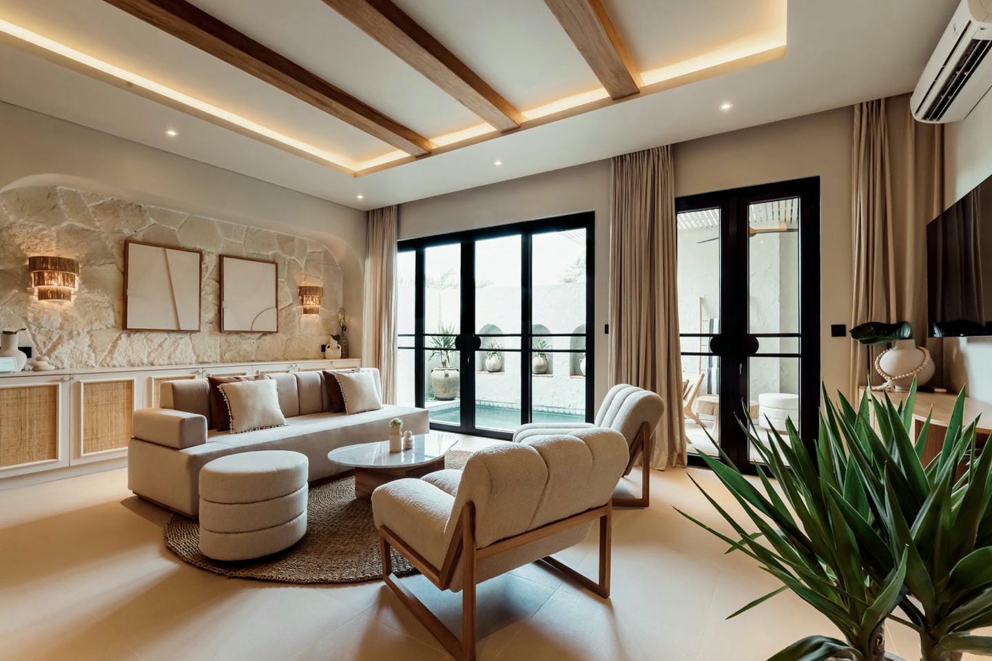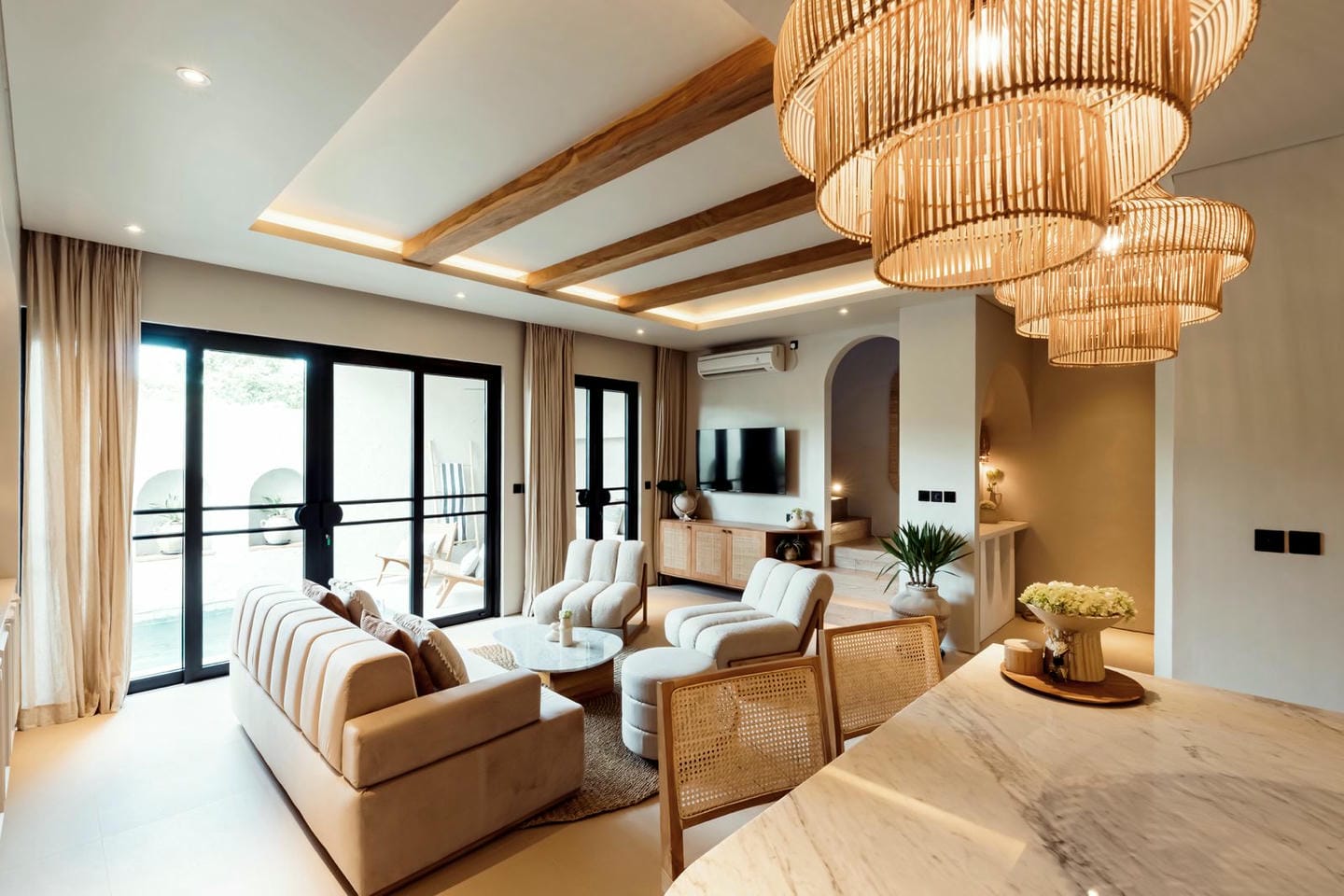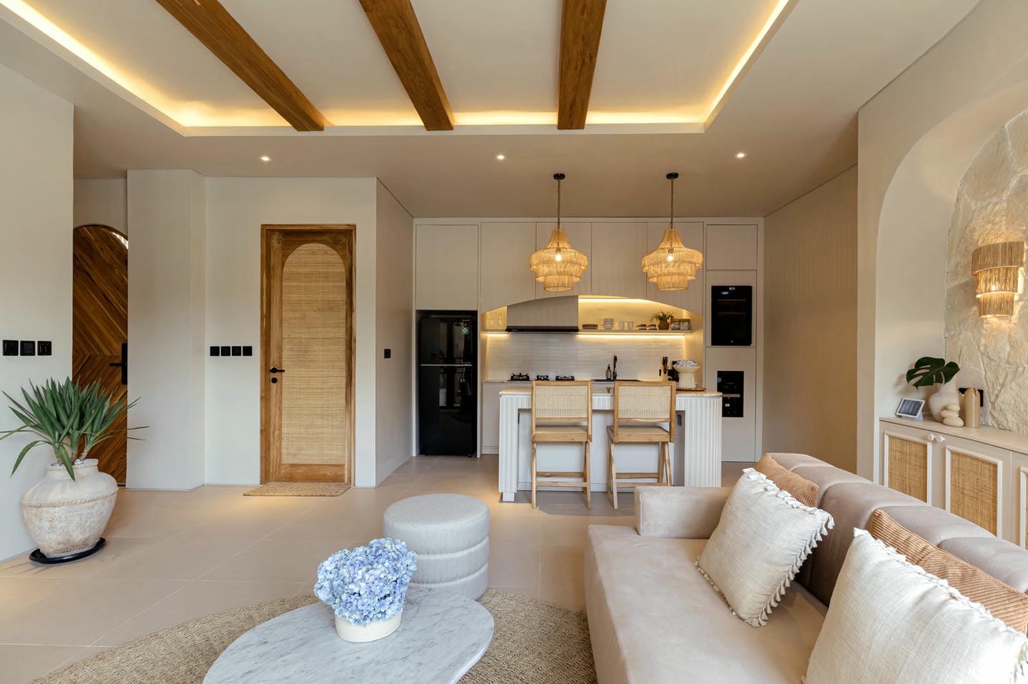 The living area is designed as a spacious and elegant open-plan space with a warm tropical ambiance. High ceilings with wooden beam accents and soft indirect lighting create a bright and inviting atmosphere. The space is styled in soft neutral tones with natural textures throughout. Large glass doors allow abundant natural light to fill the room while maintaining comfort and privacy. The layout flows seamlessly into the dining area and fully equipped kitchen, and is complemented by one elegant bedroom with an ensuite bathroom, making it ideal for both everyday living and entertaining.