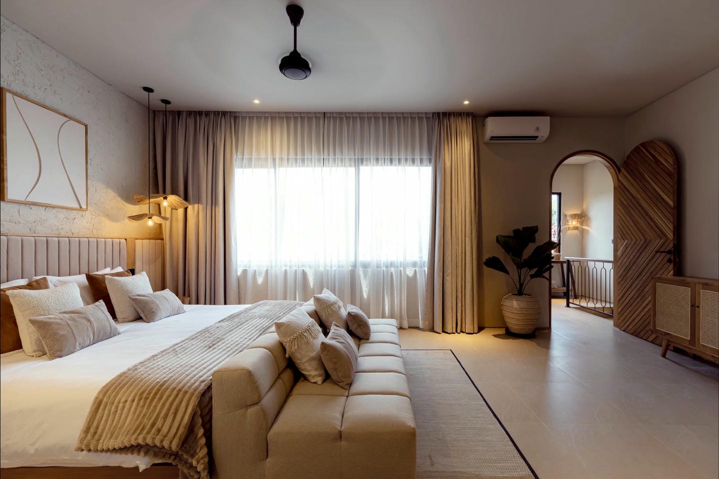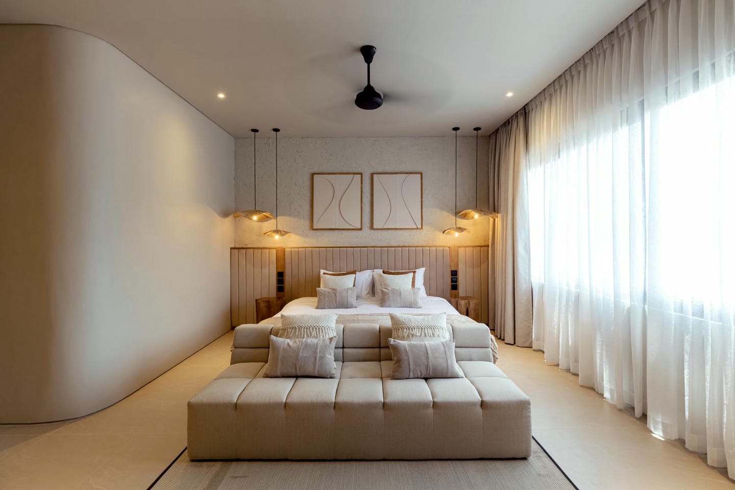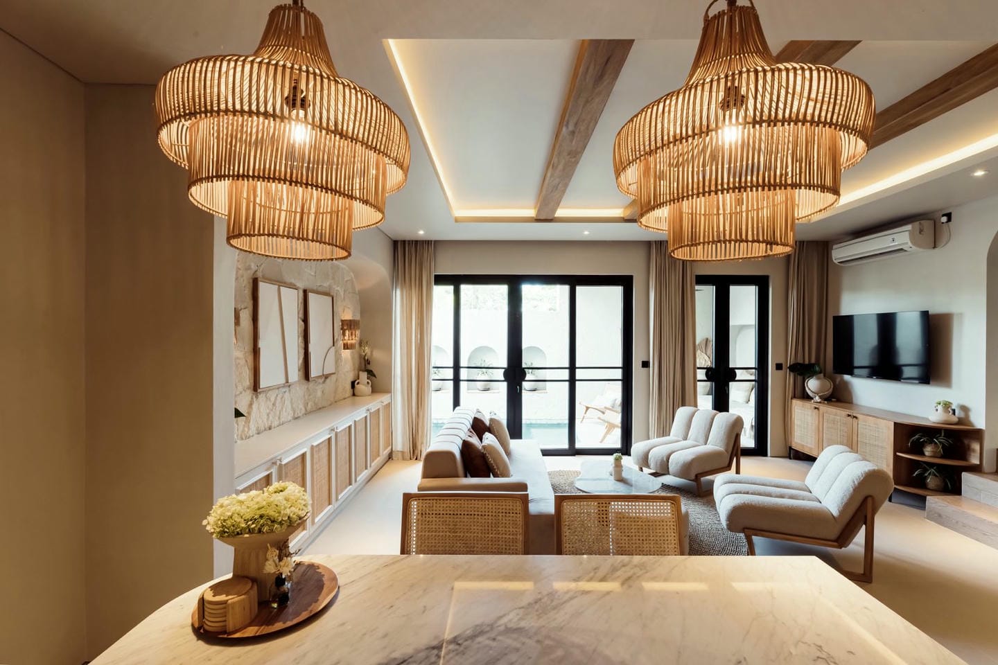 The living area is designed as a spacious and elegant open-plan space with a warm tropical ambiance. High ceilings with wooden beam accents and soft indirect lighting create a bright and inviting atmosphere. The space is styled in soft neutral tones with natural textures throughout. Large glass doors allow abundant natural light to fill the room while maintaining comfort and privacy. The layout flows seamlessly into the dining area and fully equipped kitchen, and is complemented by one elegant bedroom with an ensuite bathroom, making it ideal for both everyday living and entertaining.