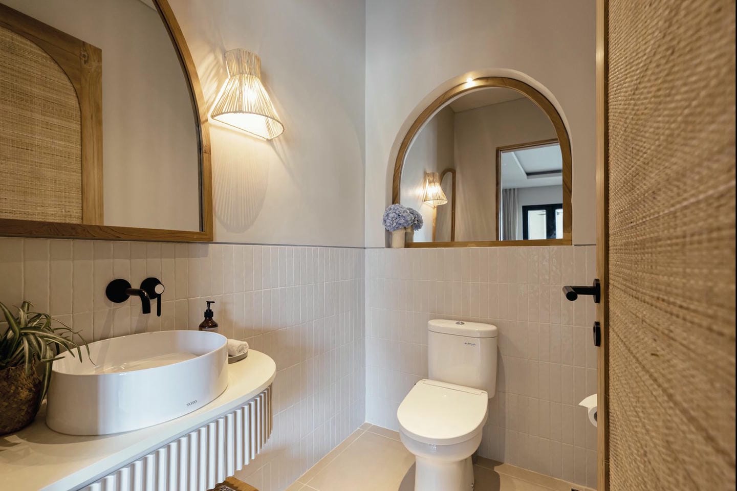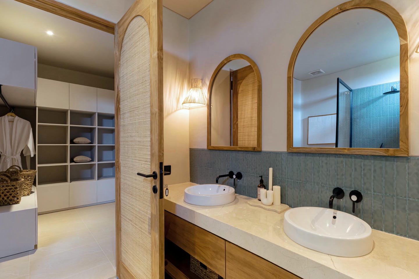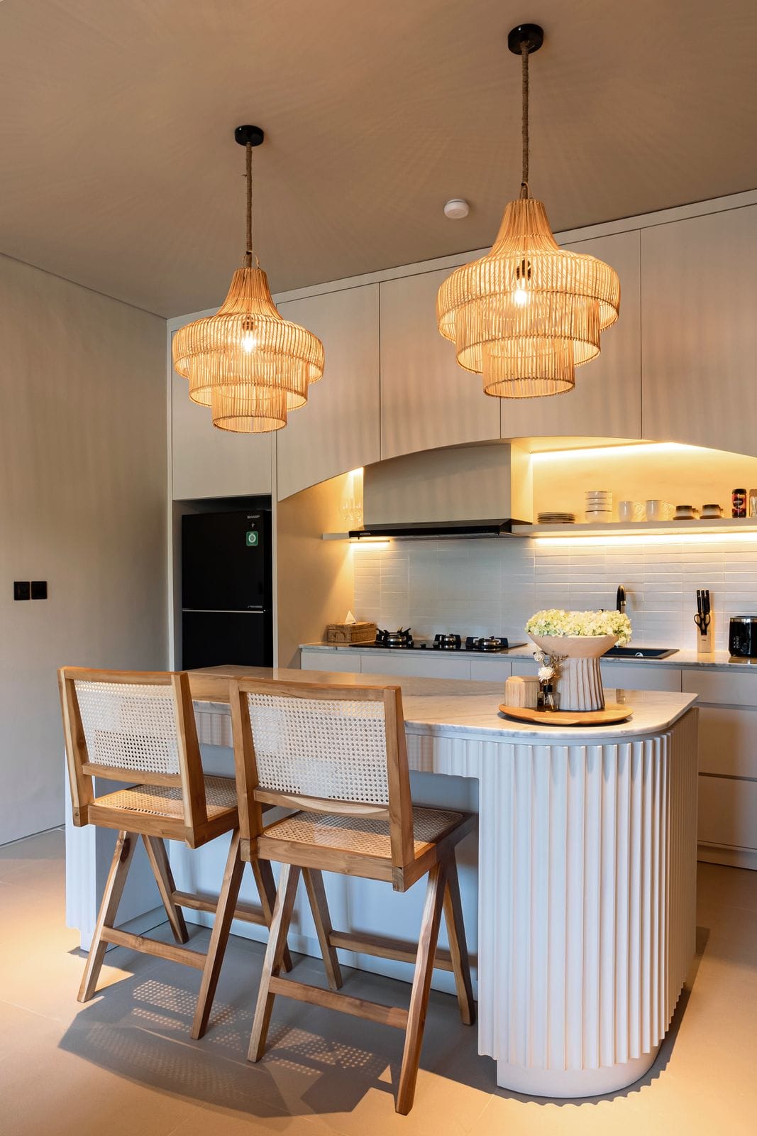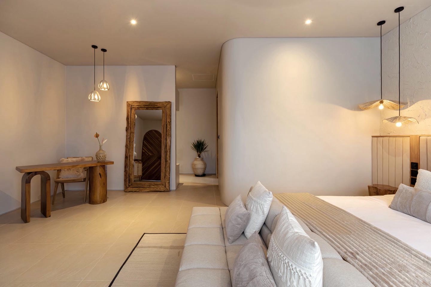 The living area is designed as a spacious and elegant open-plan space with a warm tropical ambiance. High ceilings with wooden beam accents and soft indirect lighting create a bright and inviting atmosphere. The space is styled in soft neutral tones with natural textures throughout. Large glass doors allow abundant natural light to fill the room while maintaining comfort and privacy. The layout flows seamlessly into the dining area and fully equipped kitchen, and is complemented by one elegant bedroom with an ensuite bathroom, making it ideal for both everyday living and entertaining.