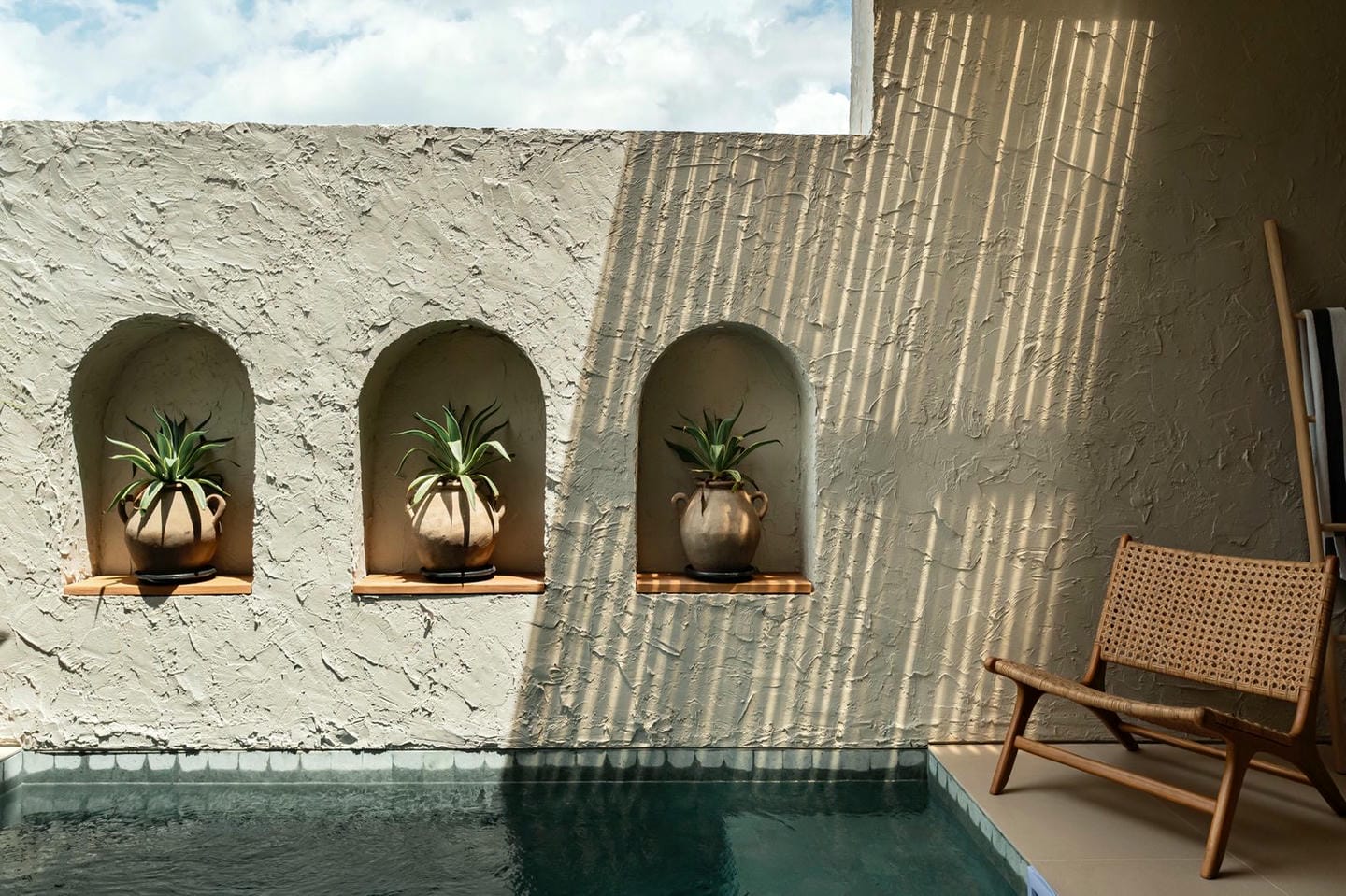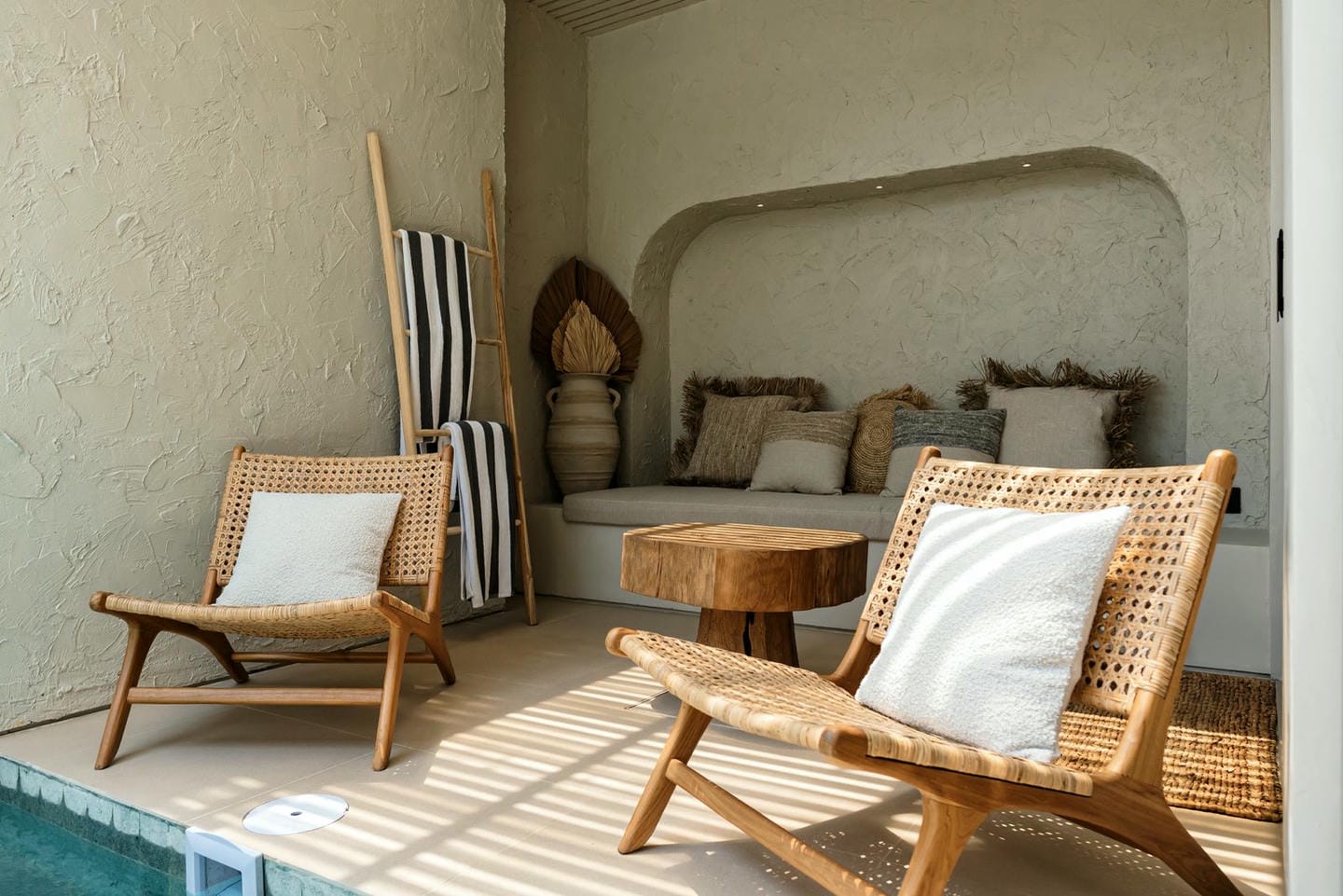 The outdoor living area offers a beautiful private retreat centered around the swimming pool. This space is designed for relaxation, featuring a comfortable lounge area, sun chairs, and a cozy seating corner framed by tropical elements and natural textures. The covered terrace provides shade while still allowing fresh air to circulate, creating a perfect spot to unwind, enjoy the pool, or spend time with guests in a serene and private atmosphere.