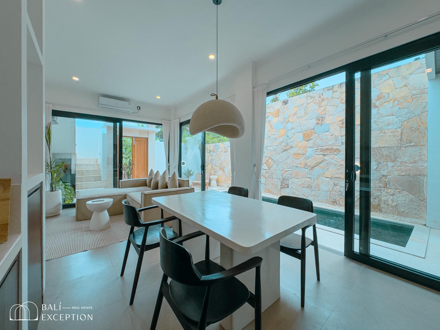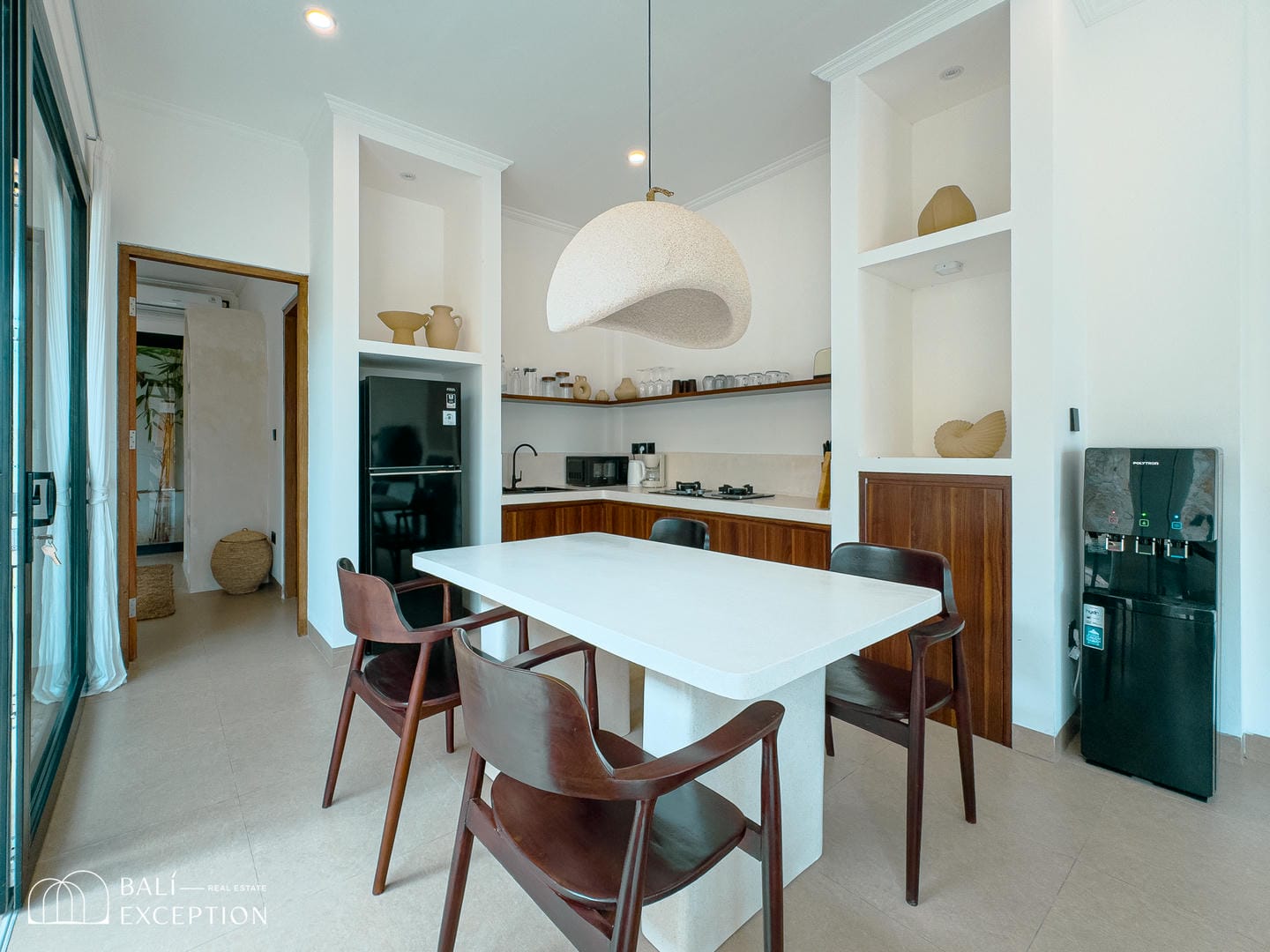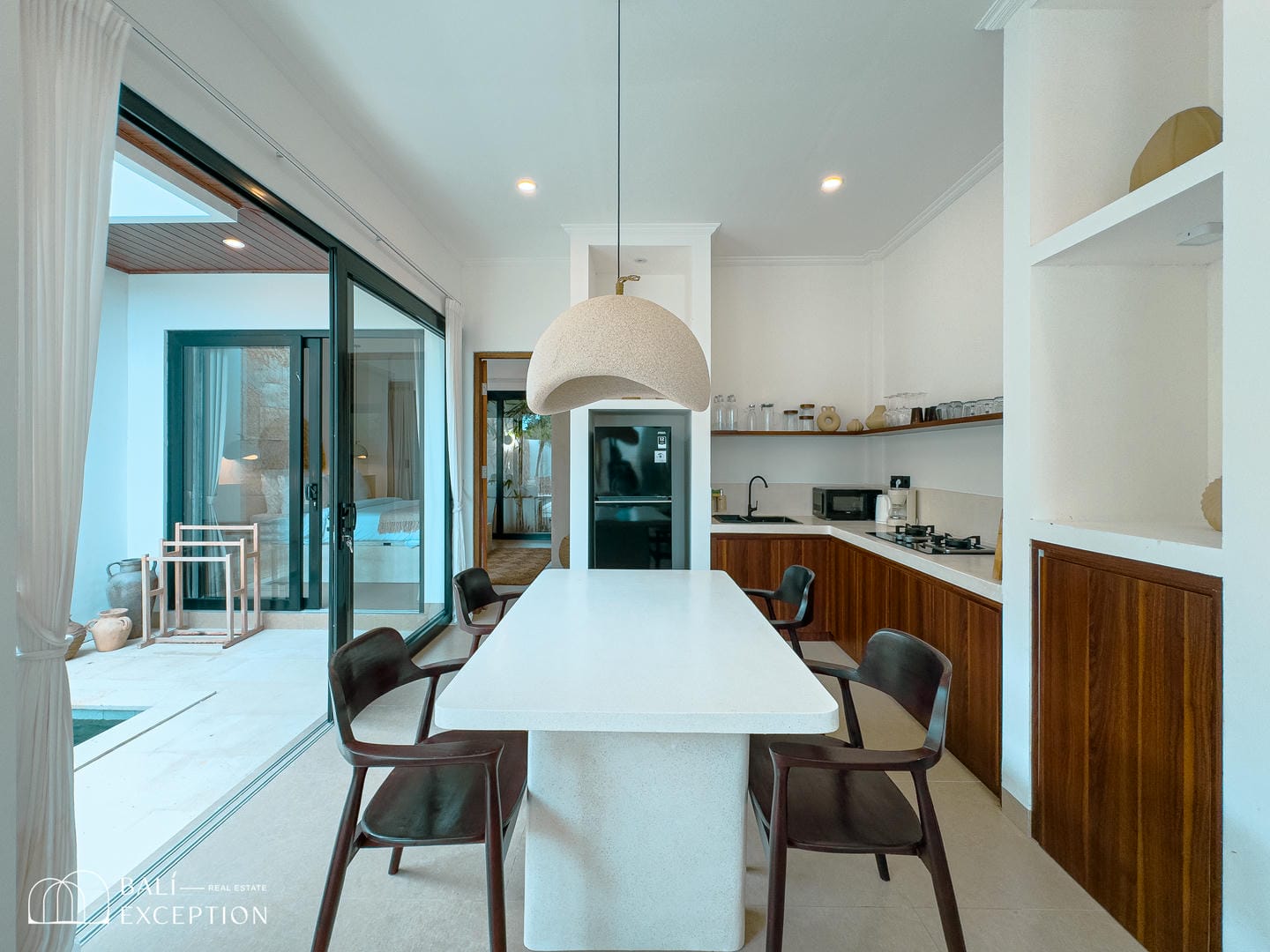 The villa features one spacious bedroom with an ensuite bathroom, including an outdoor-style shower that enhances the tropical living experience. Fully furnished and thoughtfully designed, the interiors combine modern tropical elements with warm finishes. The open living and dining area flows seamlessly into the kitchen.