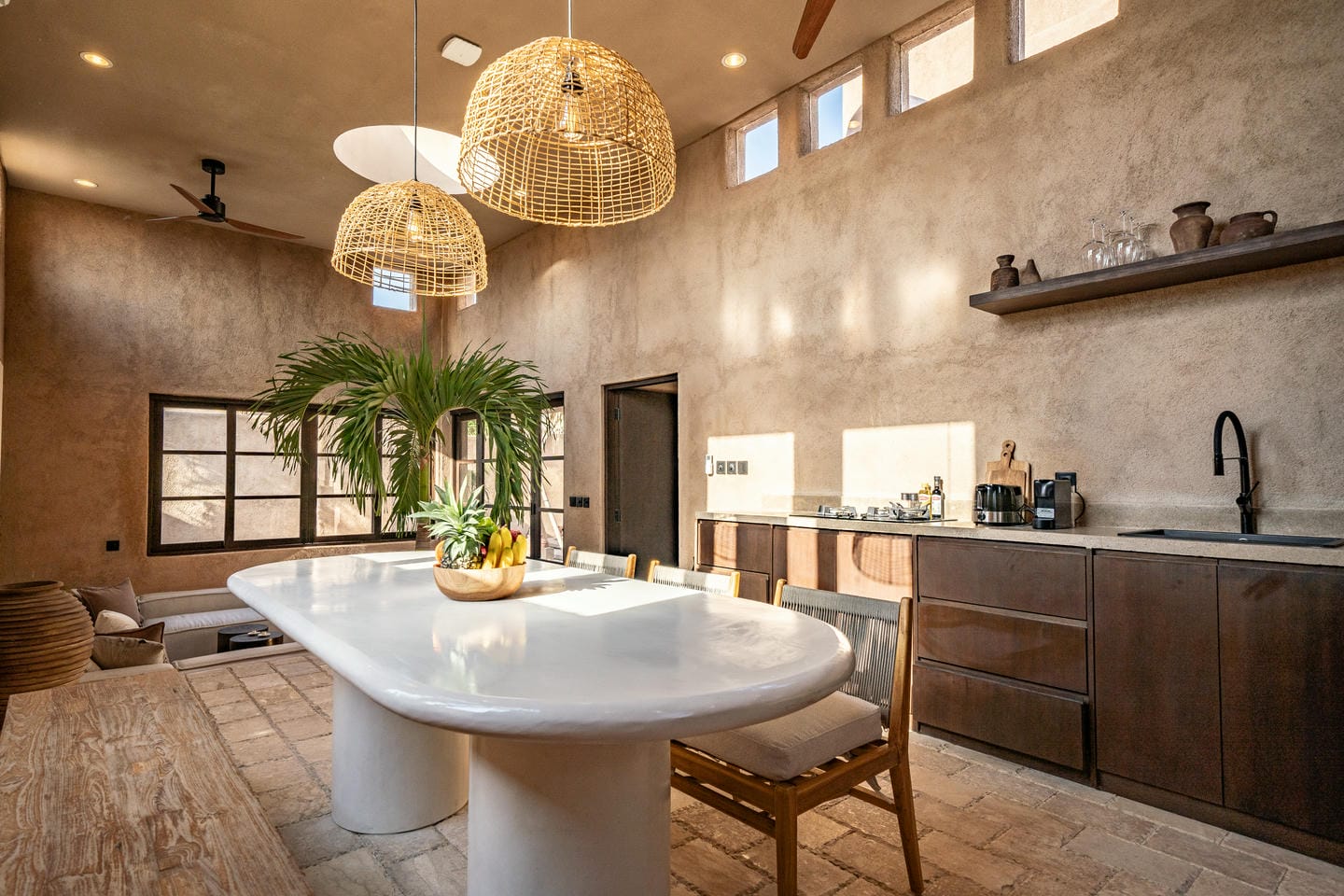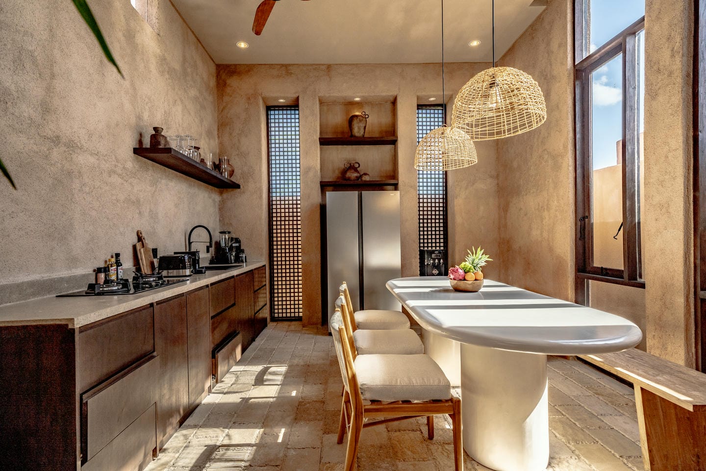 The villa features three bedrooms with ensuite bathrooms, each designed with warm wooden accents and calming neutral tones for a restful retreat. The fully furnished enclosed living area offers a cozy, stylish space overlooking the pool, while the modern kitchen and dining area come fully equipped, providing everything needed for comfortable everyday living and effortless entertaining.