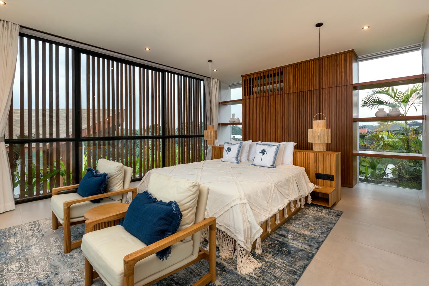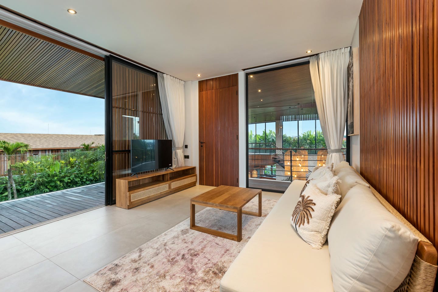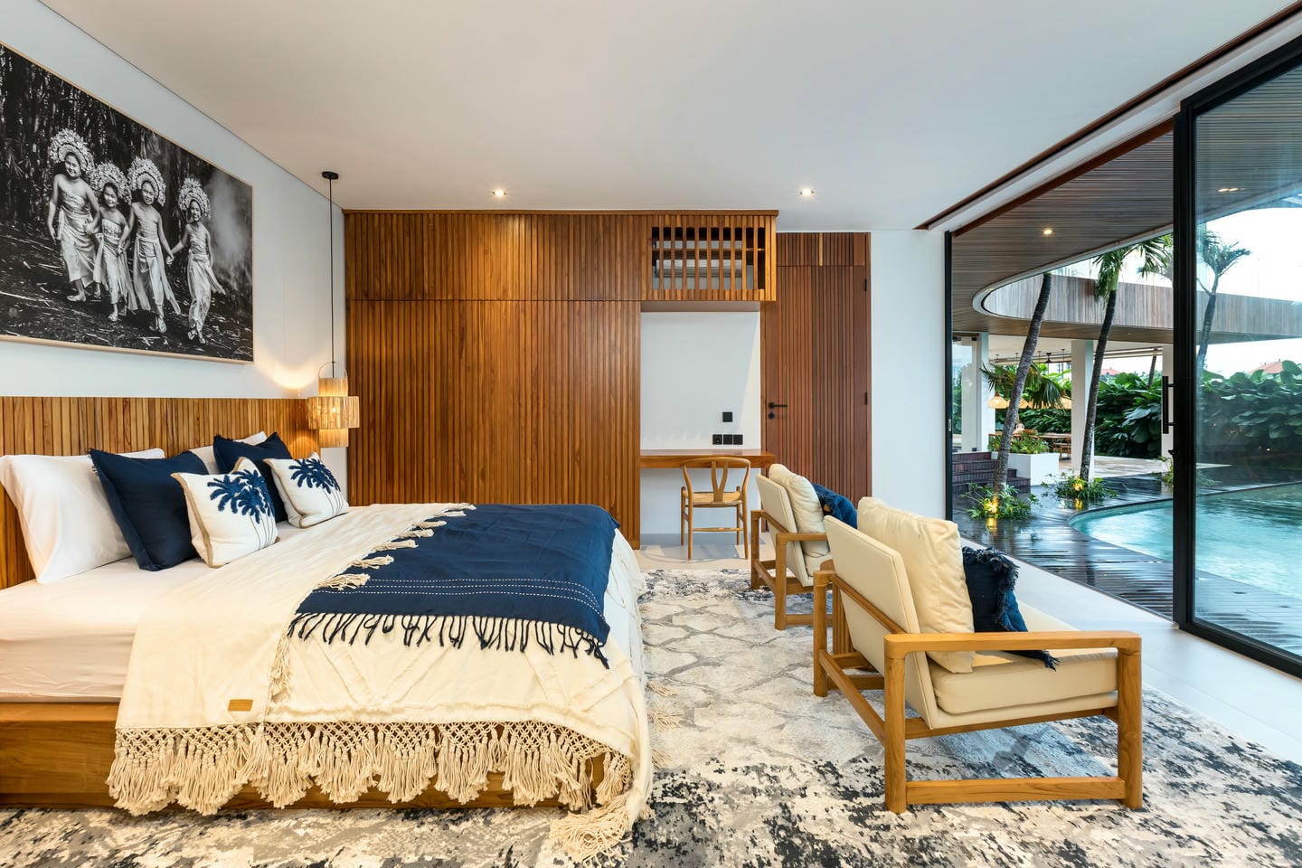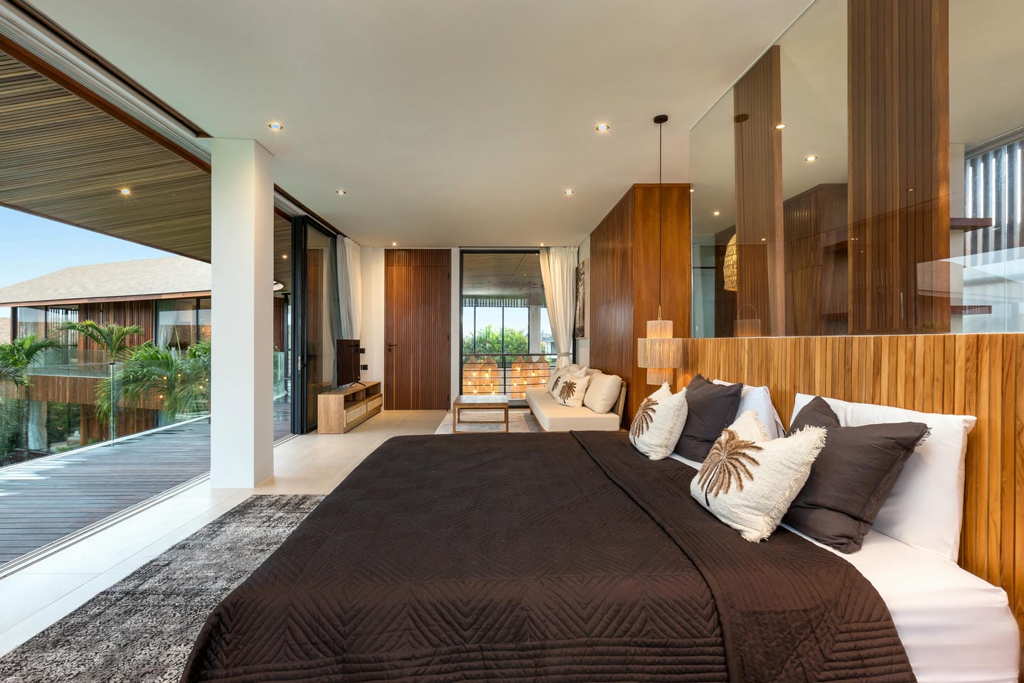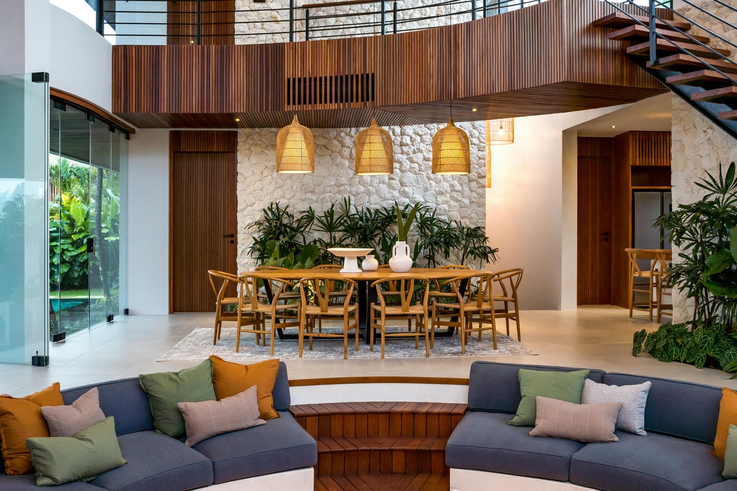 Designed with a refined modern-tropical aesthetic, the villa harmoniously blends warm natural woods, elegant stone textures, and expansive floor-to-ceiling glass. Natural light floods the interiors, enhancing the sense of space and effortless sophistication.