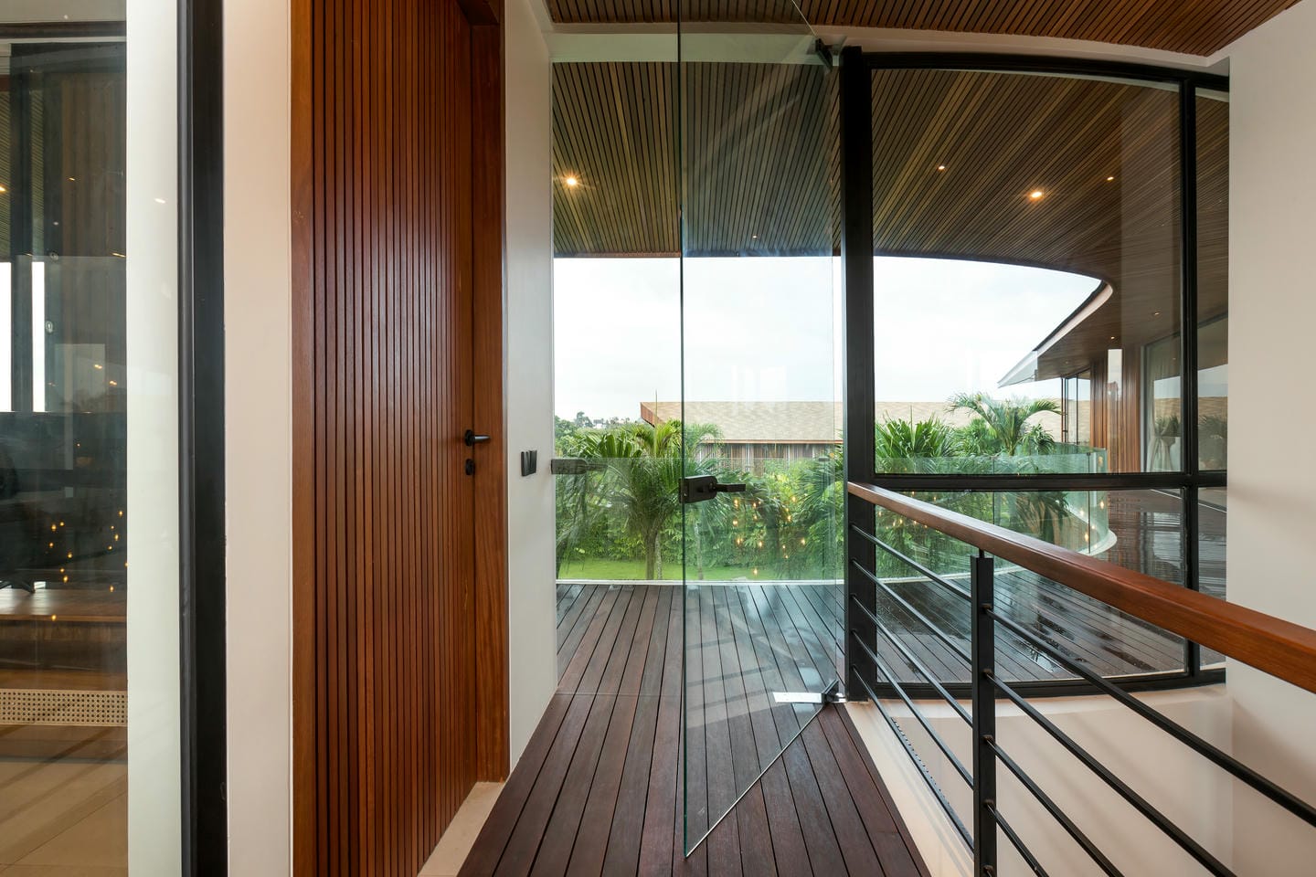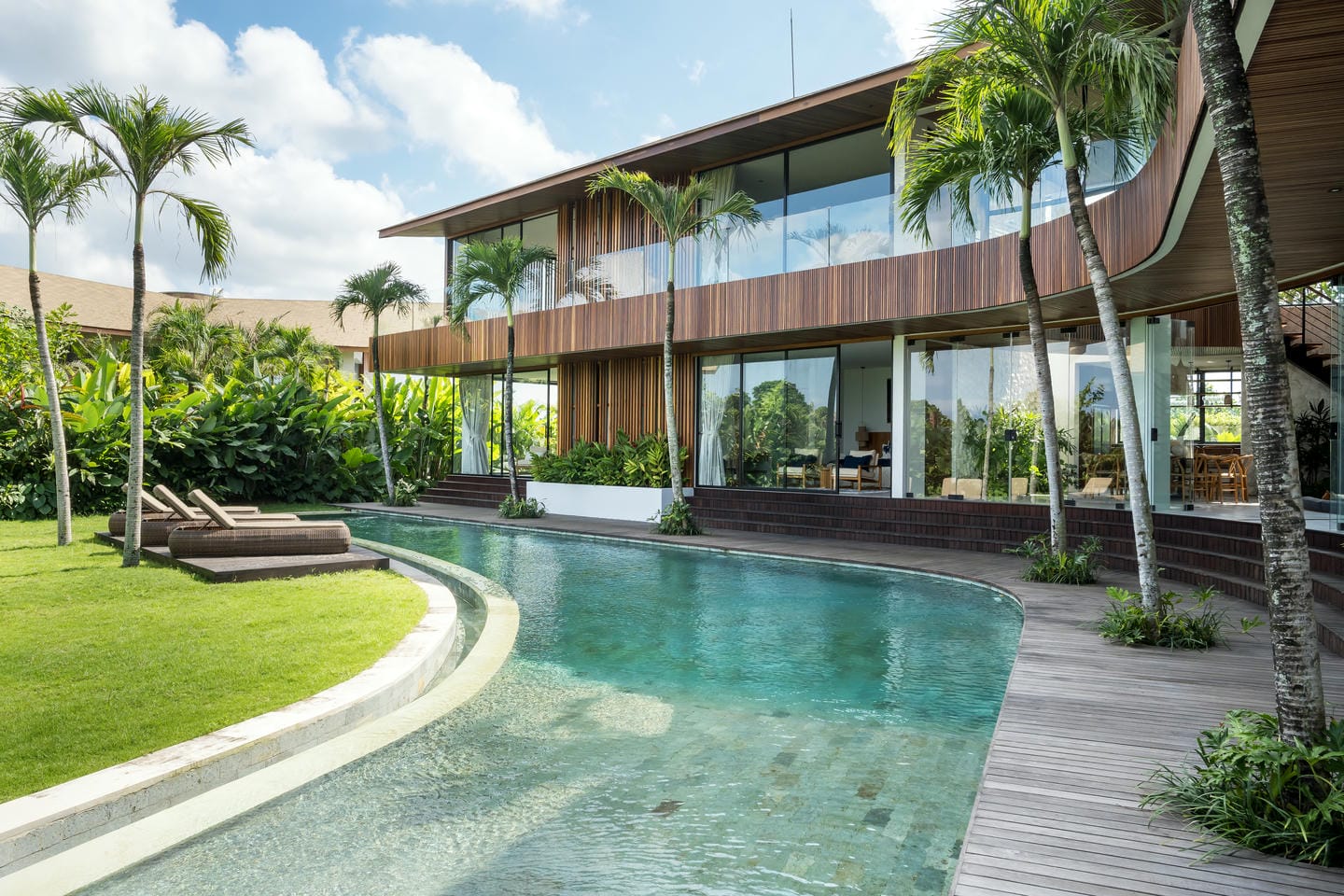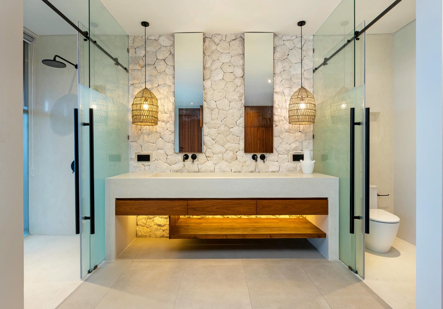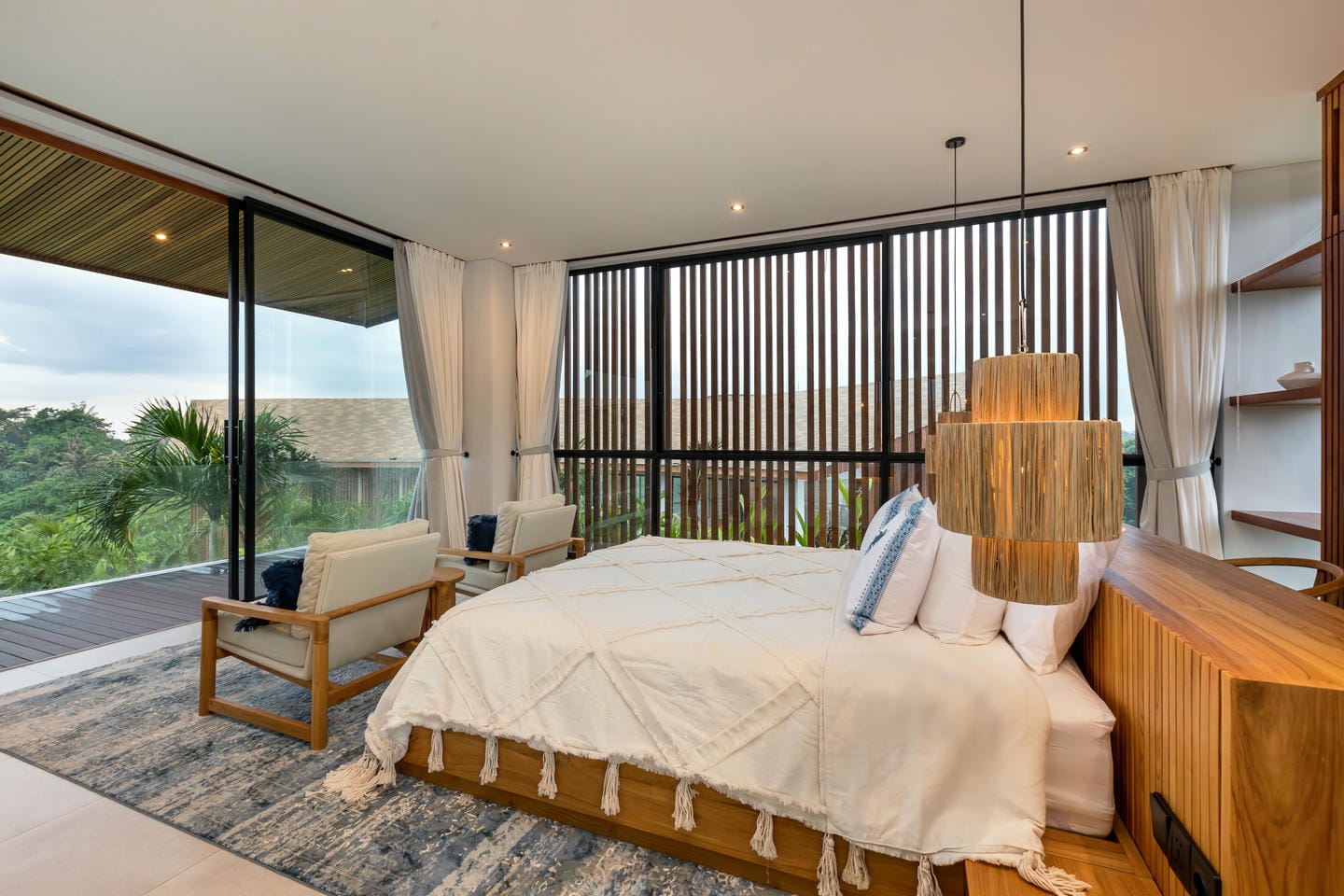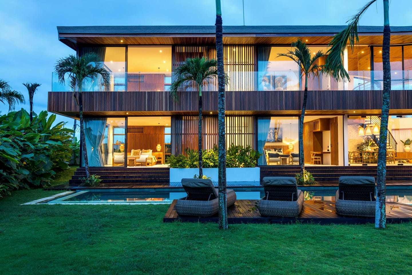 Designed with a refined modern-tropical aesthetic, the villa harmoniously blends warm natural woods, elegant stone textures, and expansive floor-to-ceiling glass. Natural light floods the interiors, enhancing the sense of space and effortless sophistication.