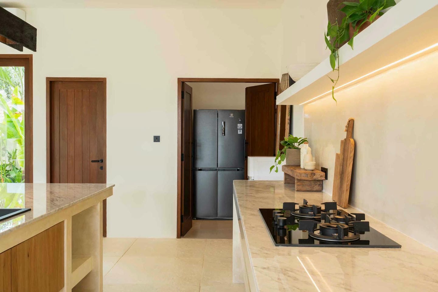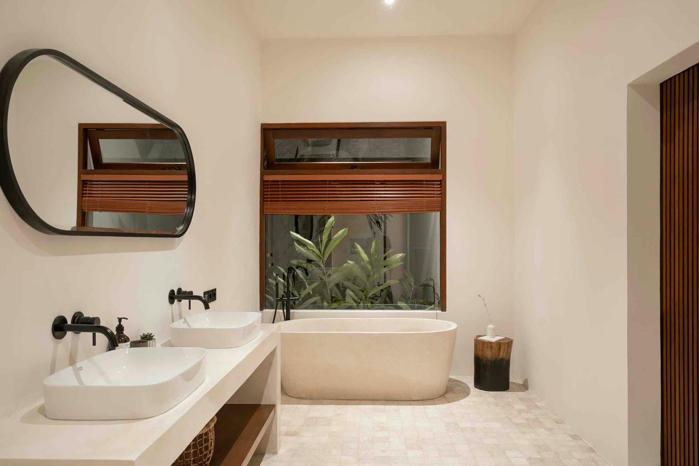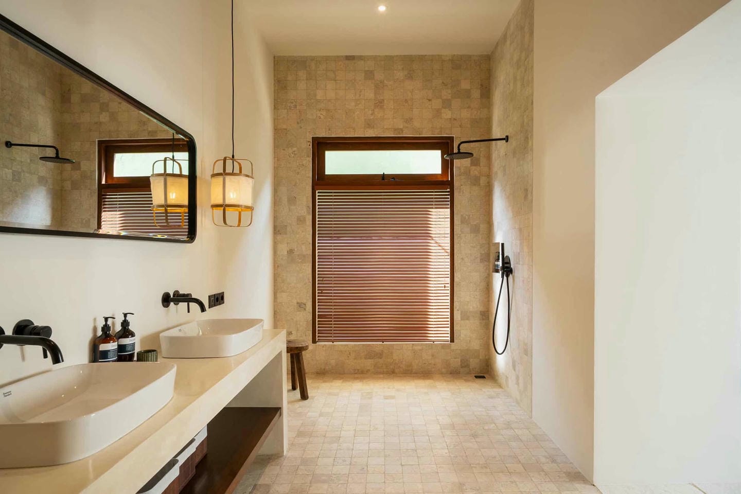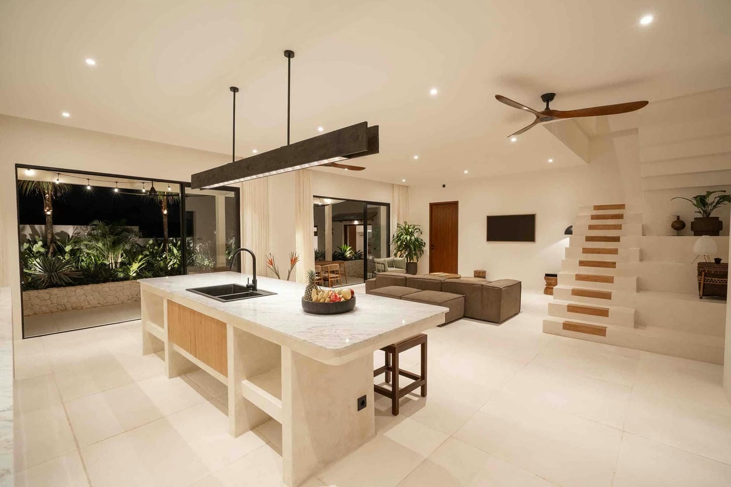 A beautifully crafted villa where Japandi design meets the serenity of island living, this stunning residence offers a seamless blend of Scandinavian functionality and Japanese warmth. The open-plan living area is filled with soft natural light, enhanced by high ceilings and clean, minimal lines, while cozy yet refined interiors feature comfortable seating, warm wood accents, and floor to ceiling windows that open onto lush tropical greenery. At the heart of the villa is an expansive kitchen and dining area designed for effortless gatherings. Each bedroom is tastefully appointed with its own en-suite bathroom, complemented by an additional guest powder room off the living area. One bedroom features a bathtub for long, relaxing soaks, and another can be arranged as either twin beds or a double, offering flexibility for families or groups of friends traveling together offering a total of six bedrooms throughout the villa.