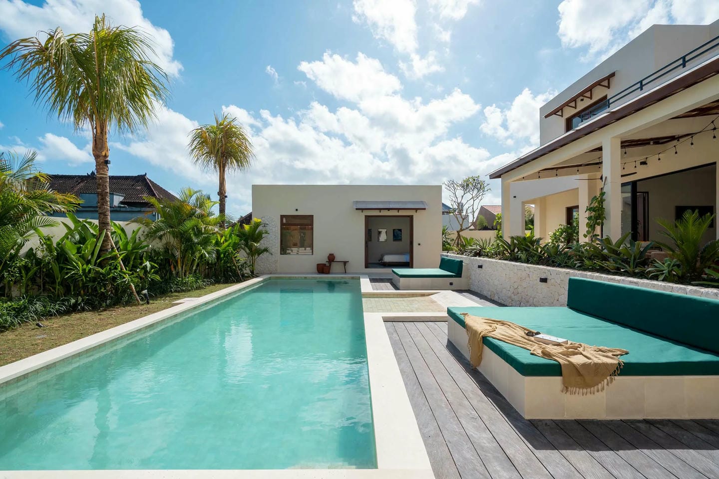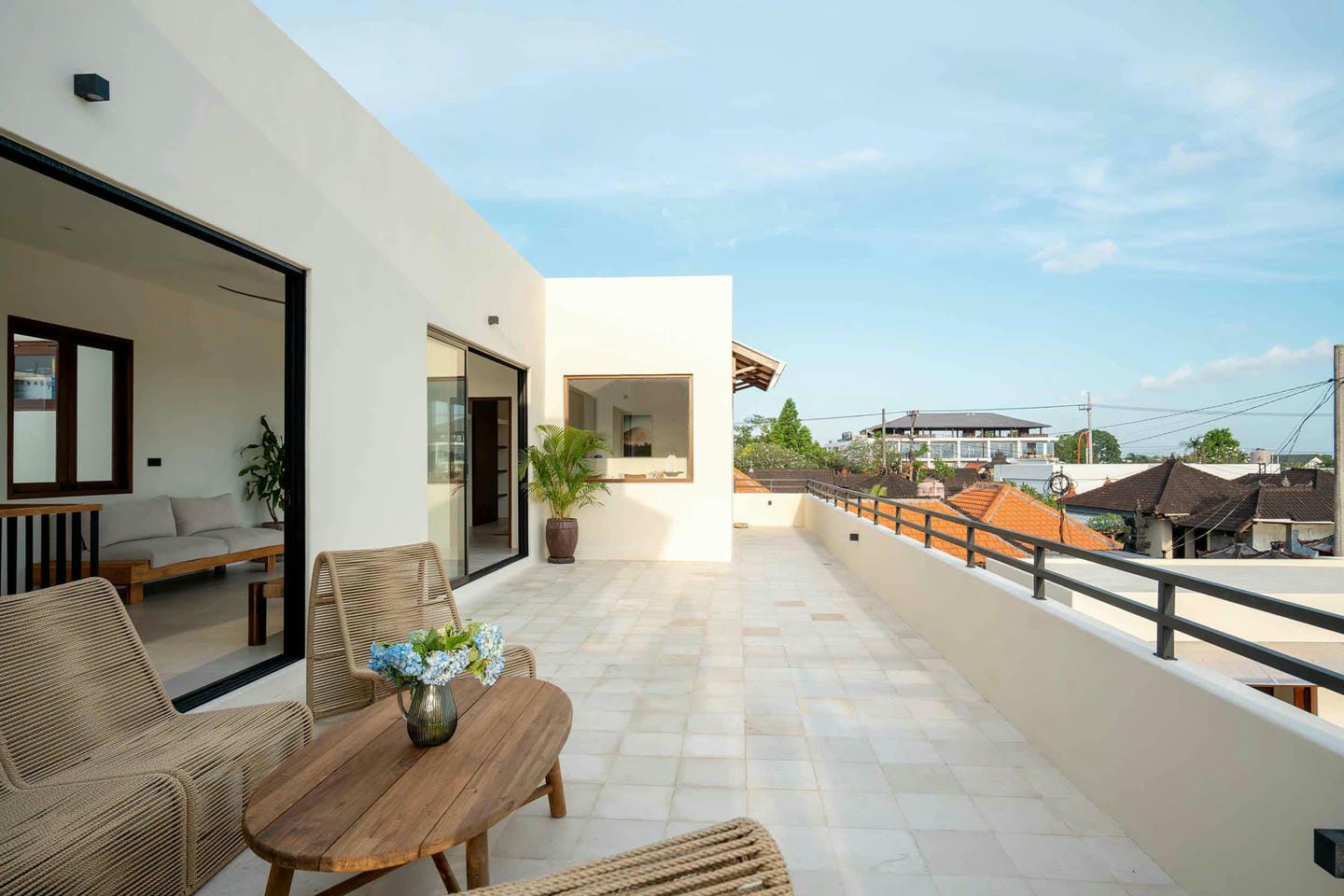 The outdoor area features a generously sized private pool surrounded by lush tropical greenery, complete with a spacious sunbathing zone perfect for relaxing with a book or a refreshing drink. A large outdoor dining table sets the scene for easygoing breakfasts, long lunches, or intimate dinners under the open sky, while the rooftop terrace offers a breezy lounge and yoga space ideal for morning stretches or sunset gatherings.