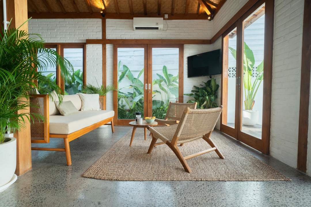 This 3-bedroom villa, each with its own ensuite bathroom, features an enclosed living room with high ceiling windows, creating a bright and airy atmosphere.