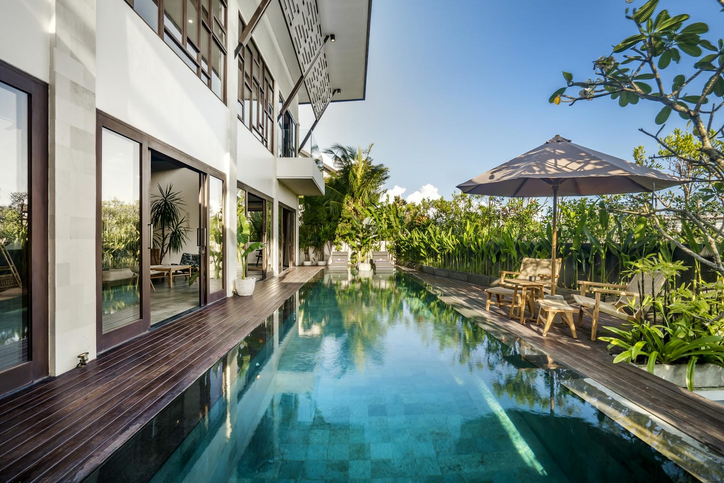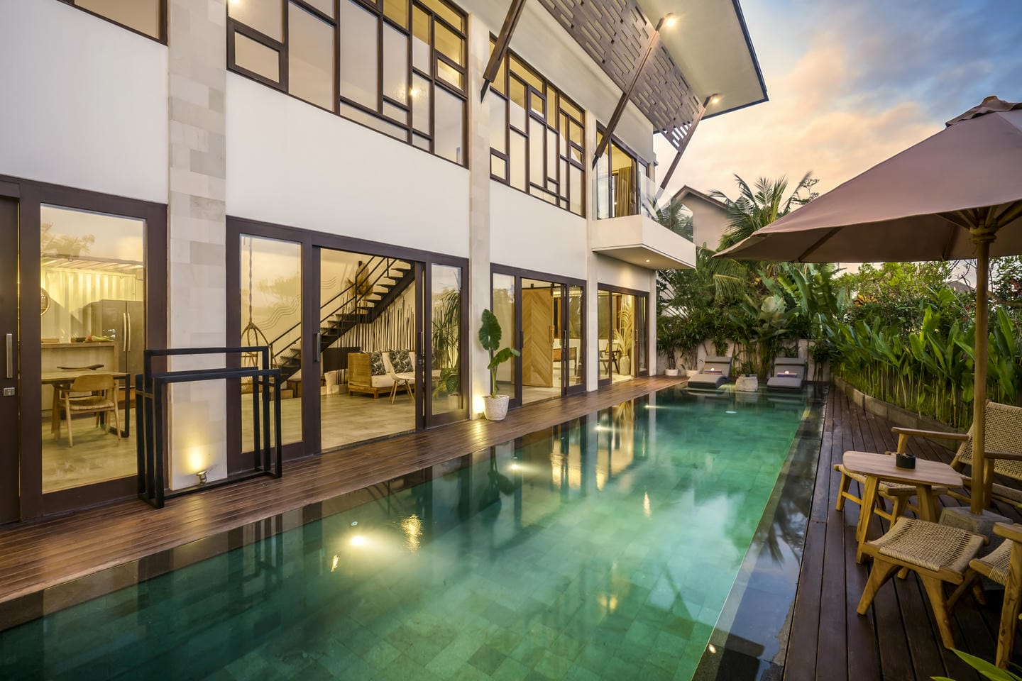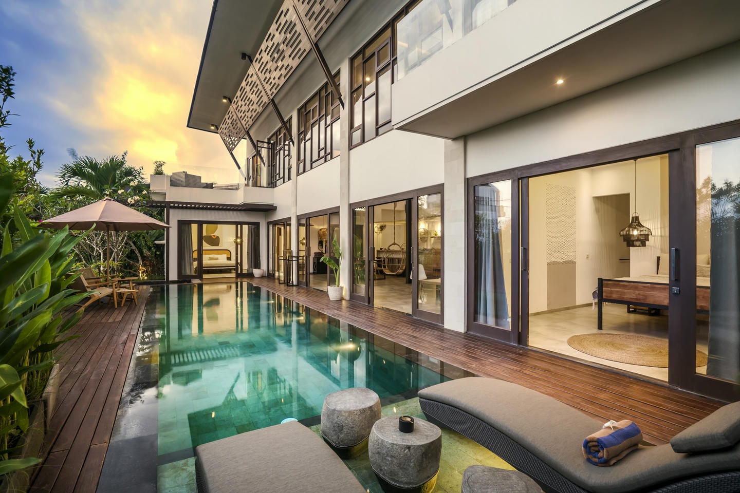 Designed for true tropical living, the villa’s outdoor area centers around a refreshing private pool framed by lush landscaping. A wooden deck on the second floor, complete with comfortable seating, provides the perfect setting for sunbathing.